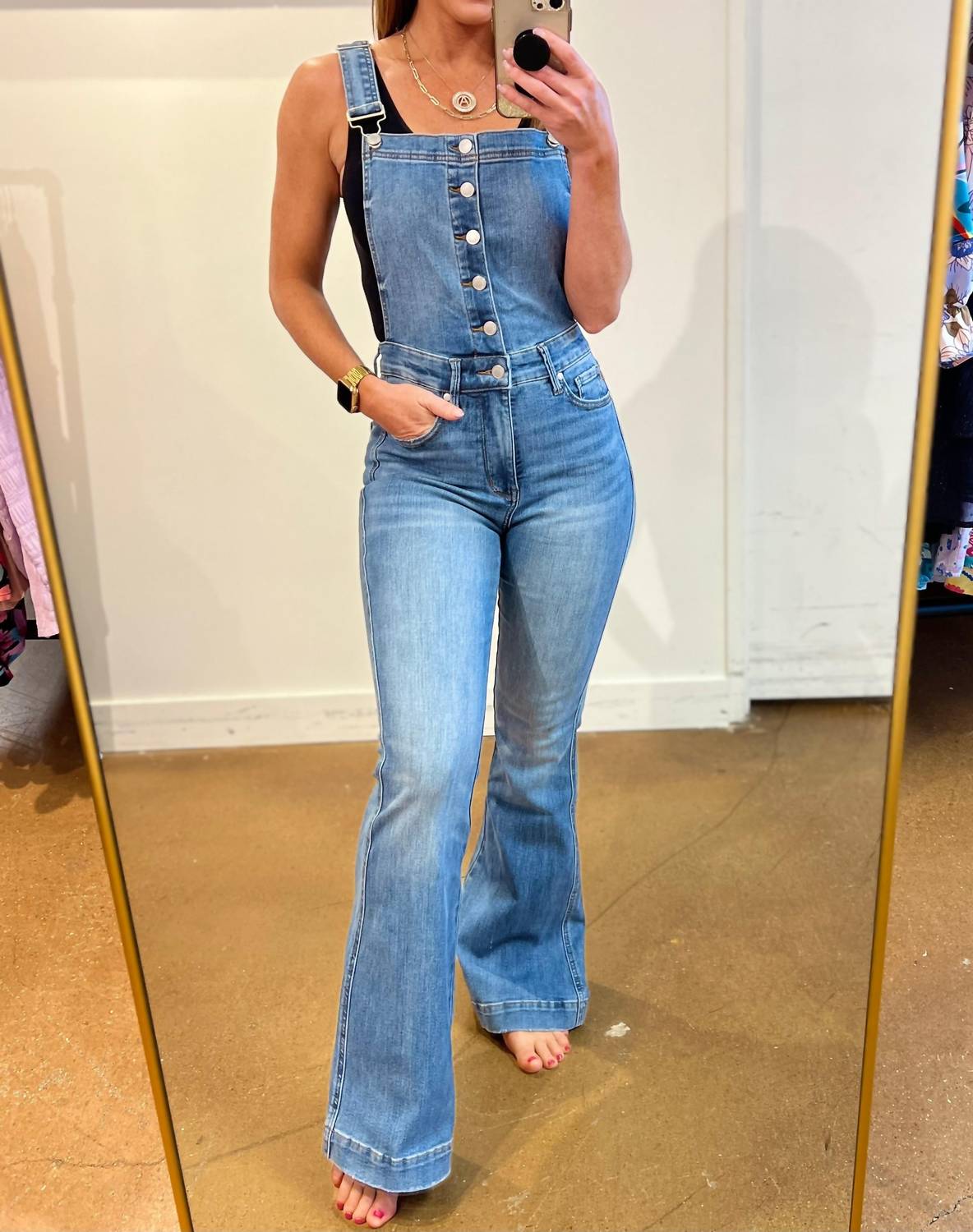 Throw it on and go! Introducing the Judy Blue Tummy Control Flare Overalls in a trendy medium wash, perfect for streetwear-inspired looks. These overalls feature a high-rise fit with a flared leg and are crafted from a comfortable blend of 91% cotton, 7% polyester, and 2% spandex. Designed with adjustable suspender straps, they provide flattering tummy control technology and a relaxed fit, all with a convenient snap closure. Care is easy with machine wash and tumble dry instructions, making these overalls a versatile addition to your wardrobe. Available in sizes S to 3XL with specific waist, hip, and length measurements to ensure a perfect fit.