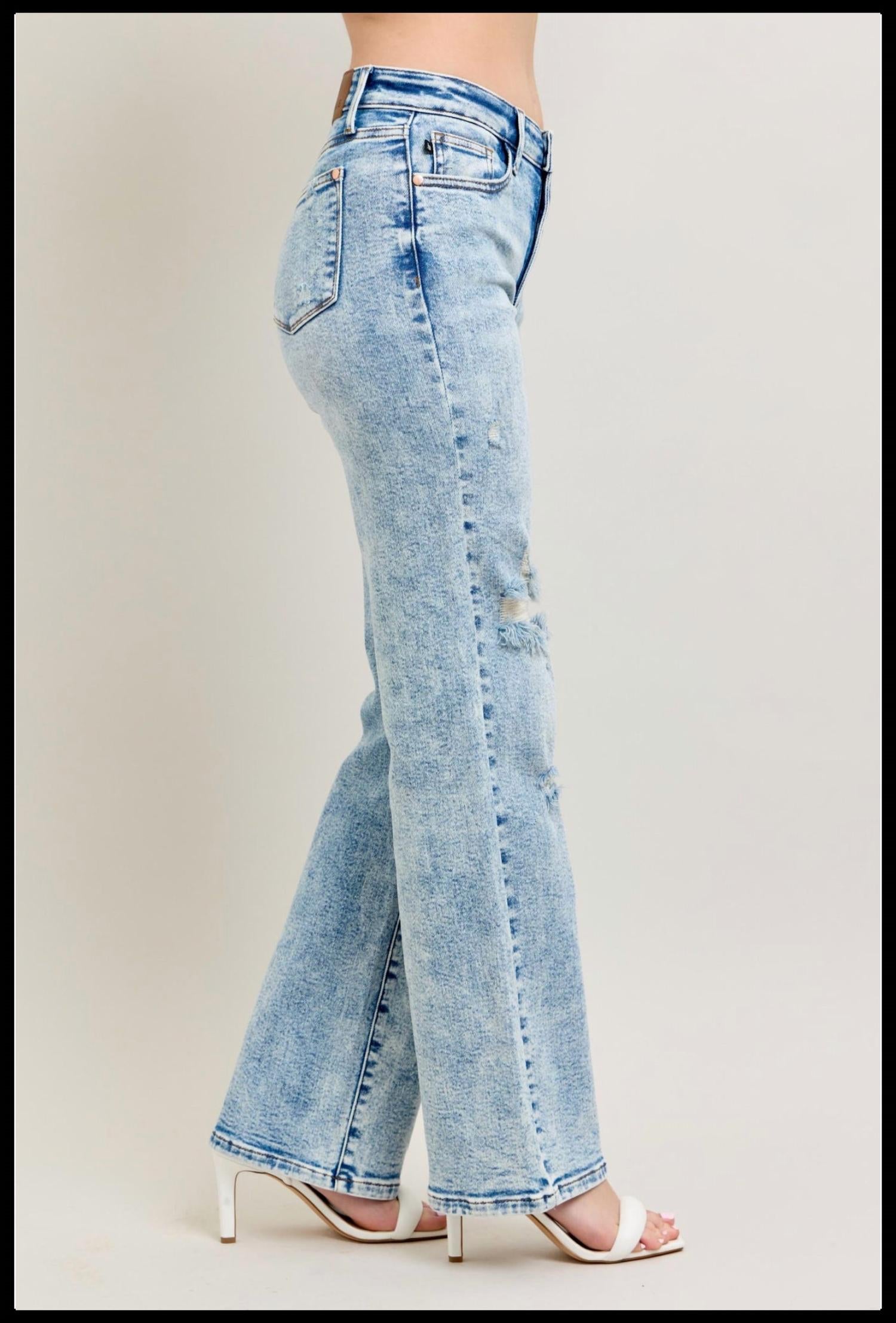 Pair these straight leg jeans with flats, sandals or even heels! You can't go wrong. Featuring a high-waisted fit with a 10 3/8" rise and a 32" inseam, they offer a timeless straight-leg silhouette. Crafted in a soft, stretchy blend of 94% cotton, 5% polyester, and 1% spandex, they provide the perfect balance of structure and flexibility. Finished in a clean, solid wash and equipped with functional pockets, they’re a versatile staple for any wardrobe.
