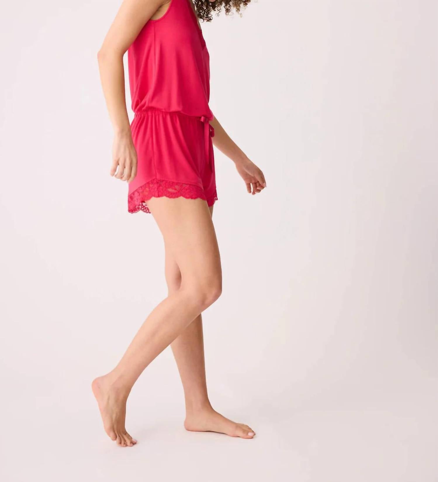 It doesn't take much for this one piece to look effortlessly cool. Add some statement jewelry to dress it up, or throw on some sneakers for a more casual vibe. Experience comfort and style with the PJ Salvage Day Dreams Modal Romper in a vibrant ruby red. This women's romper features delicate lace detailing on the front and back, accompanied by an adjustable tie waist for a feminine flair. Crafted from 95% Modal and 5% Elastane jersey, it's a perfect choice for a cozy lounge or a fun night in. Care instructions include machine washing cold, avoid bleaching, and tumble drying on low.
