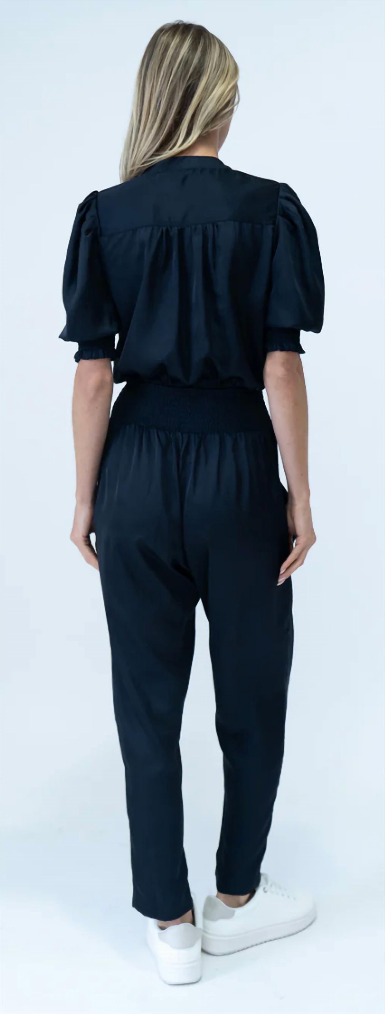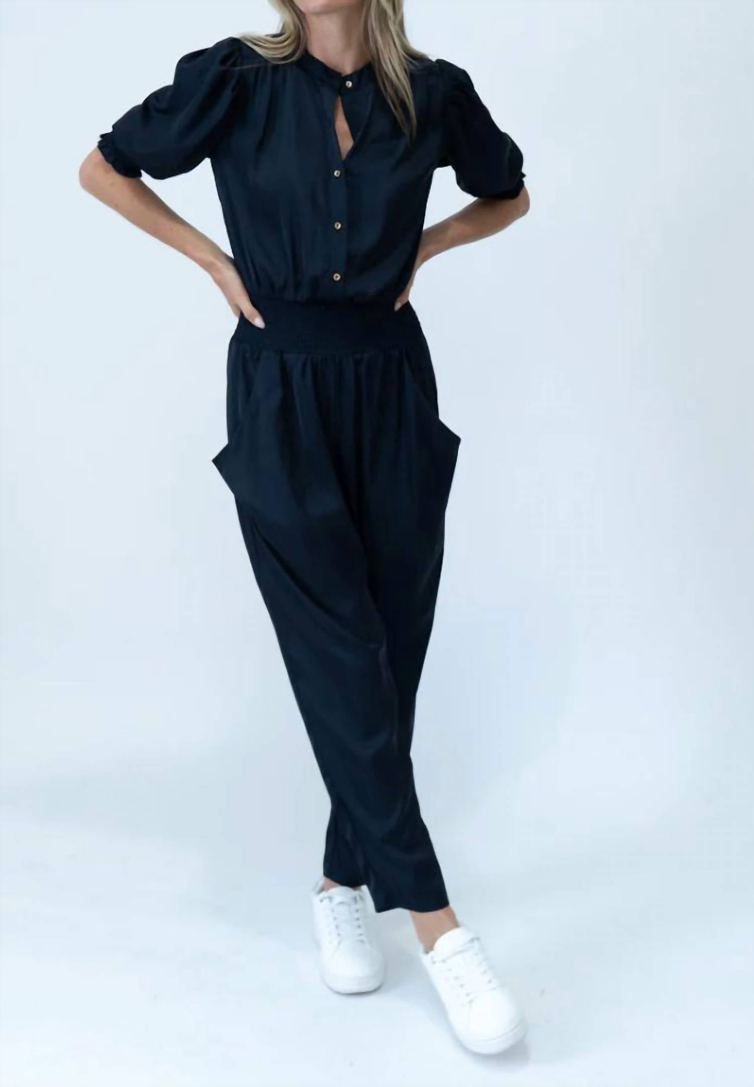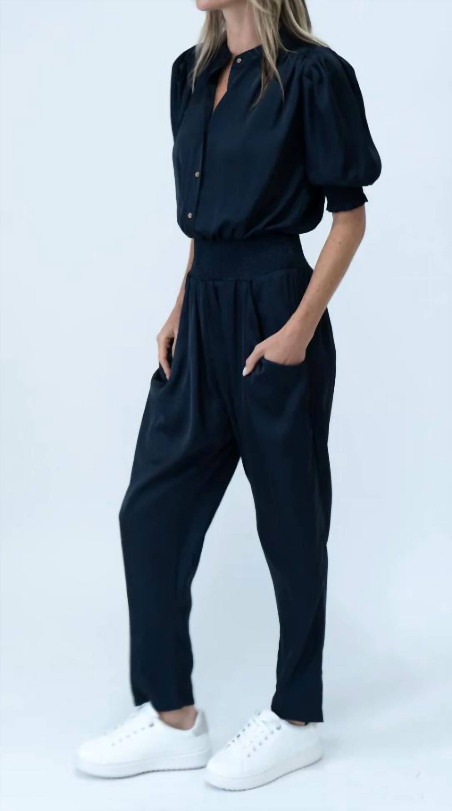 The perfect outfit choice when you you need something quick to throw on and still want to look efforlessly cool. Elevate your wardrobe with the Raven Jumpsuit by SIX/FIFTY, crafted in silky satin material for a luxurious touch. This navy jumpsuit, ideal for both day and night, features a comfortable band on the sleeve and waistband as well as convenient pockets. Composition: 97% Polyester, 3% Spandex. Closure: Button closure. Care: Hand wash and lay flat to dry.