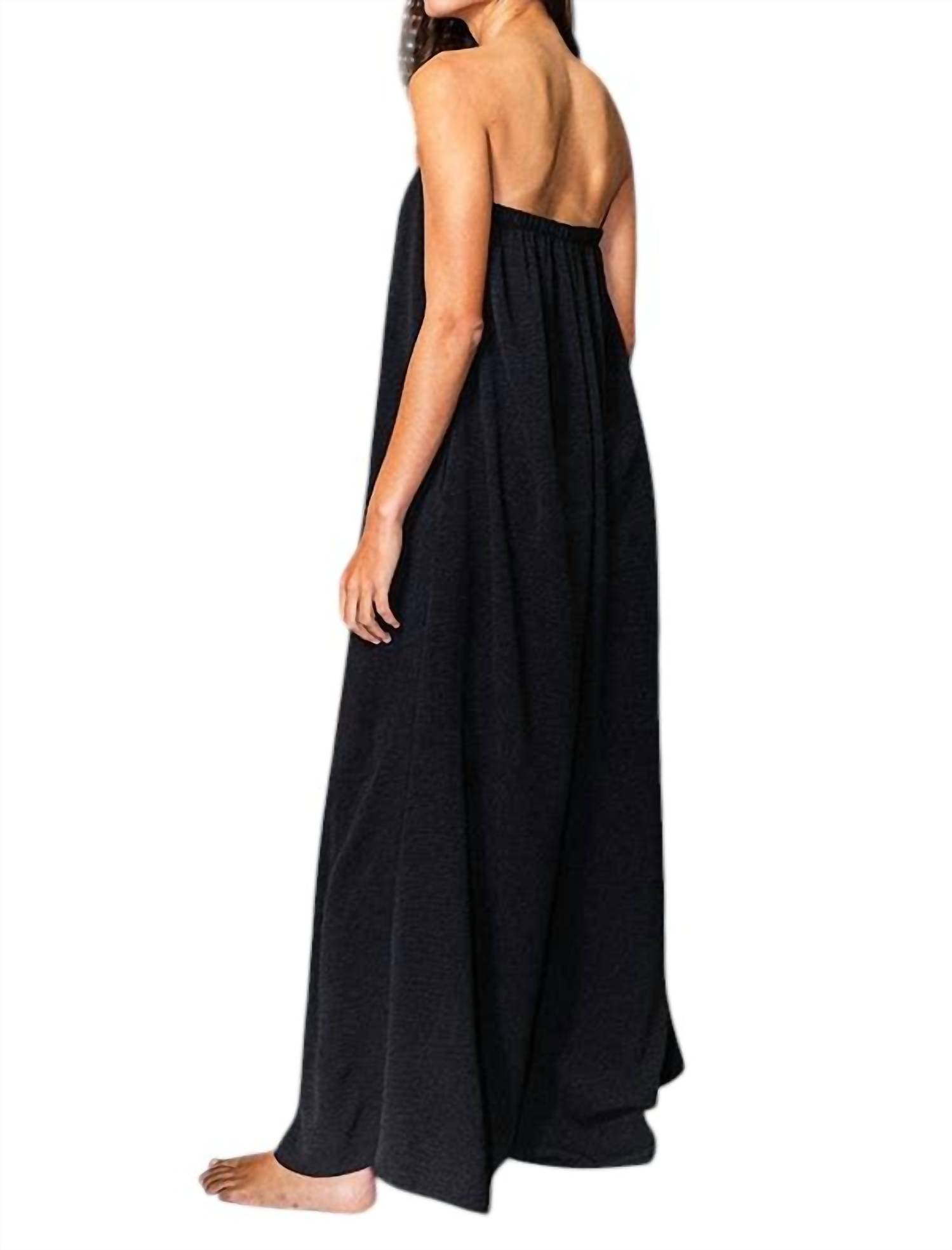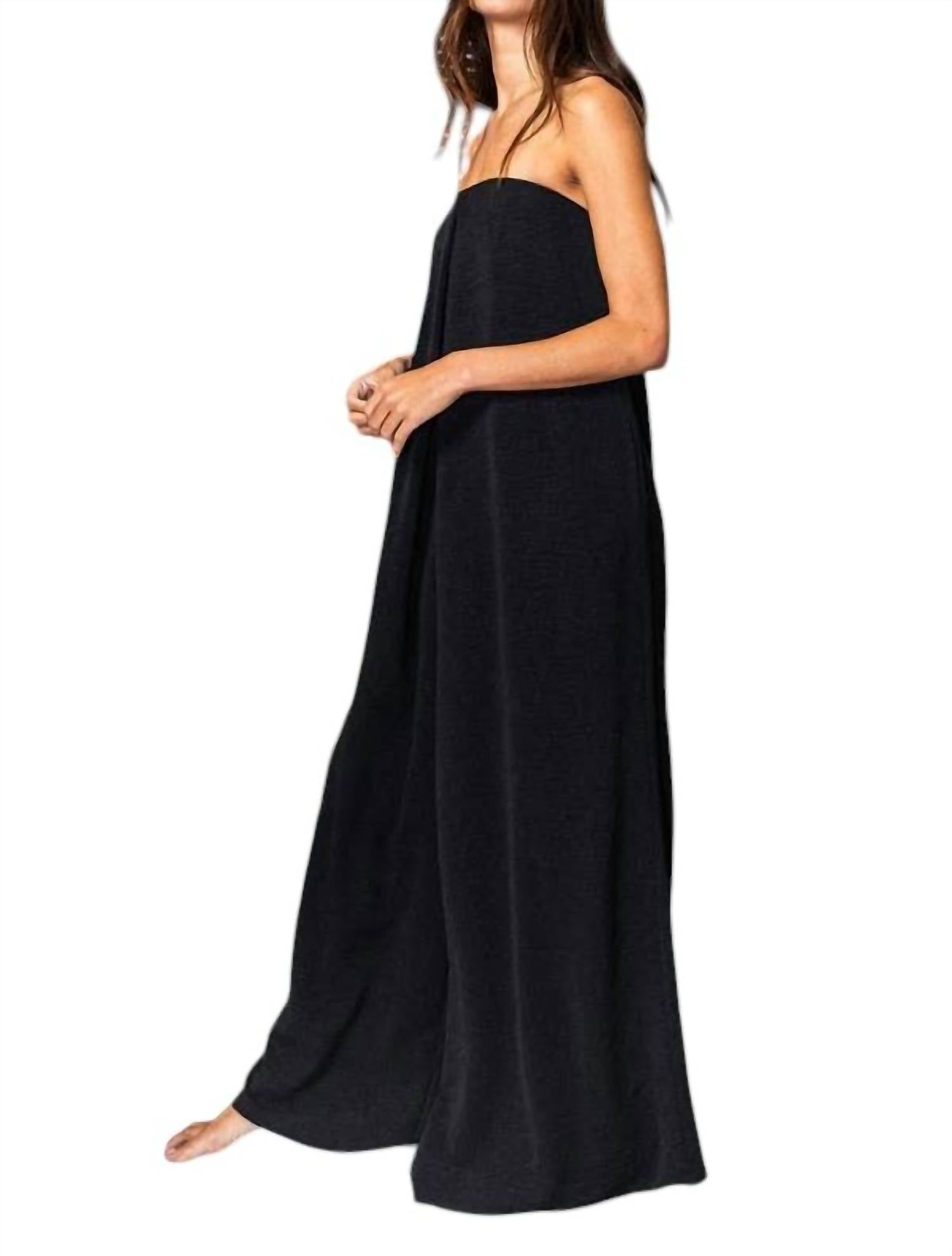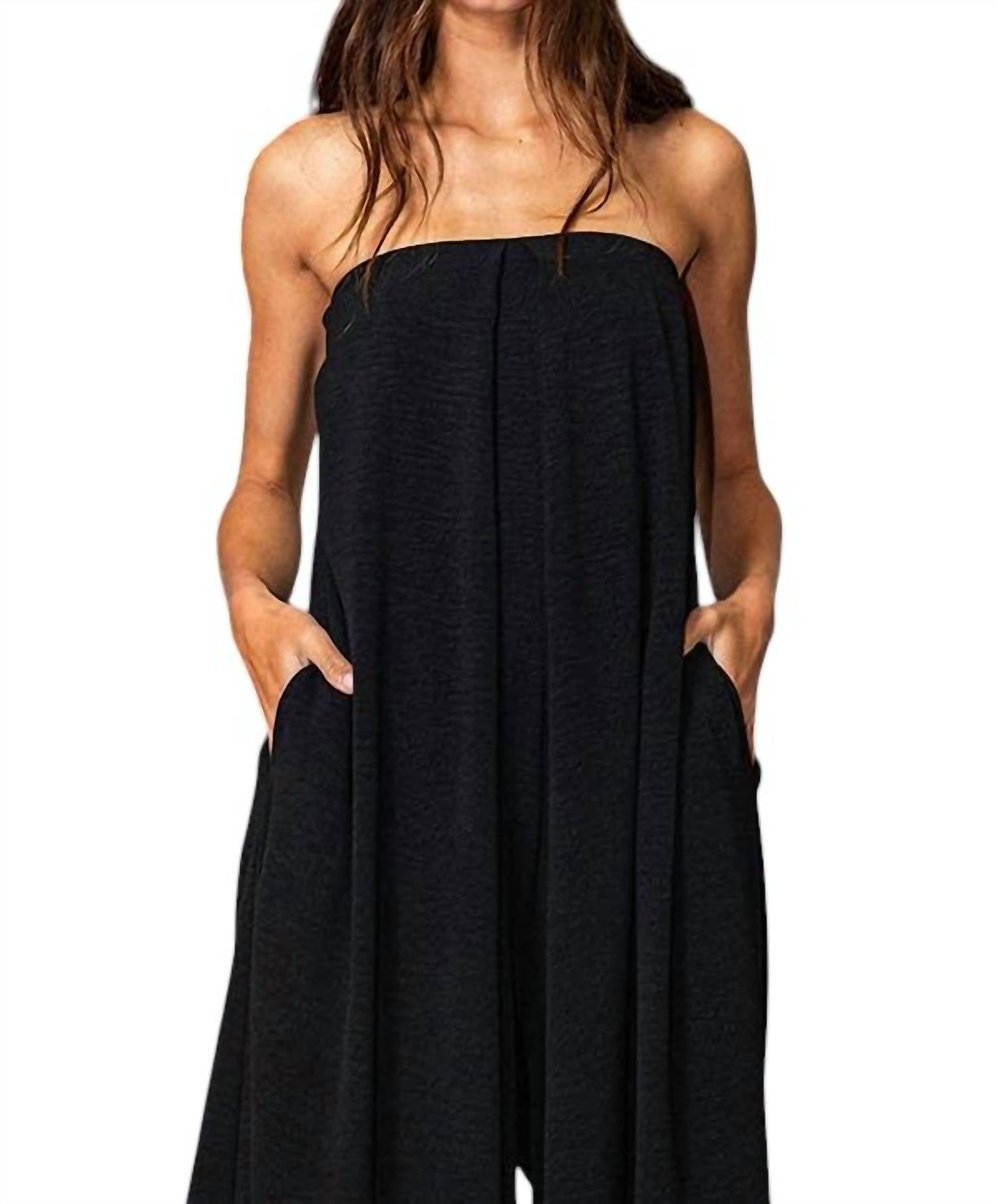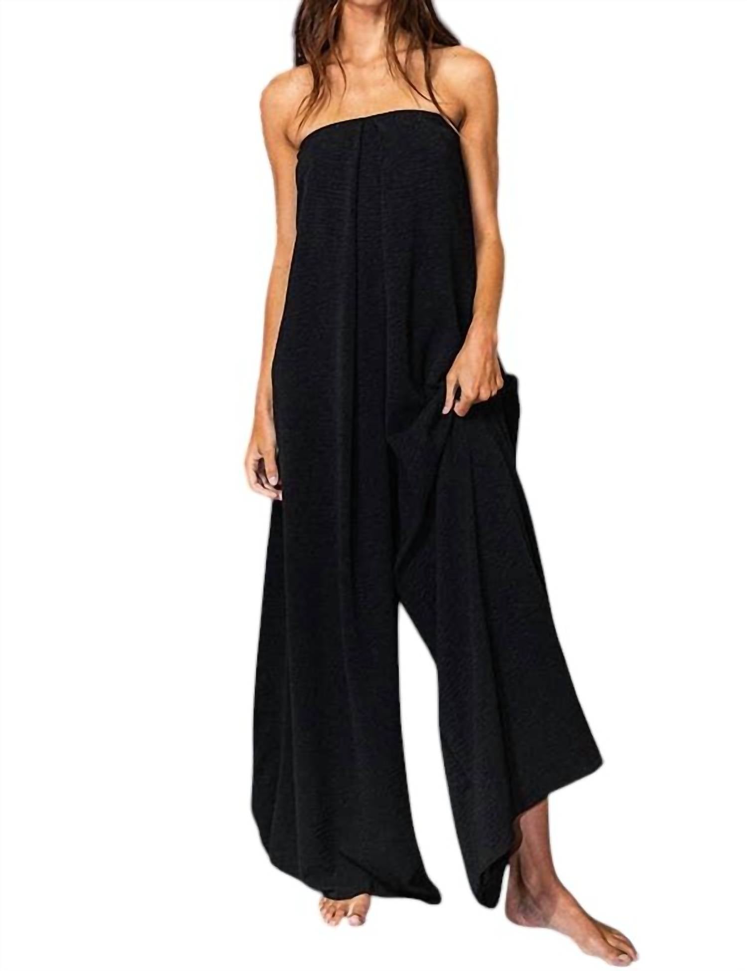 Throw it on and go! Elevate your wardrobe with the Jana Strapless Flowy Jumpsuit by BUCKETLIST, a minimalist black staple crafted entirely from polyester. Its strapless design is accentuated by intricate front pleat details, leading into wide, flowy pants complete with pockets. Featuring a relaxed fit with a comfortable pull-on closure, this solid-patterned jumpsuit runs slightly large, ensuring ease of wear for vacations and summer occasions. Care instructions recommend hand washing to maintain its elegant shape through multiple outings.