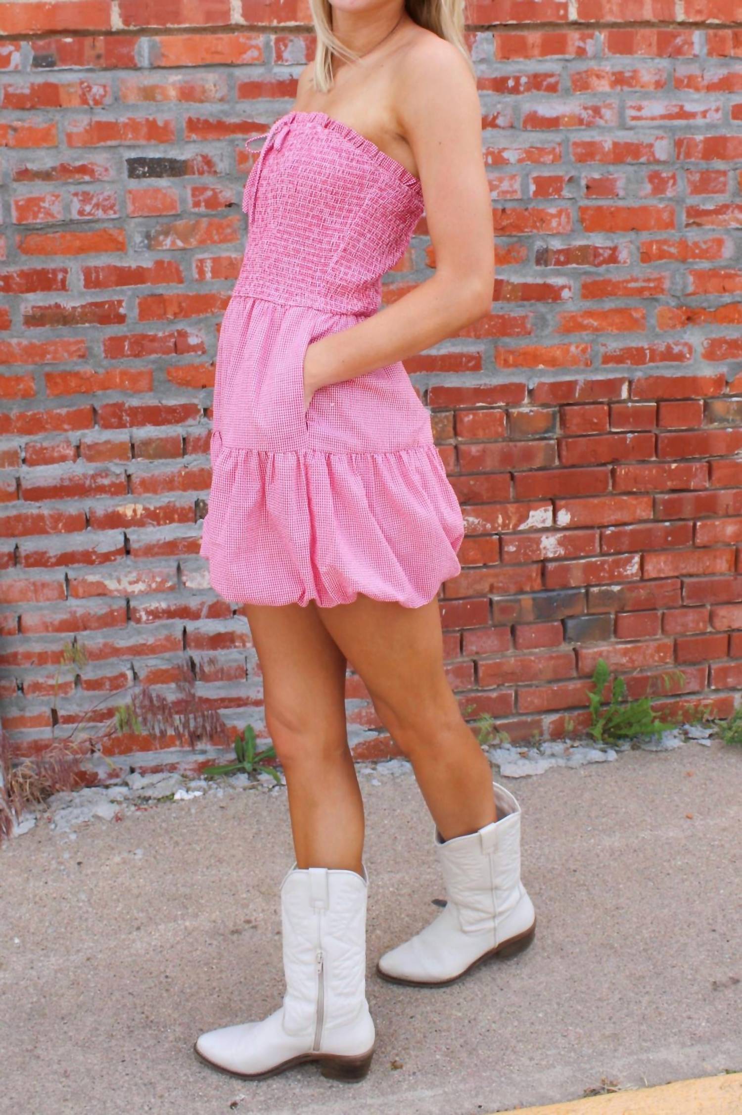 Throw it on and go! Introducing the Georgia Strapless Romper by GILLI, a delightful piece in pink gingham perfect for warm weather occasions. This romper features a charming strapless design with a slight bubble detail enhancing the skirt, and convenient pockets. Closure: Pull-on style. Care: Machine wash cold, line dry for best results. Available in plus sizes, this romper fits true to size (Small: 2-4, Medium: 6-8, Large: 10-12). Model is wearing a size small.