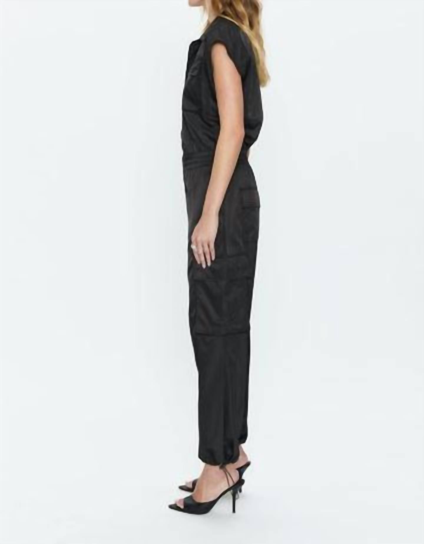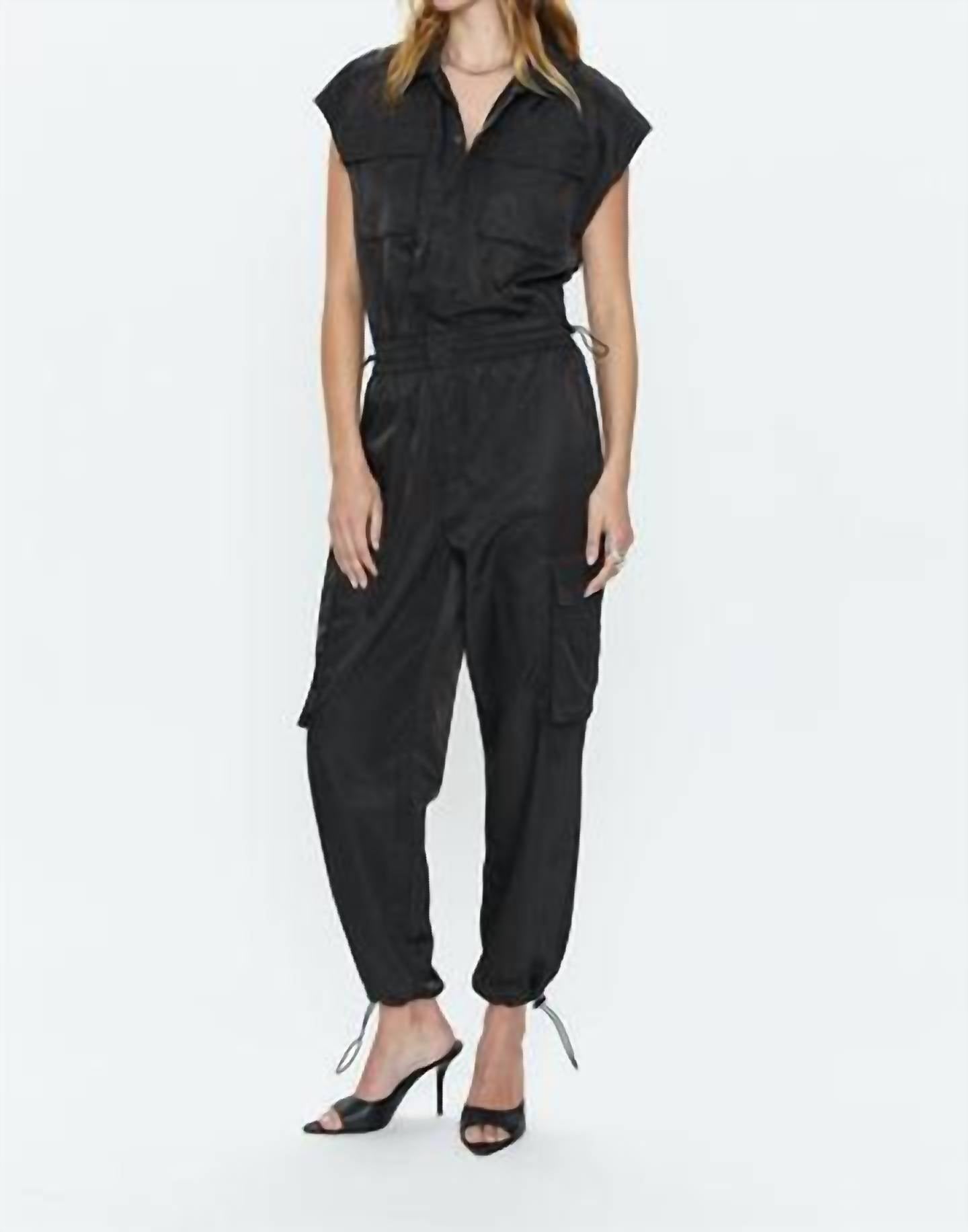It doesn't take much for this one piece to look effortlessly cool. Add some statement jewelry to dress it up, or throw on some sneakers for a more casual vibe. Discover the chic Jade Cargo Jumpsuit by PISTOLA, a perfect blend of style and practicality for your spring streetwear collection. This solid black jumpsuit features a relaxed pant fit and convenient pockets, making it an ideal vacation staple. Made from 100% polyester, it offers comfort and durability. For easy care, this piece is machine washable and can be tumble dried.
