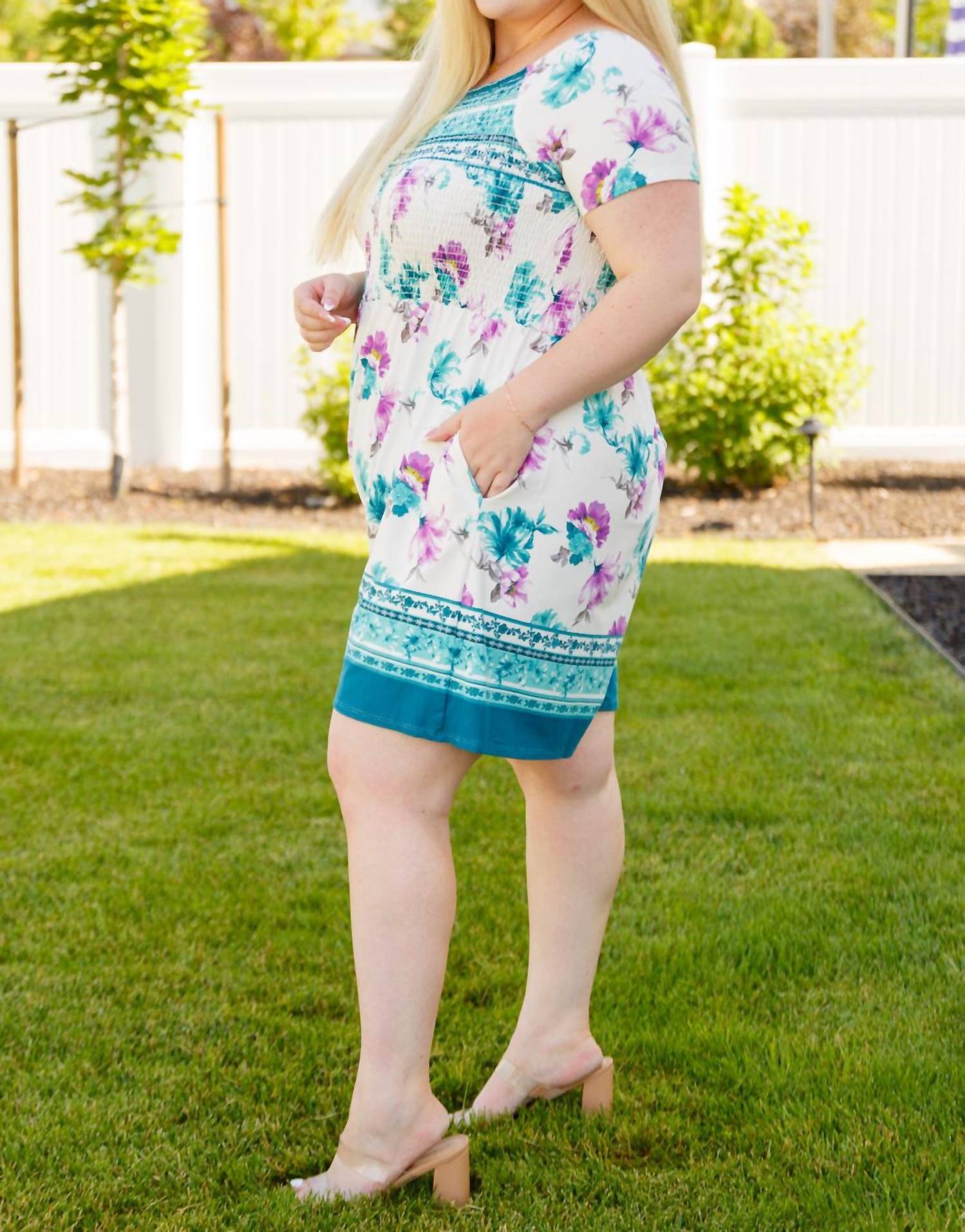 Double Brushed Poly. Smocked Elastic Neckline. Off the Shoulder. Pockets. Stretchy. Buttery Soft. 95% Polyester, 5% Spandex. True to Size.