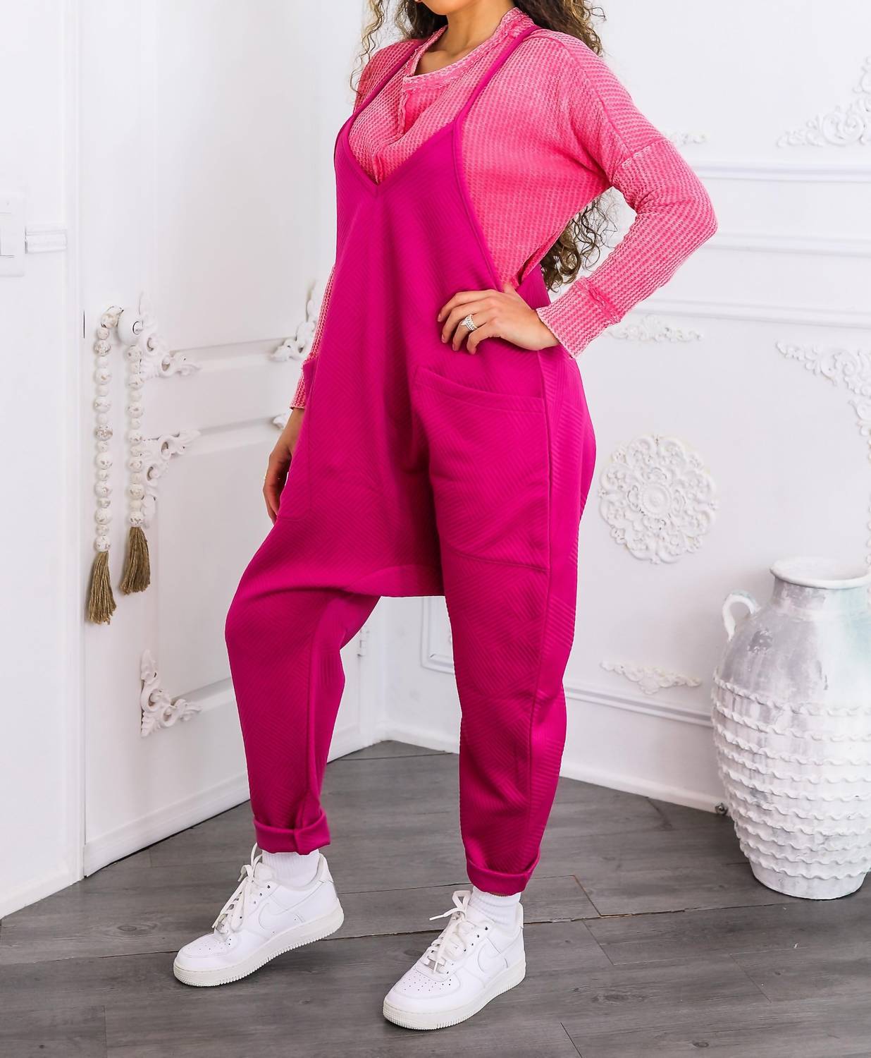 It doesn't take much for this one piece to look effortlessly cool. Add some statement jewelry to dress it up, or throw on some sneakers for a more casual vibe. Introduce the SurelyMine Slouchy Pocket Jumpsuit, a vibrant fuchsia garment perfect for casual adventures and cozy styling. This women's jumpsuit is crafted from textured stretch nylon and boasts an effortless, relaxed fit with a drop-crotch silhouette. Featuring adjustable shoulder straps and oversized front pockets, it provides both style and functionality. Closure: Pull-on style. Pair it with your favorite layers for versatile year-round wear. The model is 5'4" and wears a size small.