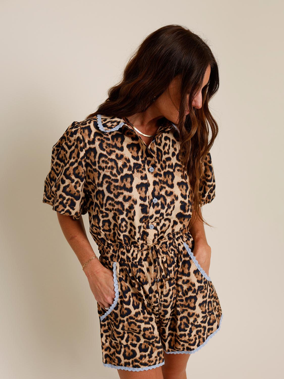 The perfect outfit choice when you you need something quick to throw on and still want to look efforlessly cool. Discover the Leopard & Lace Romper by AnnieWear, perfect for those who love to make a statement. This eye-catching romper features a fierce leopard print paired with delicate blue lace accents, ideal for both adventurous days and lively nights. Crafted from a self-composition of 92% polyester and 8% spandex with a 100% polyester lining, it offers comfort and style. Closure: Button closure. Care: Hand wash cold, do not bleach, lay flat to dry, cool iron. Maggie is 5'7", 130 lbs, with a 26" waist and 37" hip, wearing a size small.