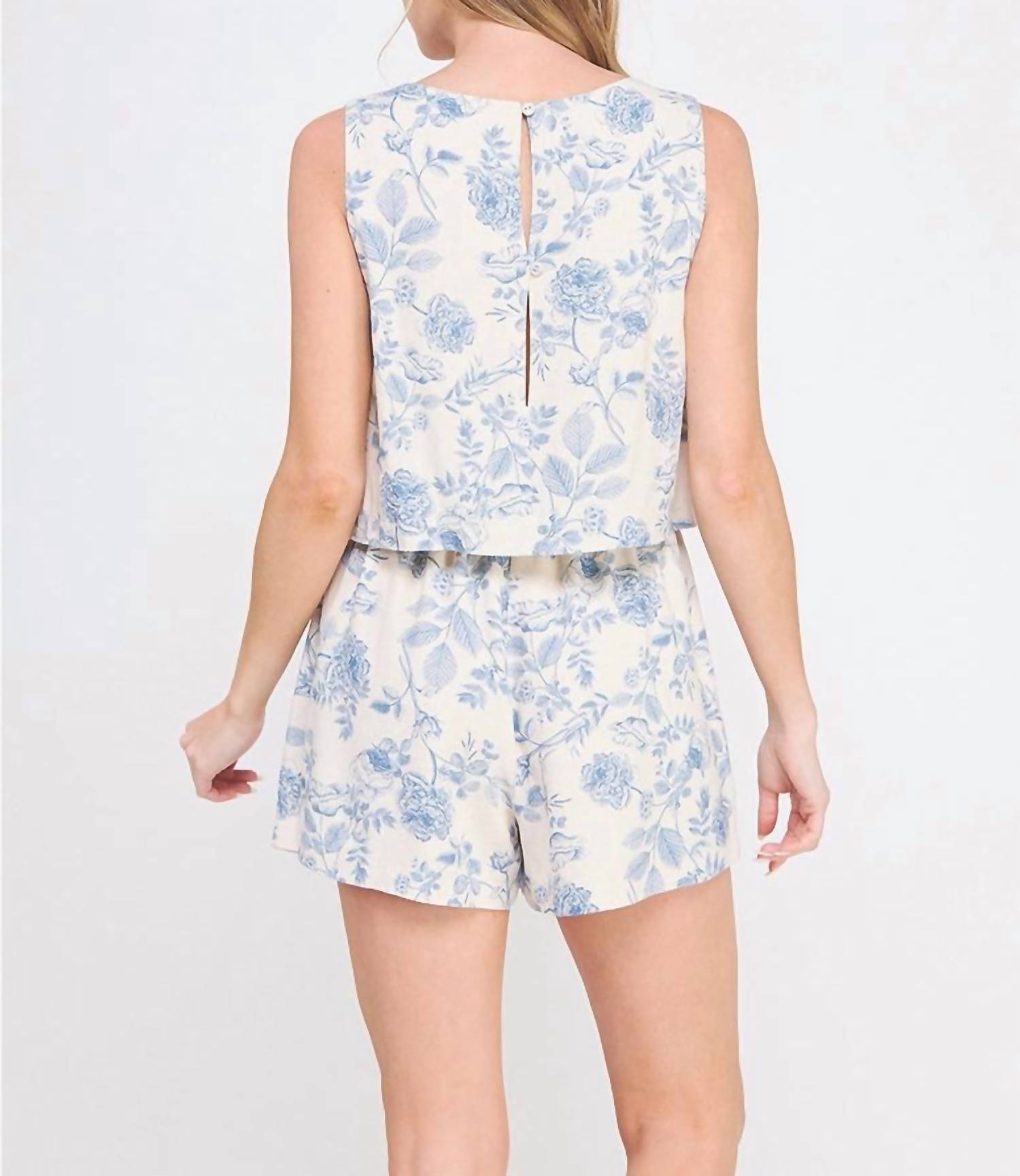 Throw it on and go! Step into effortless style with the Cerise Romper by Allie Rose, designed for ultimate comfort and charm. This sleeveless piece is crafted from a Viscose and Linen blend, featuring a romantic floral print in light blue and cream. It boasts a square neckline, faux tie waist, and a clever overlay top for a chic two-in-one look. Originating from China, the romper includes a convenient button closure and side pockets, making it an ideal choice for a summer getaway. Care instructions: Machine wash cold, lay flat to dry.