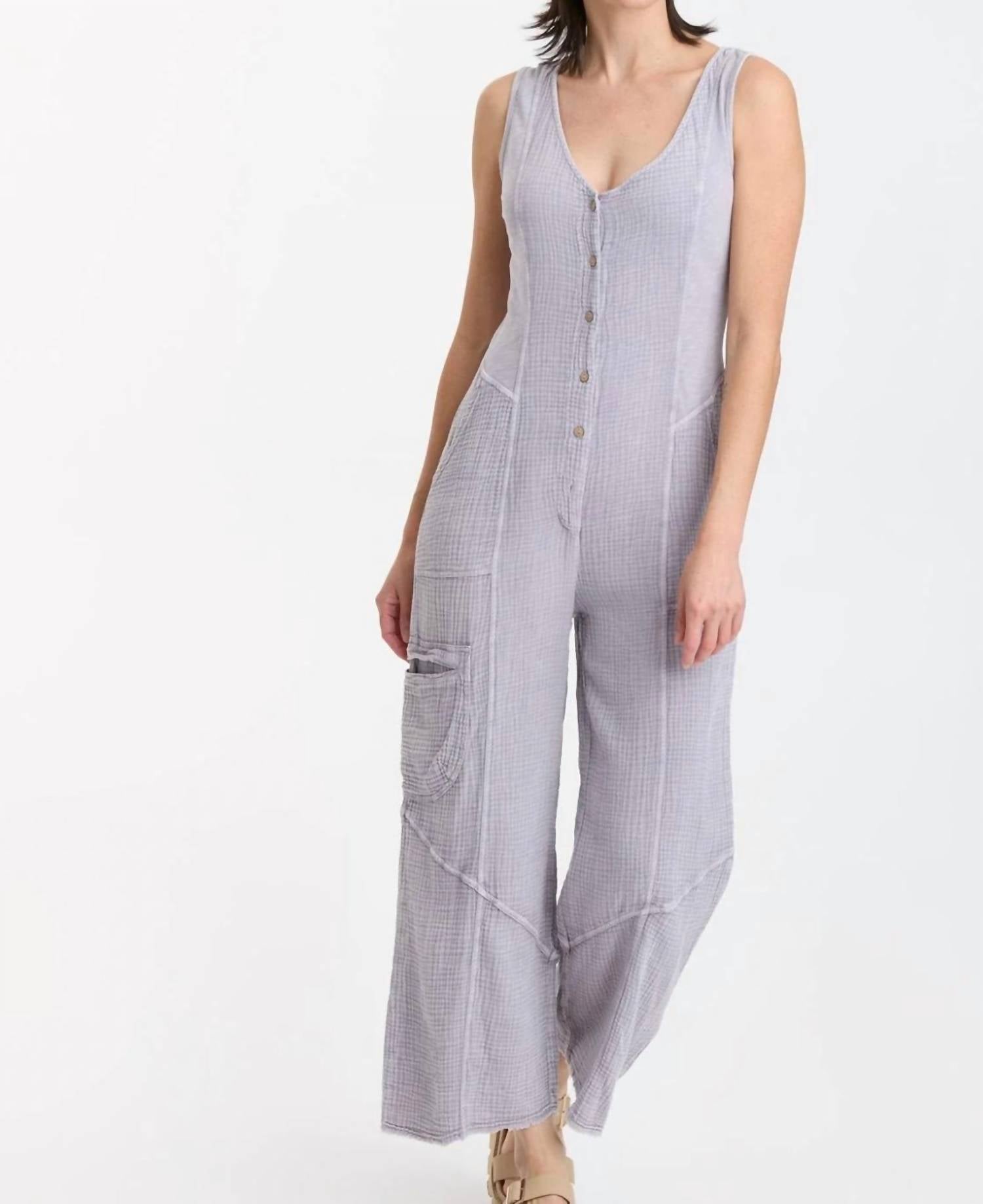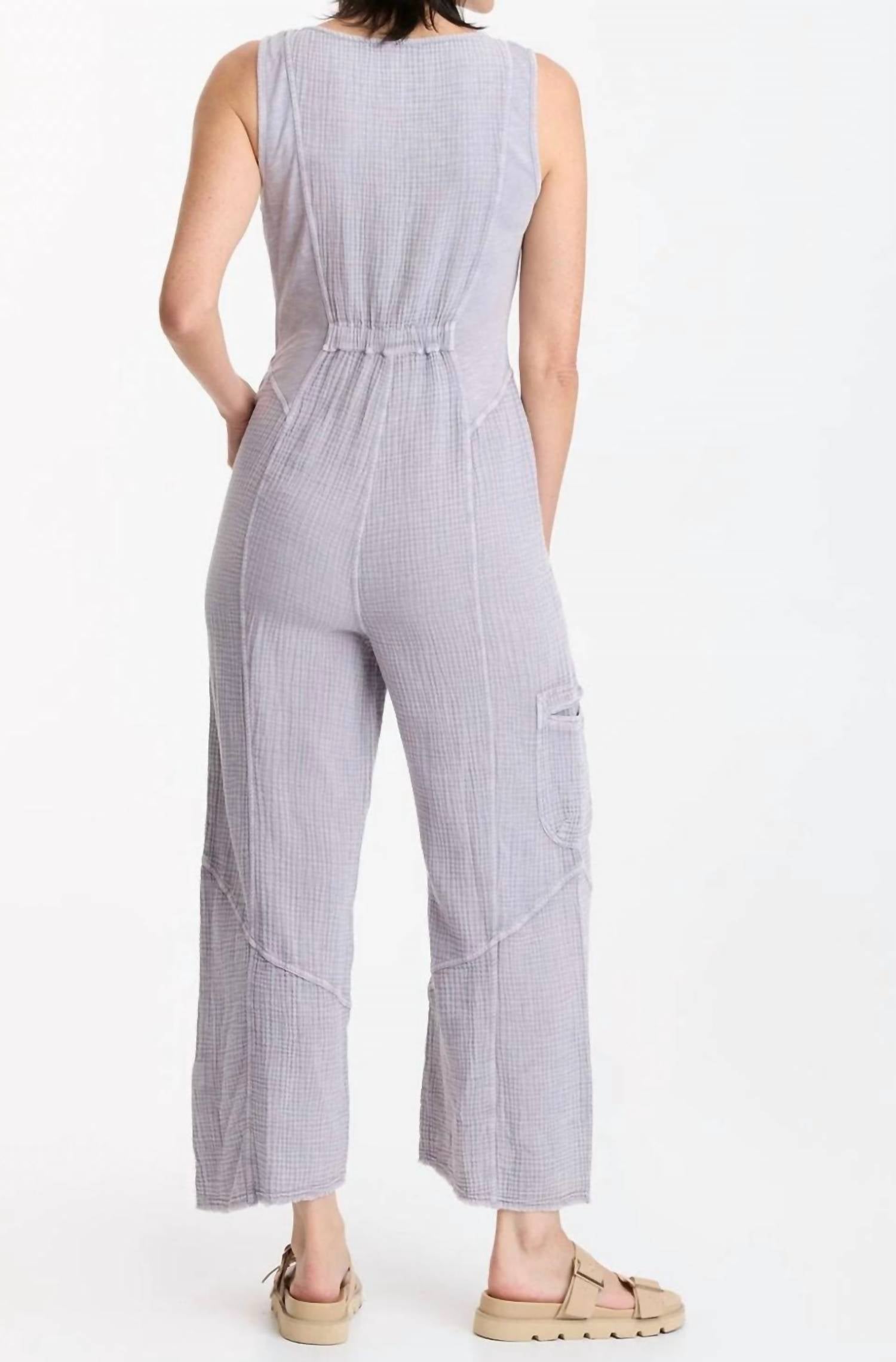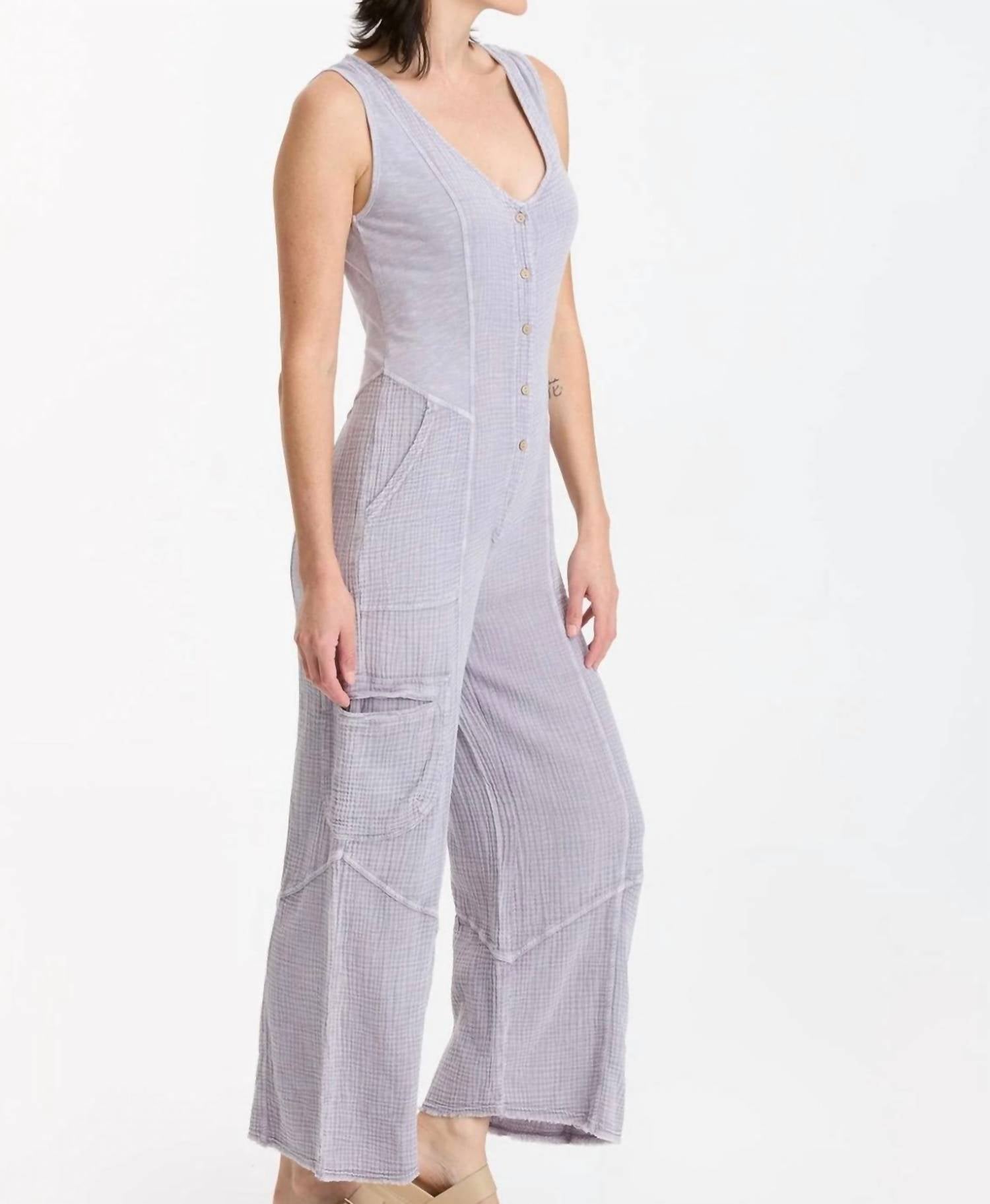 It doesn't take much for this one piece to look effortlessly cool. Add some statement jewelry to dress it up, or throw on some sneakers for a more casual vibe. Elevate your summer wardrobe with the XCVI Devereaux Jumpsuit in a stunning dusty lavender acid wash. This women's jumpsuit showcases a v-neck design with a cropped wide-leg silhouette, enhanced by front welt cargo pockets for a stylish and functional touch. Made from 100% cotton double gauze with slub jersey contrast panels (60% cotton, 40% modal), it features a button closure for easy wear. With a preshrunk design, 26.5" inseam, and elastic band at the center back, it ensures a contoured fit for maximum flexibility. Care is easy with machine wash instructions, making it perfect for your next vacation getaway. Model Monique is wearing a size small, standing at 5'10" with a 34B bust, 26" waist, and 37" hip.