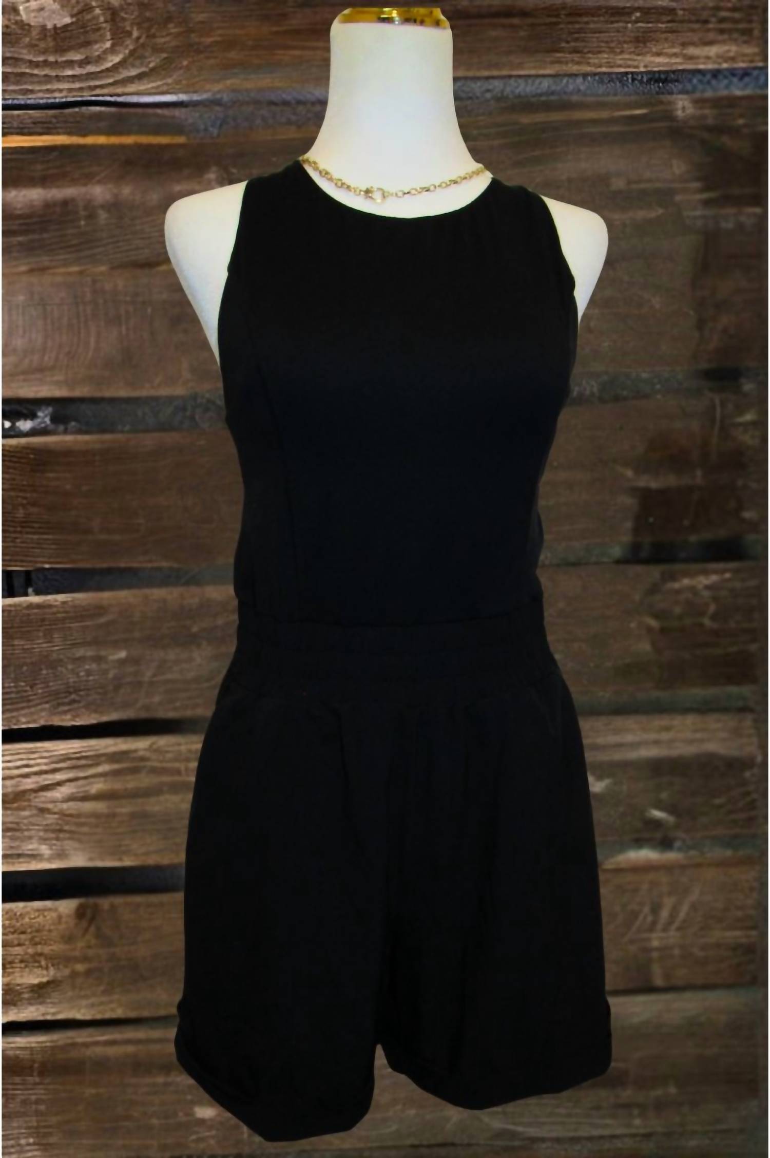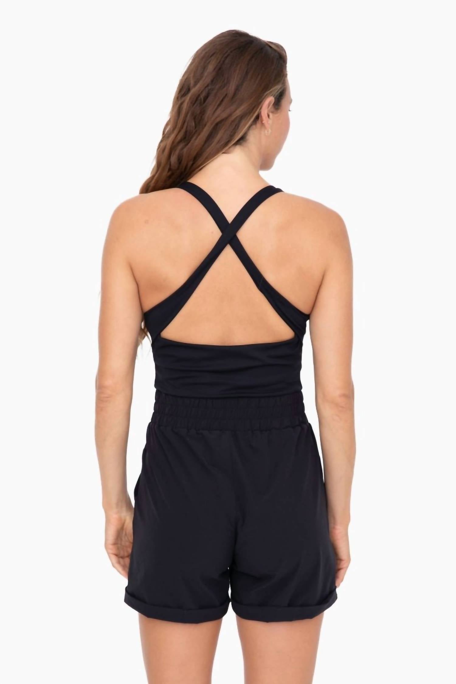 It doesn't take much for this one piece to look effortlessly cool. Add some statement jewelry to dress it up, or throw on some sneakers for a more casual vibe. Step into workout style with the Born To Run Athletic Romper by Mono B, designed for the active woman. Featuring a gripping mid-rise with a 12" rise and 4.5" inseam, this romper boasts a brushed microfiber composition, crafted with a blend of nylon and spandex for comfort and flexibility. The pull-on design includes crossed back straps and functional side pockets, complete with a built-in shelf bra and elastic waistband for added support. Care for this solid black piece is straightforward: machine wash and line dry. Model Miška is 5'9", a size 4, wearing a size S.