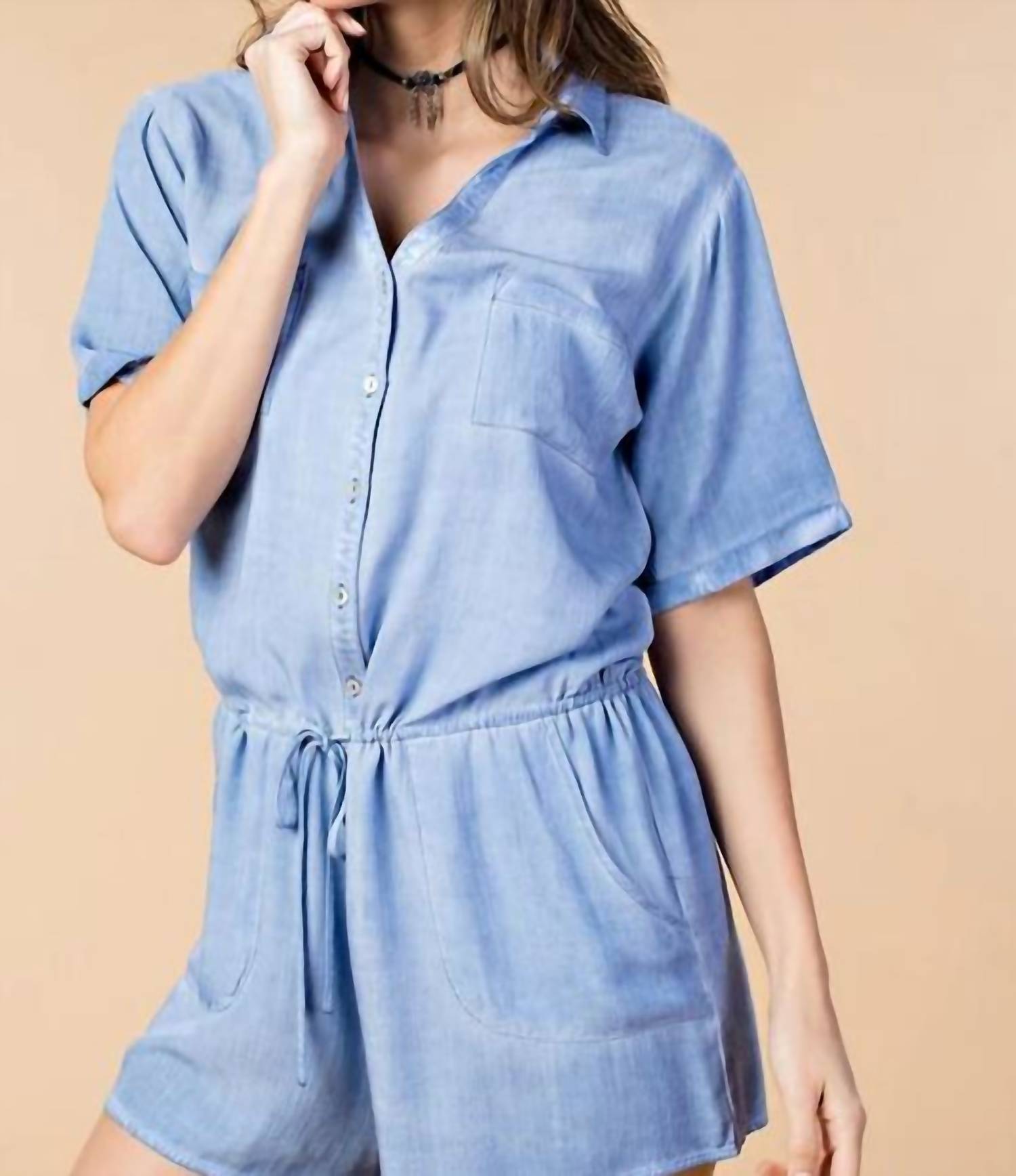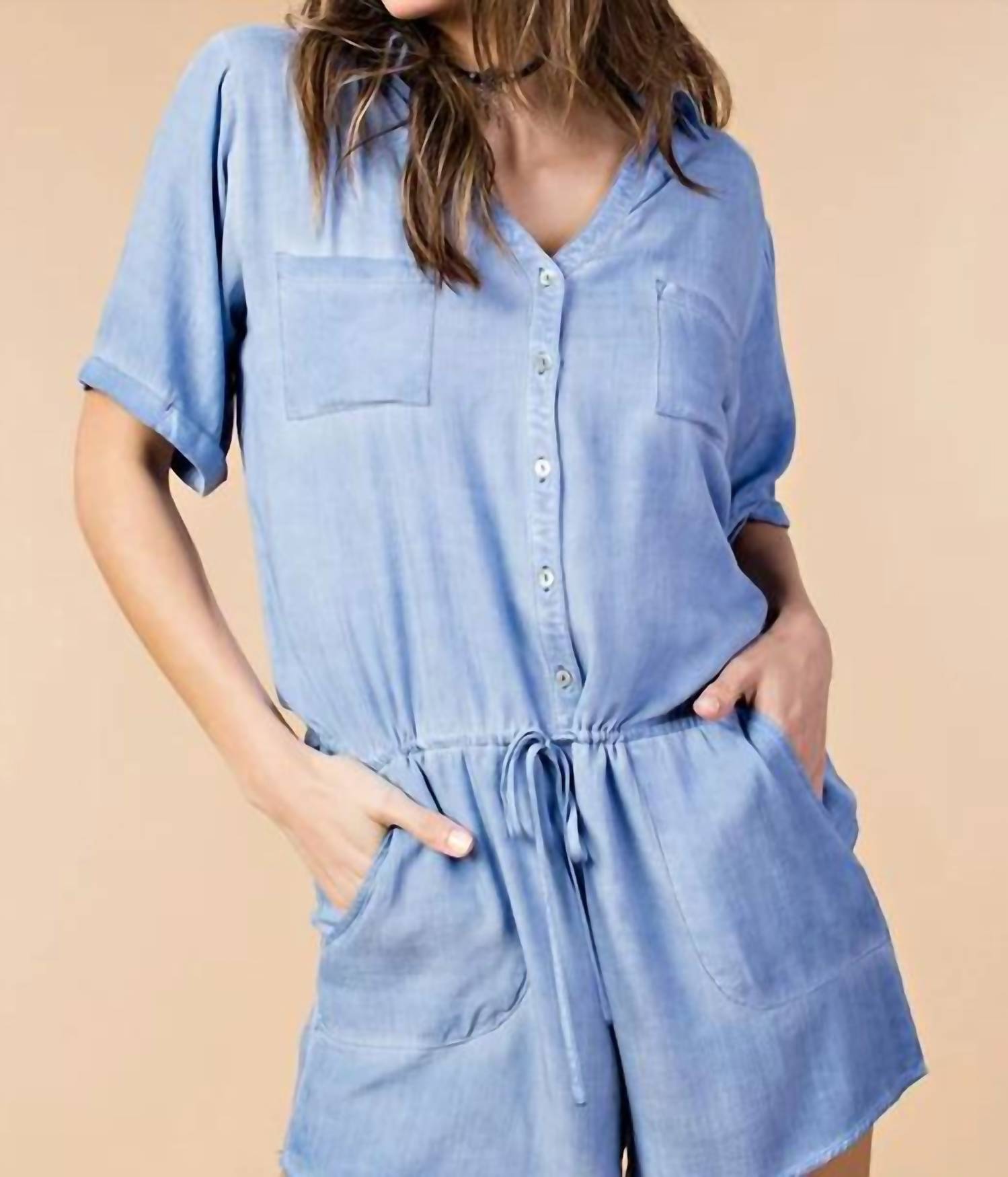 It doesn't take much for this one piece to look effortlessly cool. Add some statement jewelry to dress it up, or throw on some sneakers for a more casual vibe. Elevate your vacation wardrobe with the Denim Wide Leg Romper by Entro, a chic choice in a stunning solid blue hue. This romper features a flattering cinch tie closure at the waist and relaxed wide leg design, complete with convenient pockets. Gender: Women. Perfect for easy-breezy style with a touch of flair.