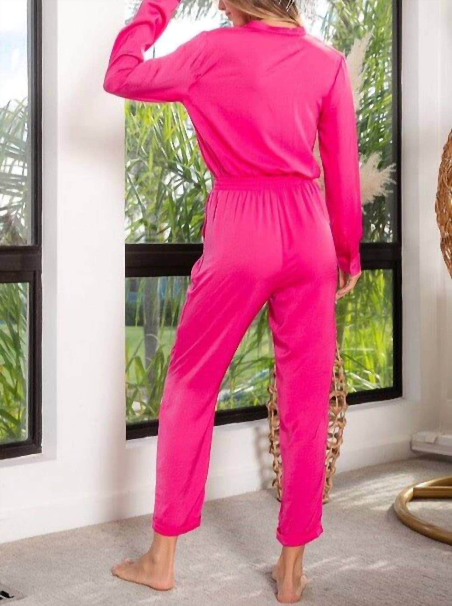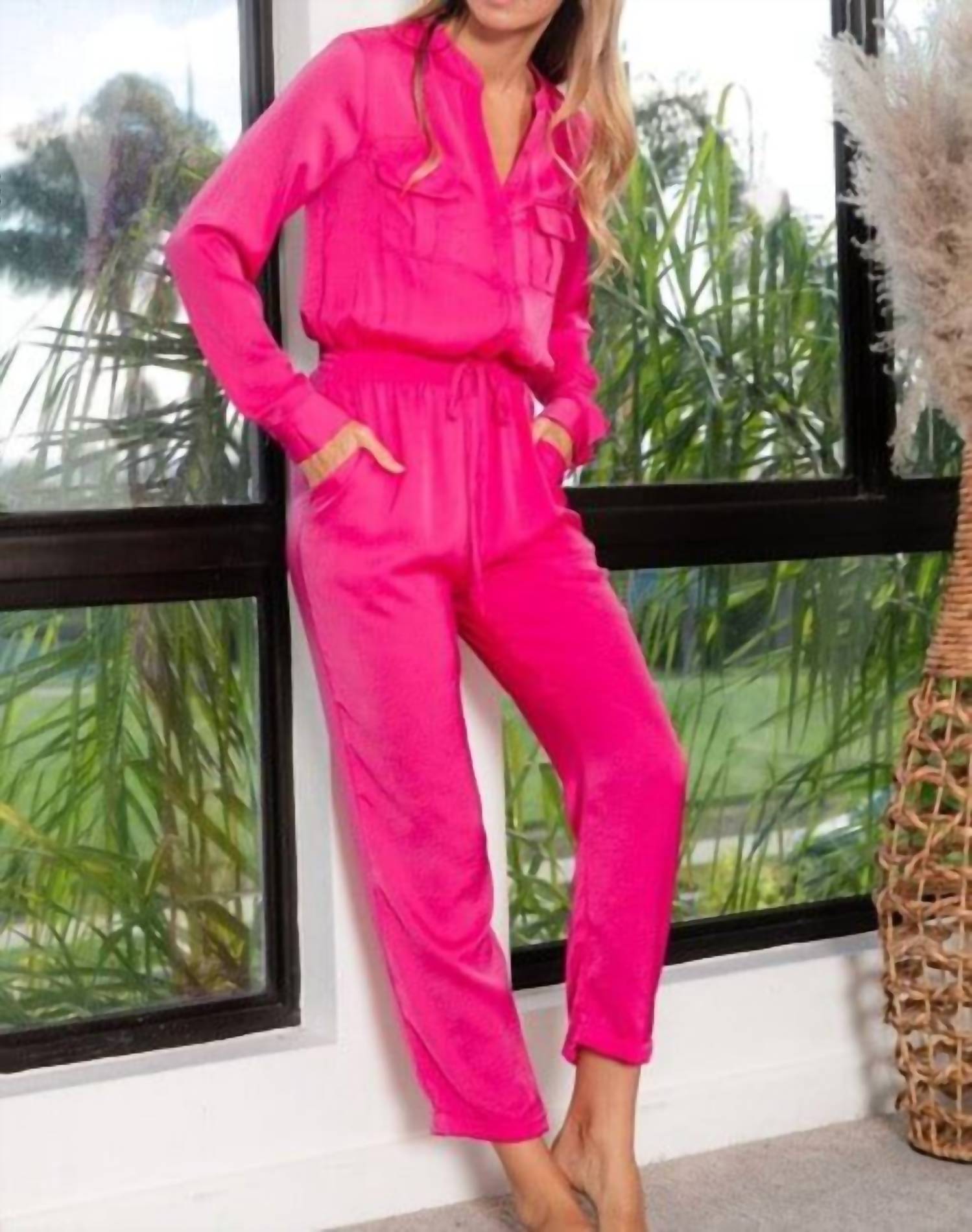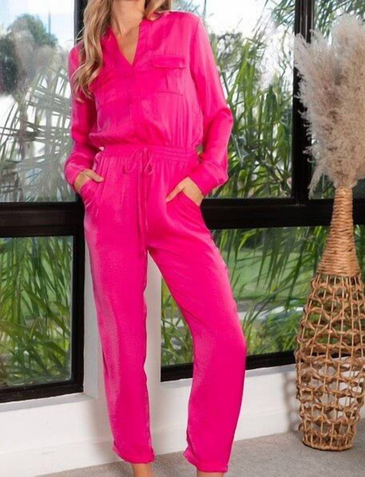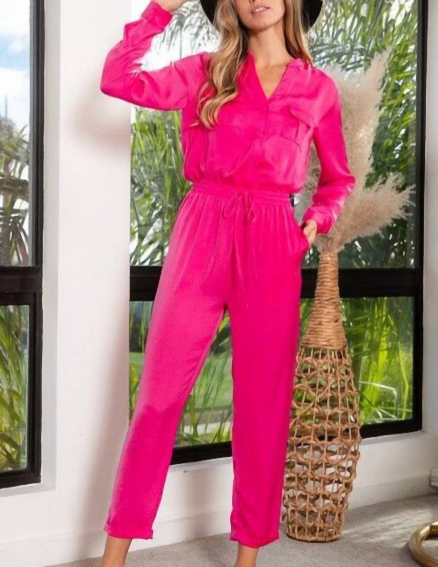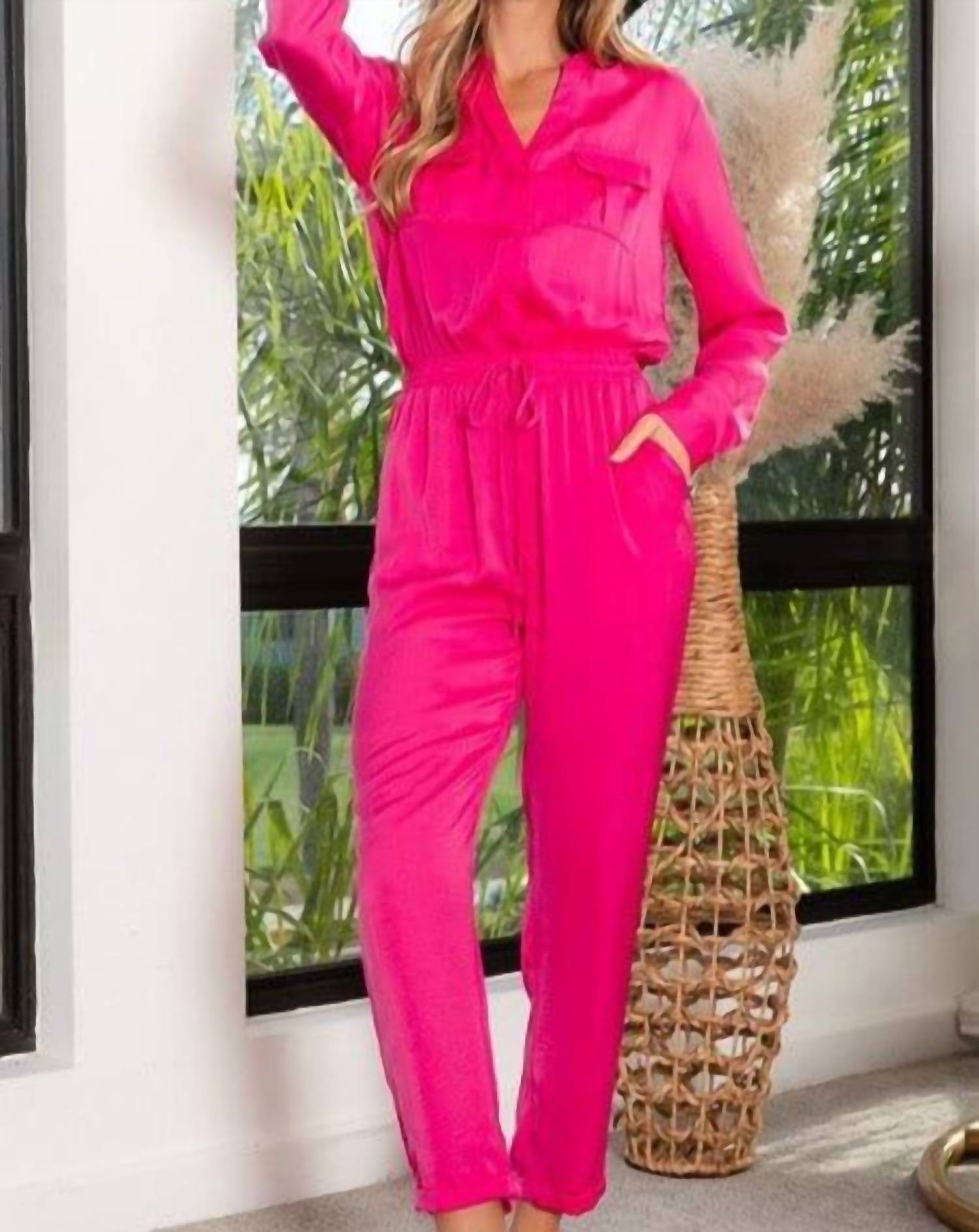 Throw it on and go! Elevate your wardrobe with the Brenna Long Sleeve Jumpsuit by BiBi, crafted from 100% polyester for a luxurious feel. This chic jumpsuit features long sleeves and a flattering V-neck, complete with a self-cinching waist tie to accentuate your figure. Designed with a cropped pant length and a stylish button closure, it includes front and side pockets for added practicality. This piece is true to size and best cared for by hand washing, making it an effortless choice for any occasion.