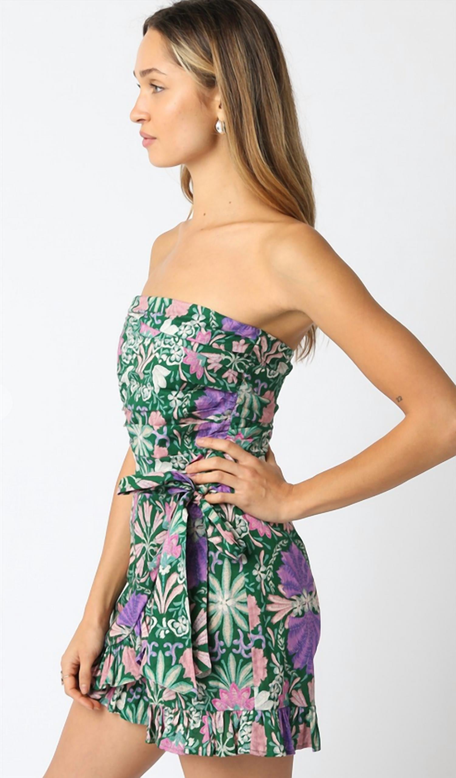 It doesn't take much for this one piece to look effortlessly cool. Add some statement jewelry to dress it up, or throw on some sneakers for a more casual vibe. Get ready for summer with the Judy Strapless Print Romper by Olivaceous, a vibrant piece in a lively green multi-print. Designed with a strapless neckline, ruffle-detailed shorts, and a fit-and-flare silhouette, it's perfect for concerts or 4th of July celebrations. This romper features a convenient back zipper closure for a flawless fit. Made for easy care, it's machine washable, making it a staple in your boho chic wardrobe.