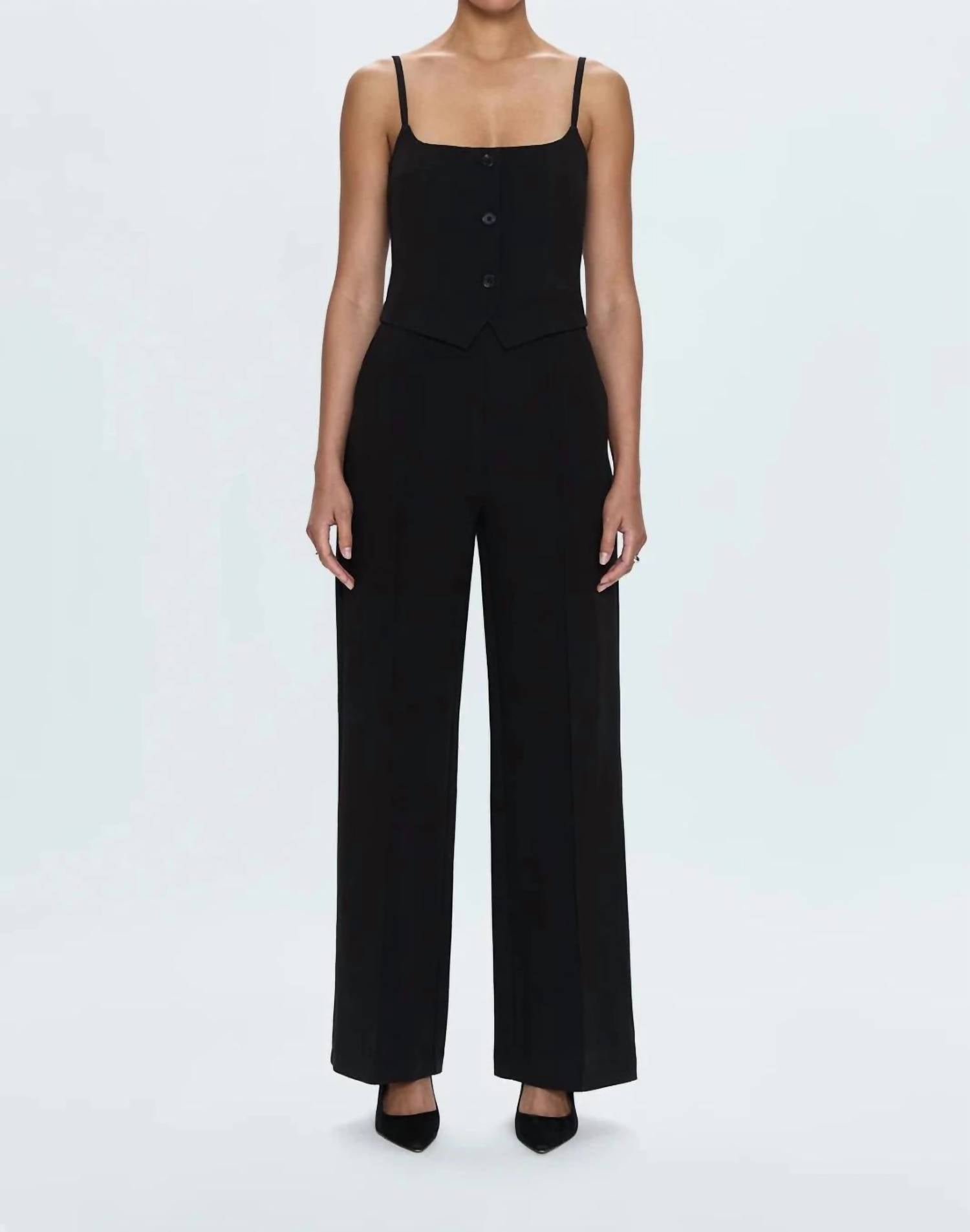 The perfect outfit choice when you you need something quick to throw on and still want to look efforlessly cool. The Marcia Tailored Jumpsuit by Pistola is a sophisticated choice for any dinner party or minimalist wardrobe. Crafted from 74% polyester, 24% rayon, and 4% spandex, this jumpsuit features adjustable straps and a tailored vest bodice with button front accents. Its pleated medium-width trousers are full length with a practical side zip closure, providing a faux two-piece suiting appearance. Designed in solid black, it includes a 32" inseam and pockets, and is easy to maintain with machine wash and tumble dry care instructions.