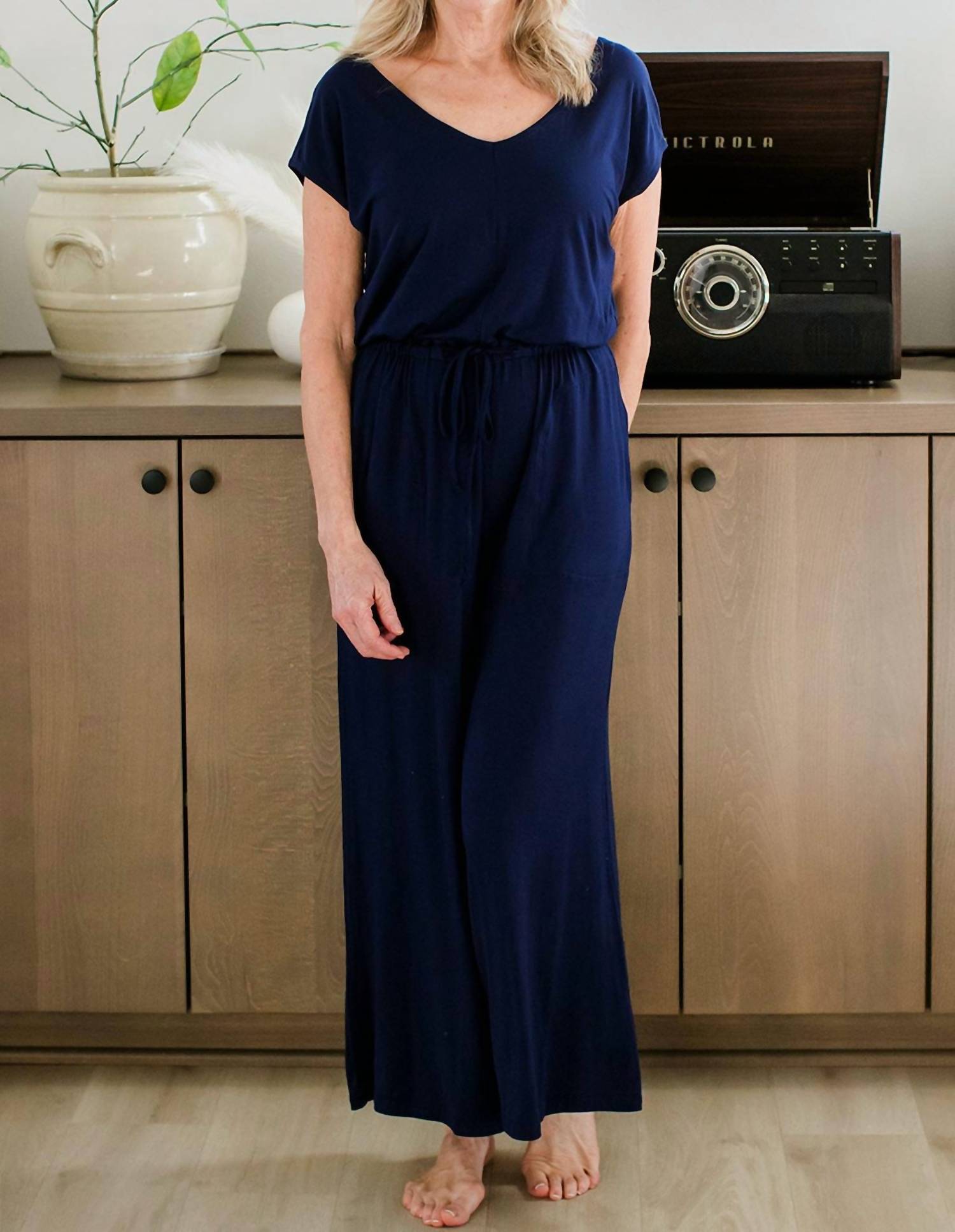 Throw it on and go! Effortlessly elevate your wardrobe with the Kiova V-Neck Bamboo Jumpsuit by Yala, a must-have for those sunny vacation days with its naturally up to UPF 50 protection. Featuring cap sleeves and a relaxed-fit wide leg, this navy jumpsuit combines style and comfort thanks to its pull-on closure and breathable viscose blend. Sewn with care on small sewing floors, it's as environmentally conscious as it is fashion-forward, boasting low impact dyes and light bamboo viscose jersey fabric. Care: Machine wash for easy everyday maintenance.
