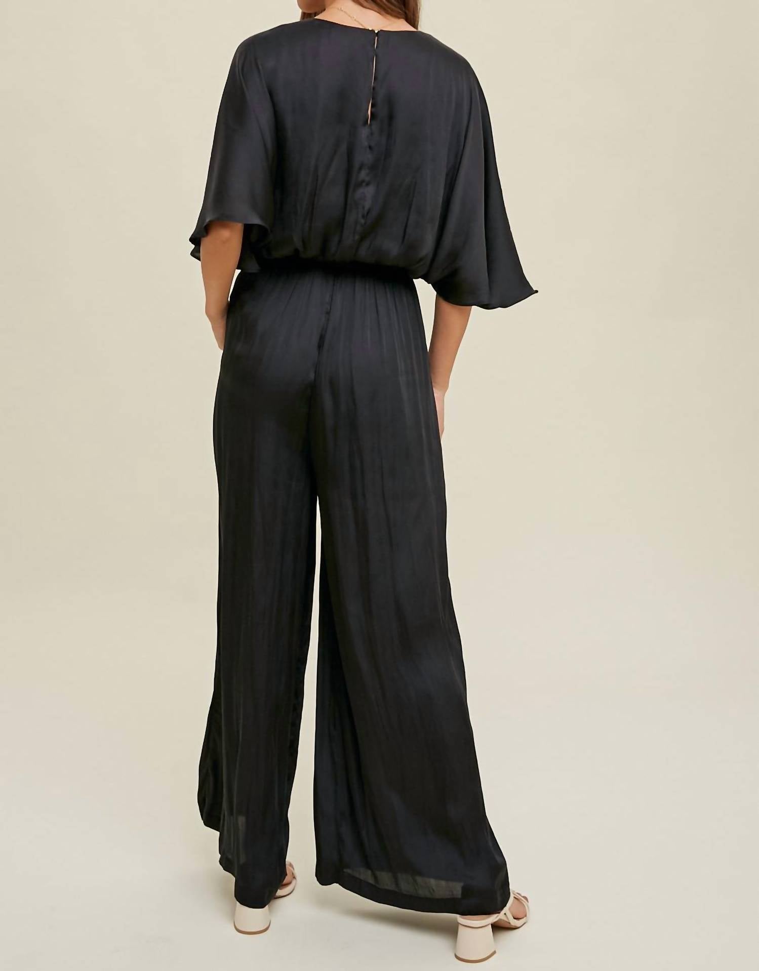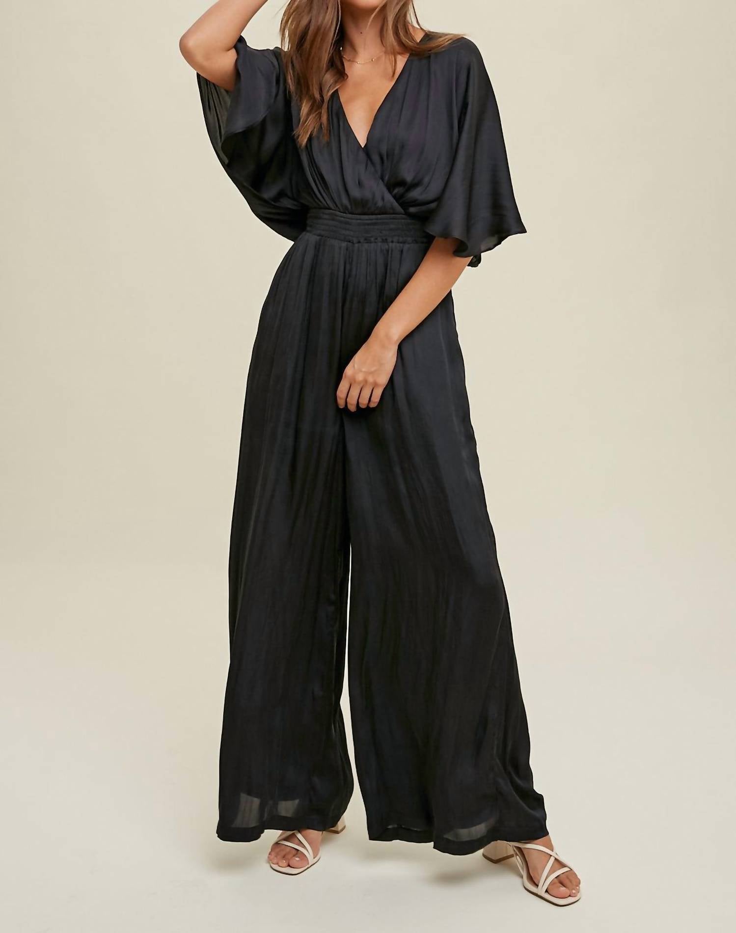 It doesn't take much for this one piece to look effortlessly cool. Add some statement jewelry to dress it up, or throw on some sneakers for a more casual vibe. Introducing the Clarissa Jumpsuit by WISHLIST, a versatile piece perfect for any occasion in classic black. This jumpsuit features a solid pattern with a flattering smocked waist and a wide-leg design for an elegant silhouette. Material: 100% Polyester. Closure: Button closure. Care: Hand wash cold, line dry. Designed with practical side pockets, it's an ideal choice for spring evenings and minimalist trends.