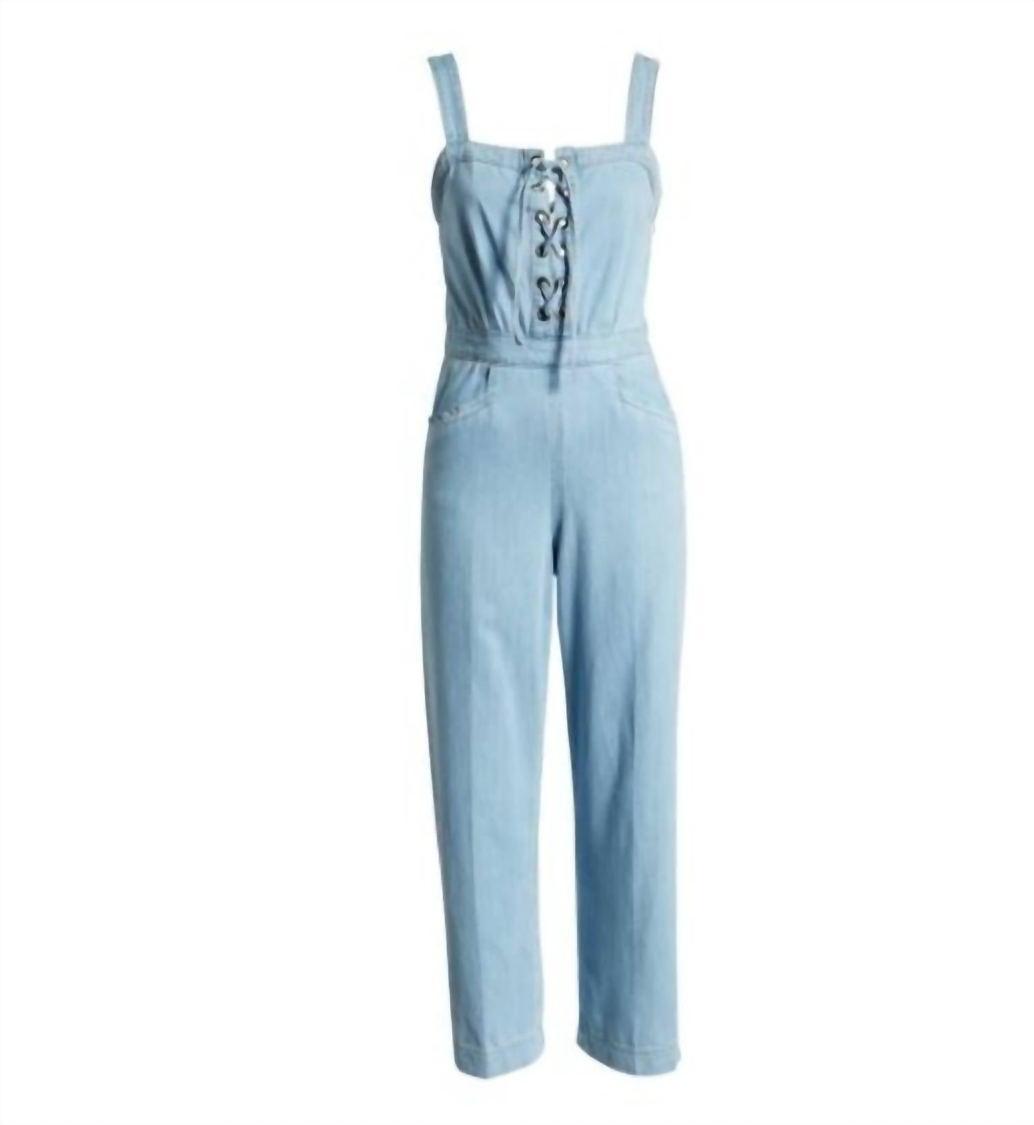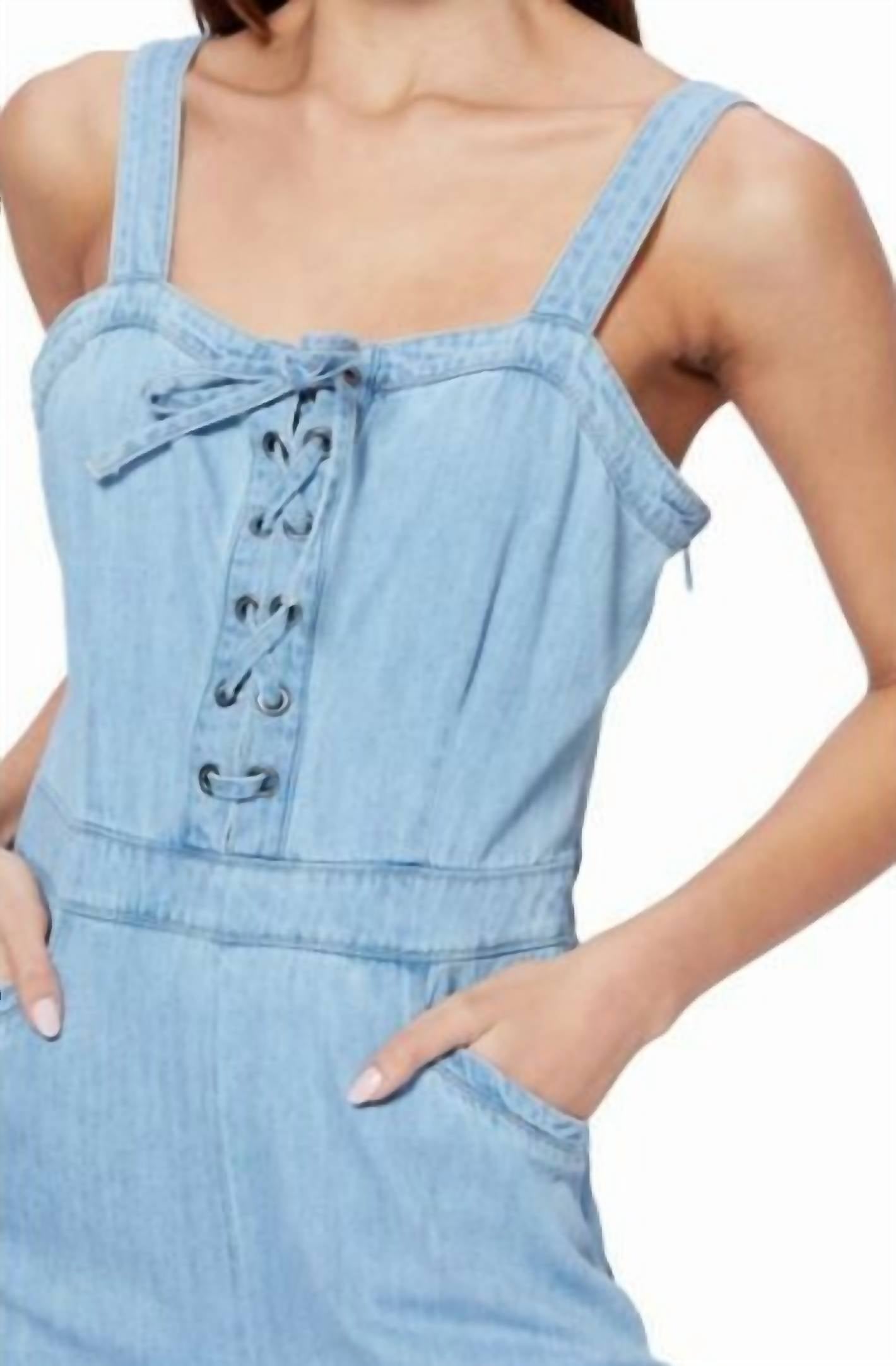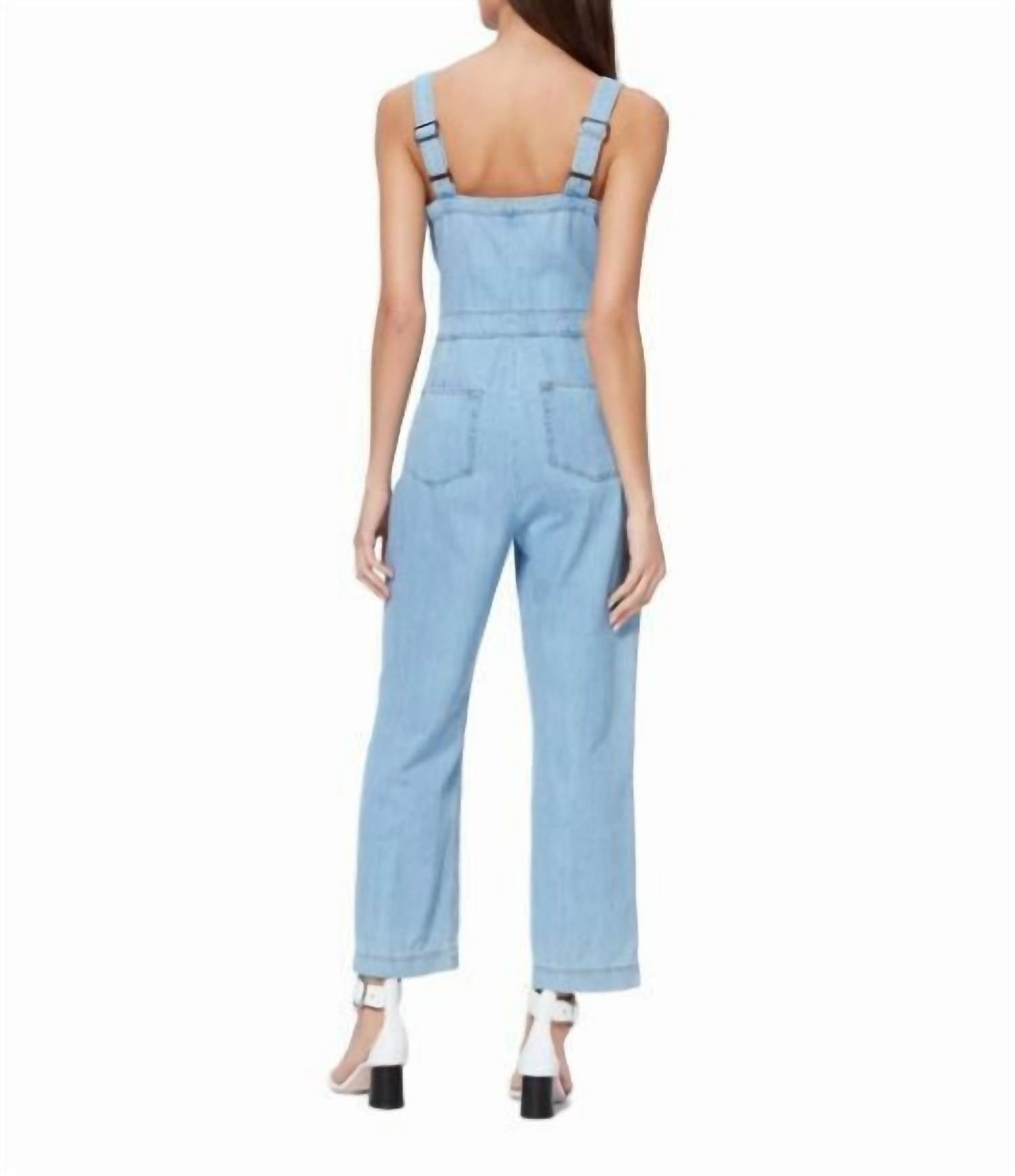The November Lace Up Crop Jumpsuit by Paige offers a trend-right touch with its sleeveless, laced-up design. Crafted from 100% cotton denim for ultimate comfort, this jumpsuit features an inseam of 25" and a front rise of 12.5". Designed with practicality in mind, it includes front slant and back patch pockets. With a leg opening at the hip measuring 13.25" and a chest width of 19", it's easy to care for with machine wash and tumble dry instructions. The jumpsuit comes in a chic blue hue, perfect for adding a stylish flair to any occasion.
