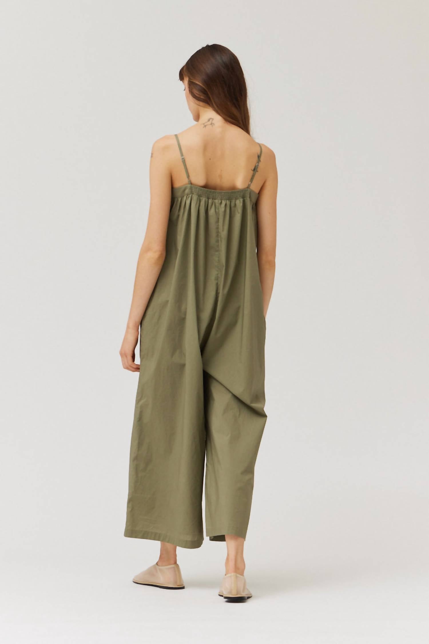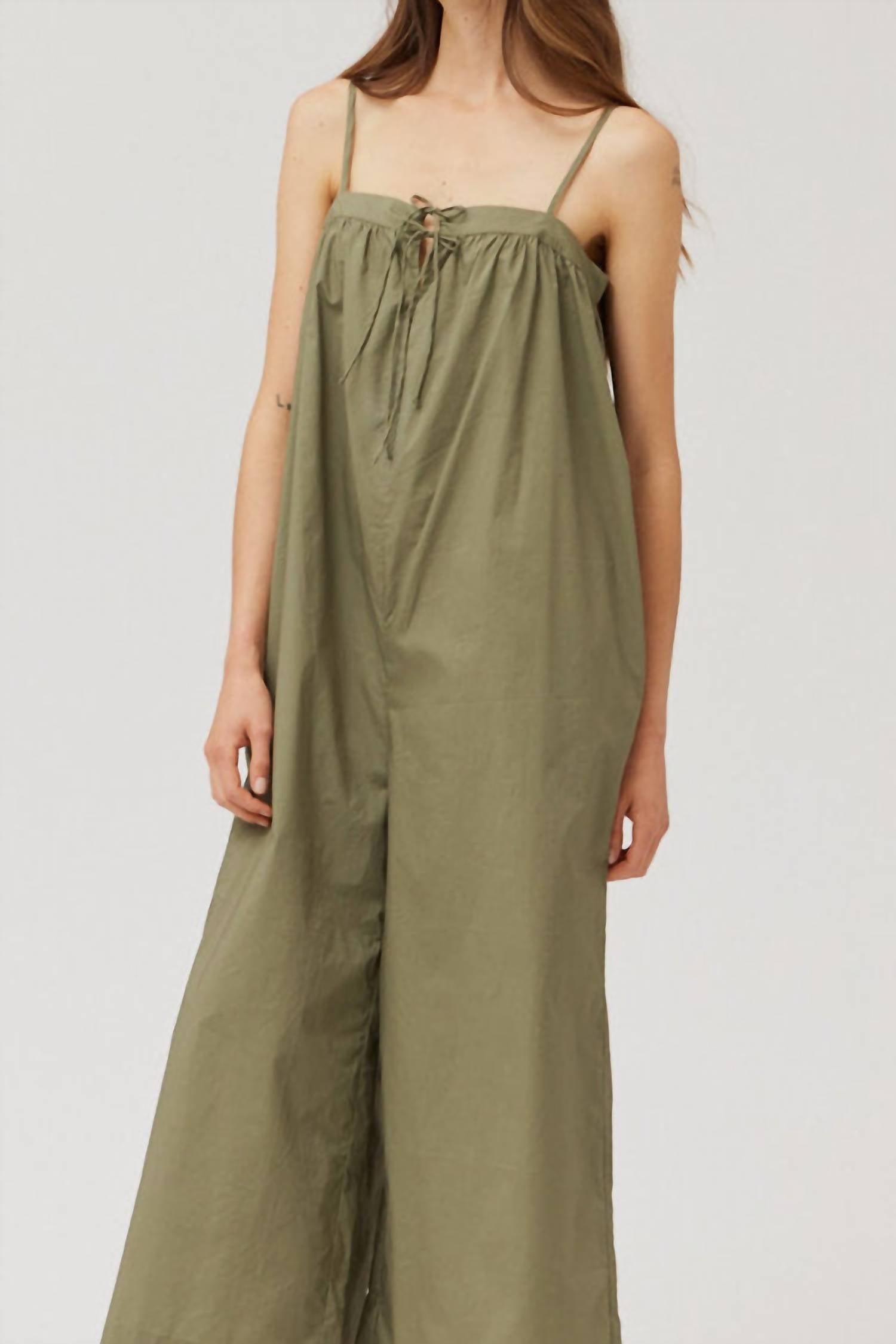 The perfect outfit choice when you you need something quick to throw on and still want to look efforlessly cool. Experience effortless style with the GRADE & GATHER Cotton Strap Jumpsuit in a serene sage color. This solid, wide-leg jumpsuit is crafted from 100% cotton, offering both comfort and a relaxed fit. It features a convenient tie closure and comes with pockets for added functionality. Imported to ensure premium quality, this flowy piece is a staple addition to any wardrobe.