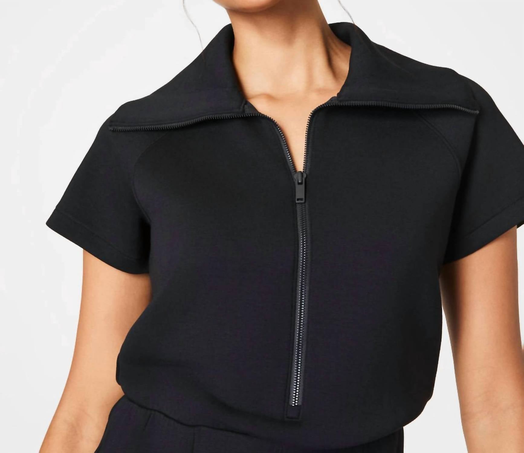 The perfect outfit choice when you you need something quick to throw on and still want to look efforlessly cool. Introducing the AirEssentials Half Zip Romper by Spanx, a perfect blend of style and comfort for the transitional season. Featuring short sleeves and a half zip collared neckline, this romper showcases a flattering elasticized waist and practical side pockets. Crafted in Spanx's signature buttery soft fabric, it comprises 47% Tencel Modal, 46% Polyester, and 7% Elastane. Closure is easy with a zip closure, making it an ideal choice for a cool and comfortable athleisure look.