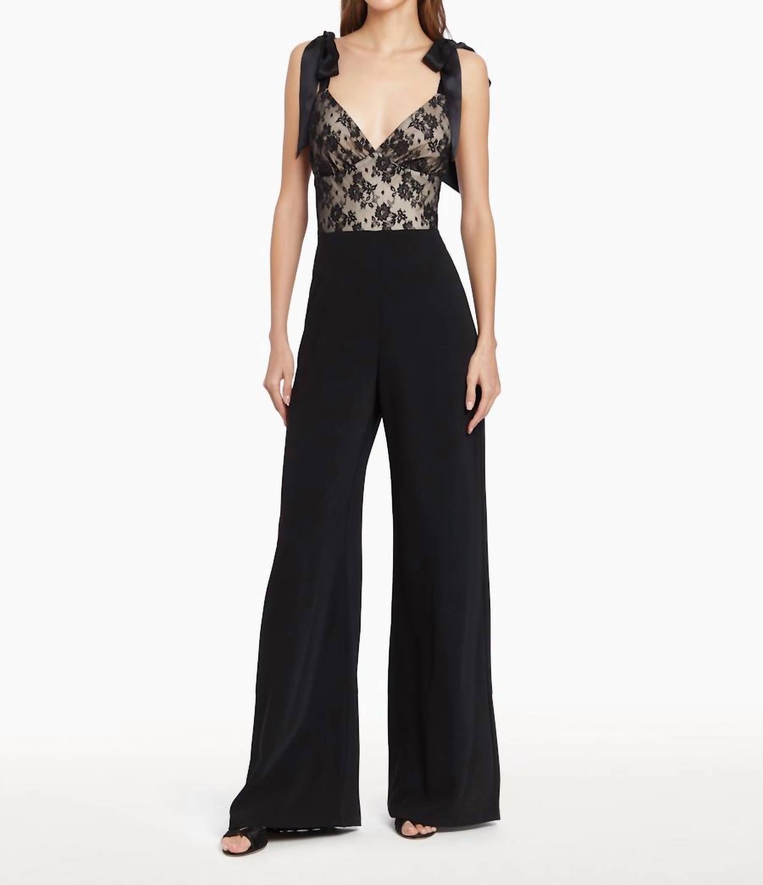 Elegant black ensemble featuring a flirty contrast bodice with a lace overlay and chic silk straps. Meticulously crafted, boasting a bodice made of 100% polyester with a 100% silk contrast. Legs composed of 78% nylon and 22% elastane. Hidden back-zip closure ensures a seamless fit. Complemented by slightly hidden smocked panels at the sides. Adjustable tie straps offer a customizable fit. Garment is partially lined. Center front length of 53 1/2 inches, a 34-inch inseam, and a 27-inch leg opening. Dry clean only.