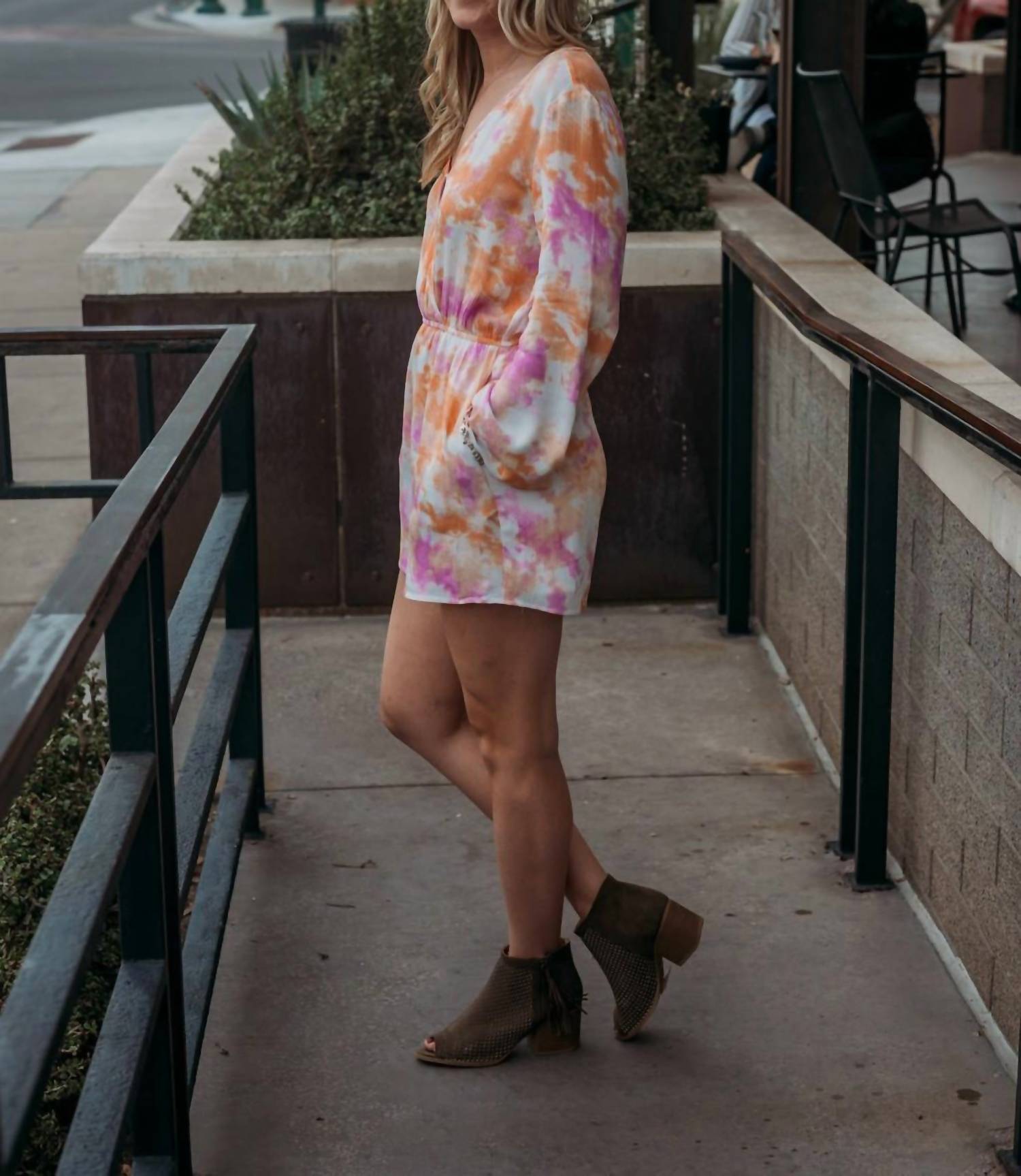 Throw it on and go! Introducing the PROMESA Tie Dye Romper, a vibrant piece perfect for your summer vacation wardrobe. This romper showcases long bell sleeves and a tie-dye pattern in magenta and orange, complete with a surplice V-neckline and an elastic waist for a flattering fit. Crafted from 100% Rayon with a cotton lining in the shorts, it features a pull-on closure for easy wear. Care for this stylish piece is simple with machine wash instructions, ensuring your romper stays fresh for every occasion. Model is 5'6", with a 34B bust and 25" waist, wearing a size small.