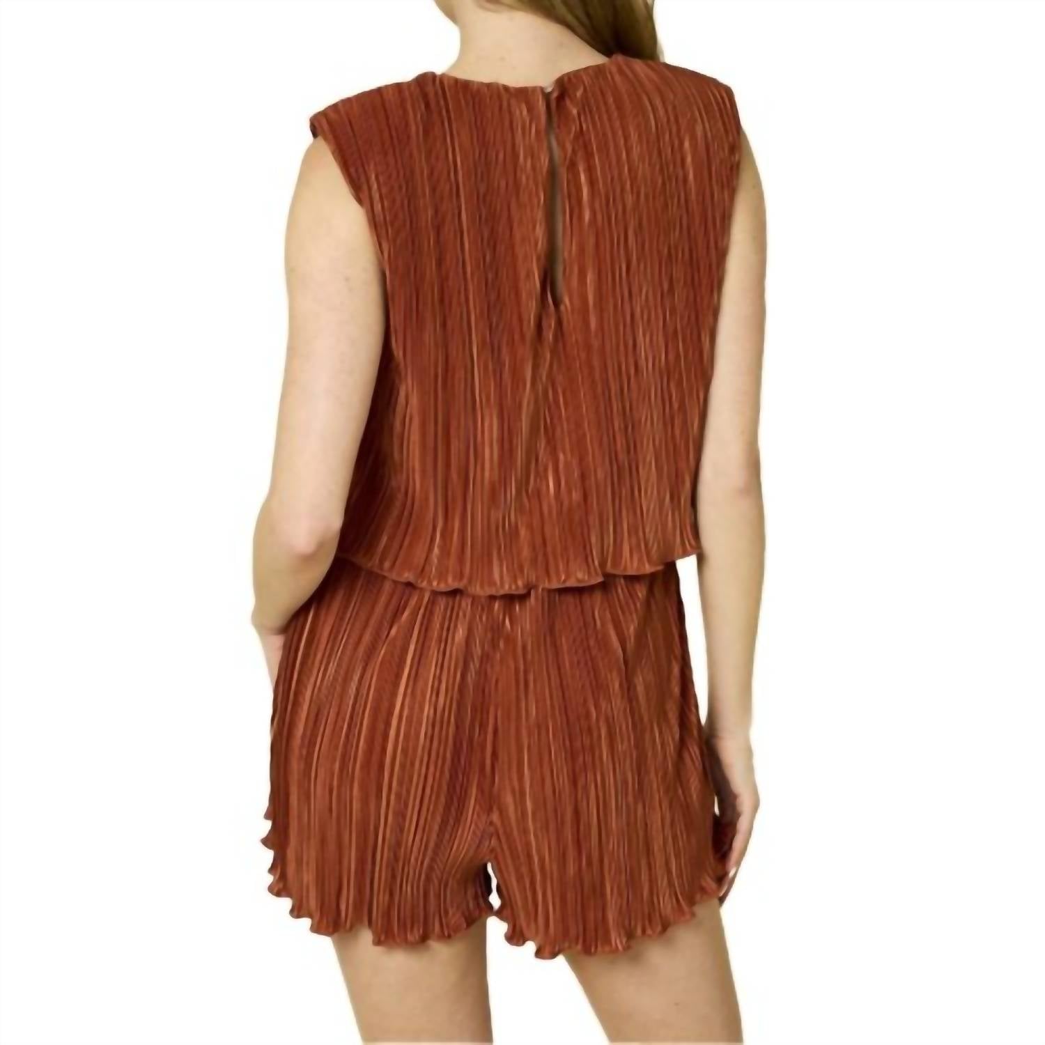 Throw it on and go! Elevate your style with the Jenesis Romper by GILLI, designed to make a bold statement in captivating Rust. Featuring short sleeves and a distinctive power shoulder, this romper showcases eye-catching pleated details. Made from 100% Polyester, it offers a comfortable pull-on closure and is crafted in China under fair working conditions. The romper runs true to size, as modeled by someone wearing a small size.