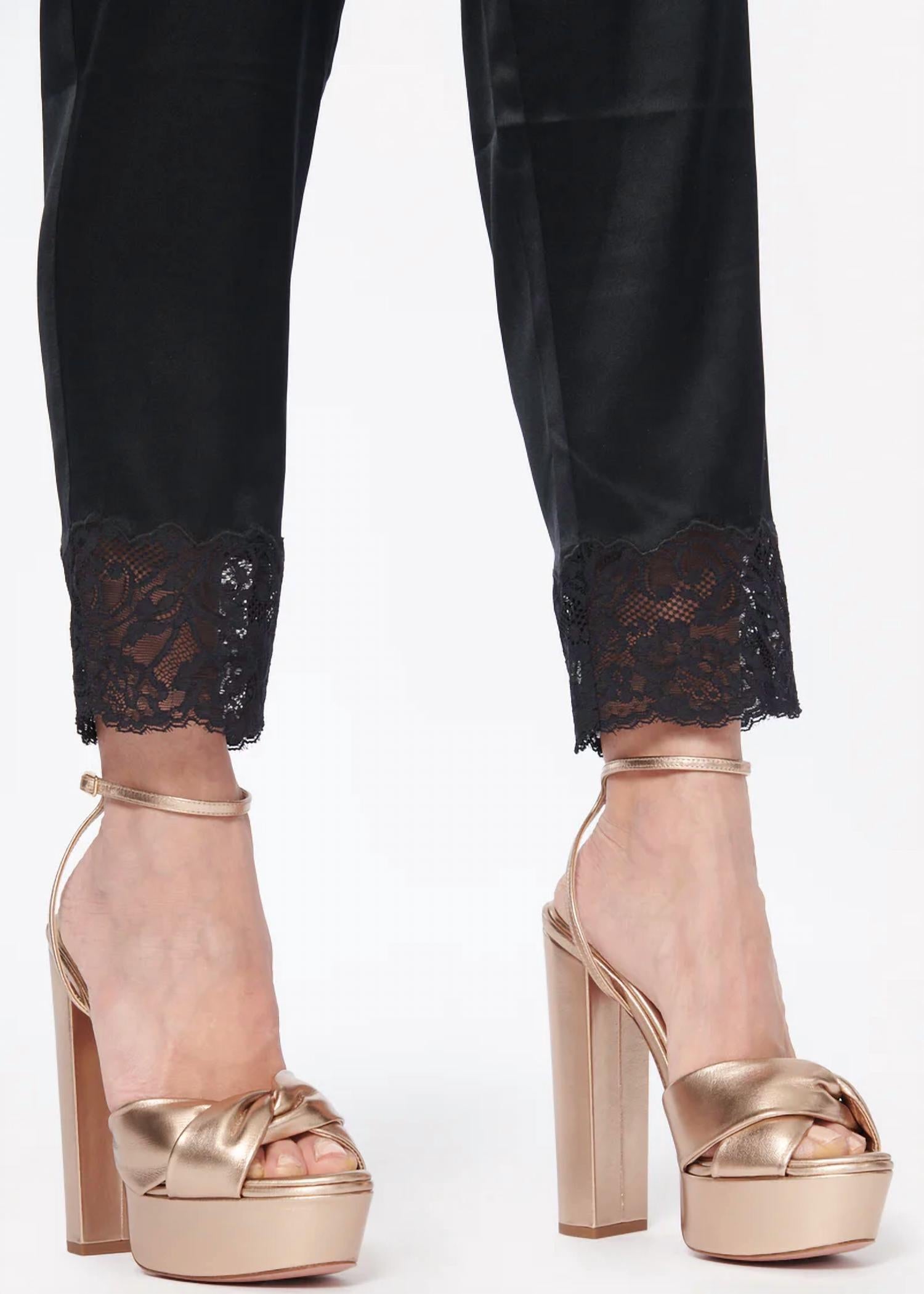 It doesn't take much for this one piece to look effortlessly cool. Add some statement jewelry to dress it up, or throw on some sneakers for a more casual vibe. Self: 92% silk, 8% spandex. Trim: 86% nylon, 14% spandex. Elastic waistband with drawstring waist tie. Adjustable shoulder straps. Side slant pockets. Back welt pockets. Lace trim. Dry clean and steam only. True to size. Model is wearing an XS. Inseam: 25".