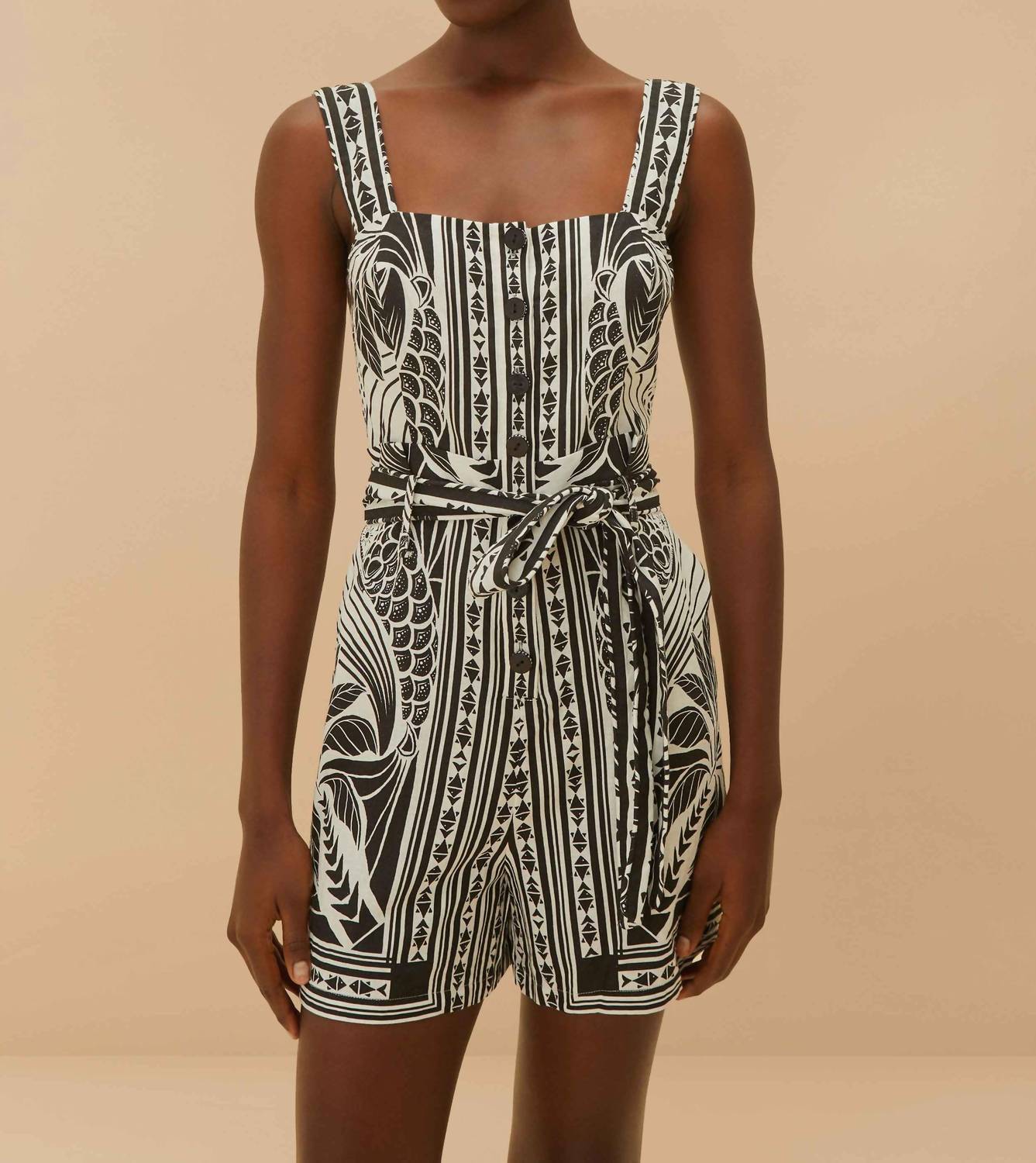 The perfect outfit choice when you you need something quick to throw on and still want to look efforlessly cool. Elevate your beach day look with the Monochrome Elegance Scarf Romper by FARM RIO, featuring a dynamic black and off-white pattern. This women’s romper is expertly crafted from a sustainable blend of 55% linen and 45% viscose, ensuring comfort and style. It showcases a playful square neckline, a flattering cinched waist, and practical pockets, all complemented by a straight leg design and button closure. For care, simply machine wash on delicate settings to maintain its elegant appeal.