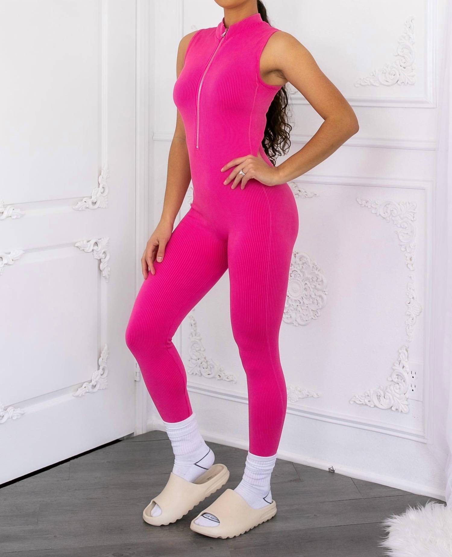 The perfect outfit choice when you you need something quick to throw on and still want to look efforlessly cool. Introducing the Mineral Wash Front Zipper Snatched Jumpsuit by SurelyMine, a stylish addition to your summer wardrobe. This women's jumpsuit, designed with a slim fit and skinny leg, is crafted from 81% Nylon, 19% Spandex for a flattering solid pink silhouette. It features a metal half zip closure for easy wear, and its solid pattern makes it perfect for holiday parties. For care, simply hand wash and line dry to maintain its bold, streetwear appeal. Model is 5’4” wearing a size small with 3.5-inch heels.