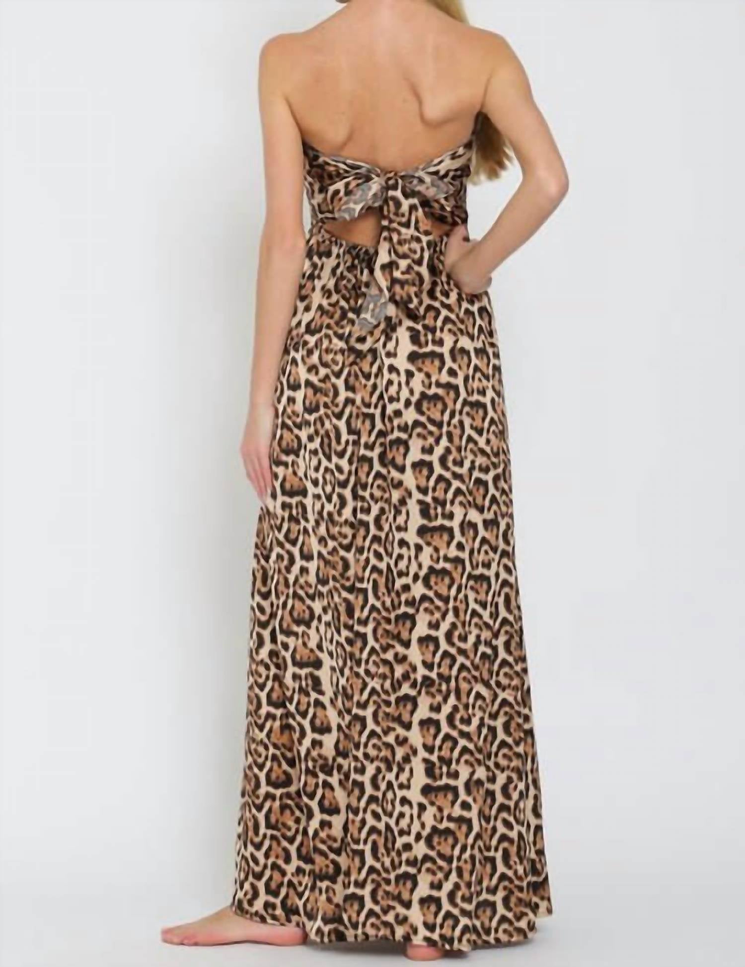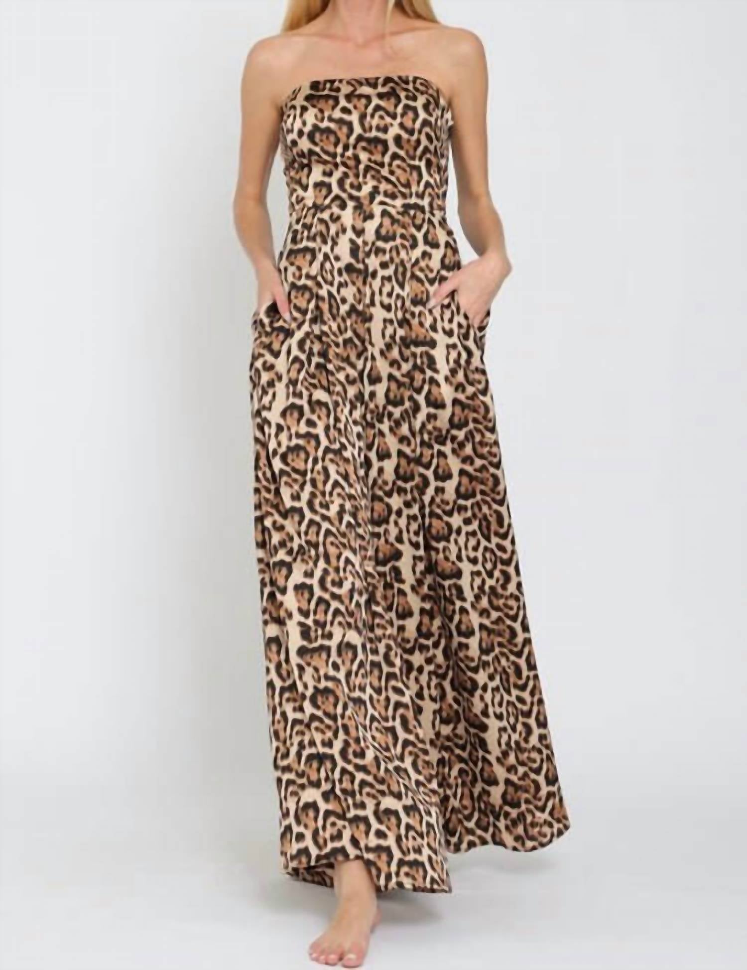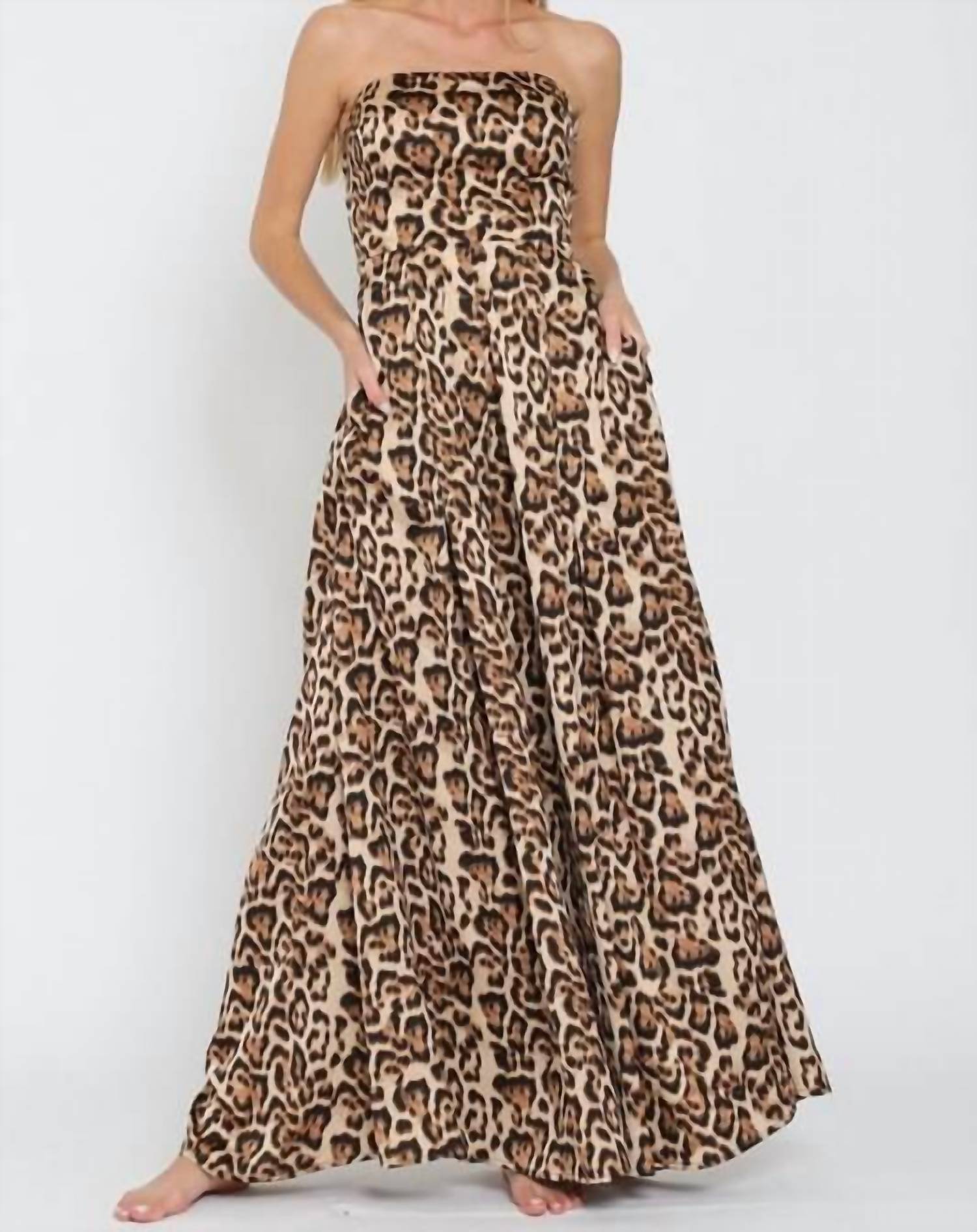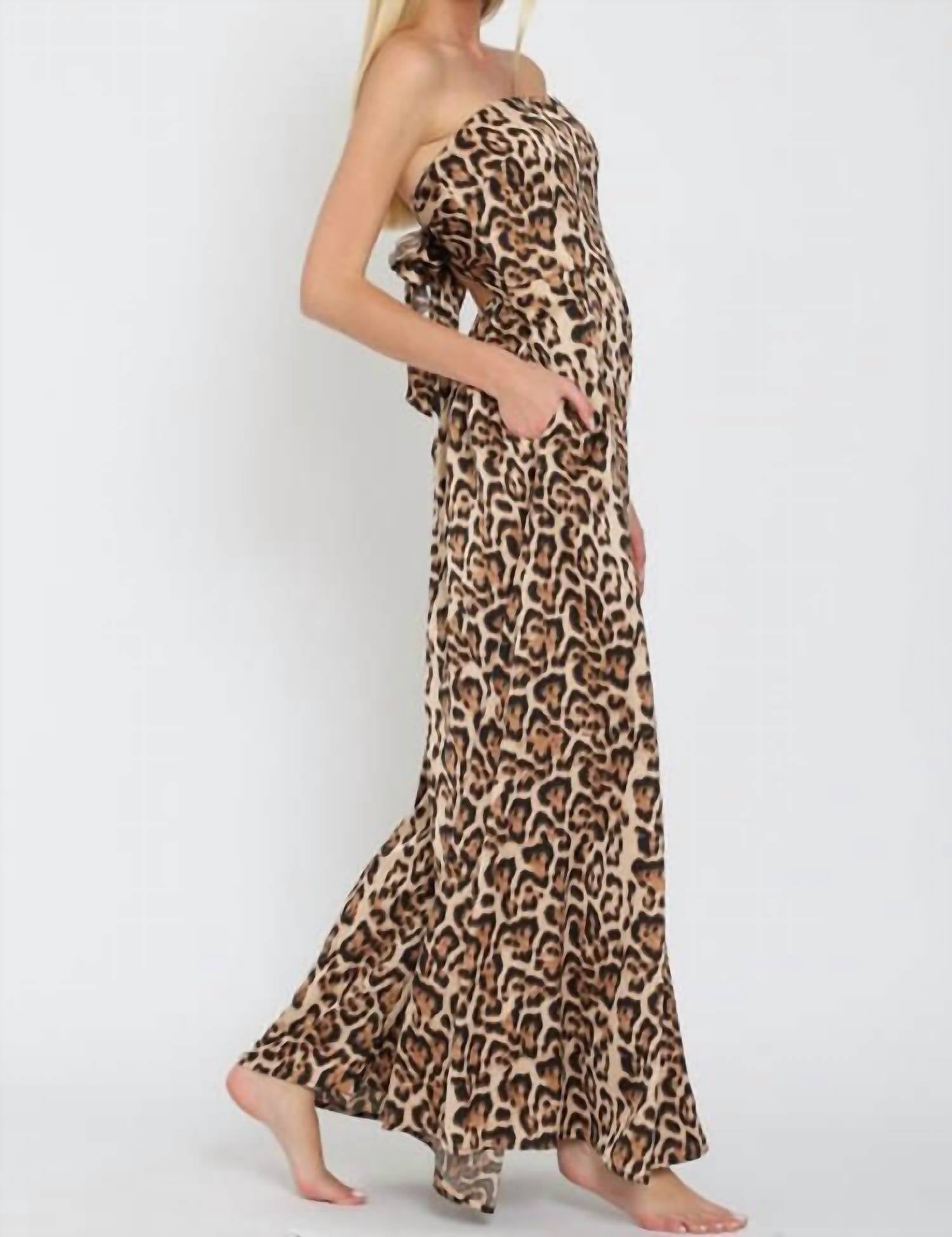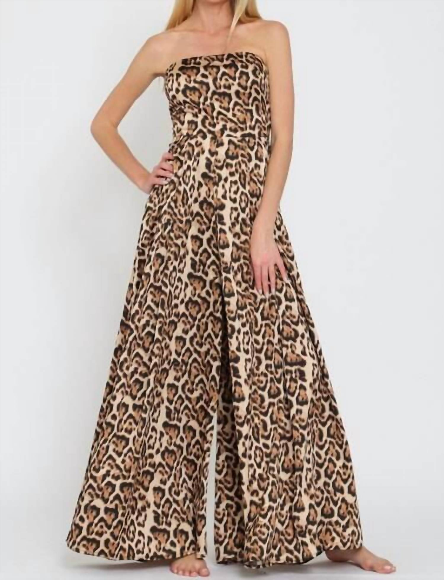 The perfect outfit choice when you you need something quick to throw on and still want to look efforlessly cool. Introducing the Linda Jumpsuit by Aakaa, a chic choice for the fashion-forward individual. This women's jumpsuit features a strapless, wide leg design in a striking leopard print, complete with convenient pockets and a playful tube tie back closure. Made from 100% polyester, it offers a true-to-size fit that is both comfortable and stylish. Ideal for any spring occasion, care for this jumpsuit with a gentle hand wash.
