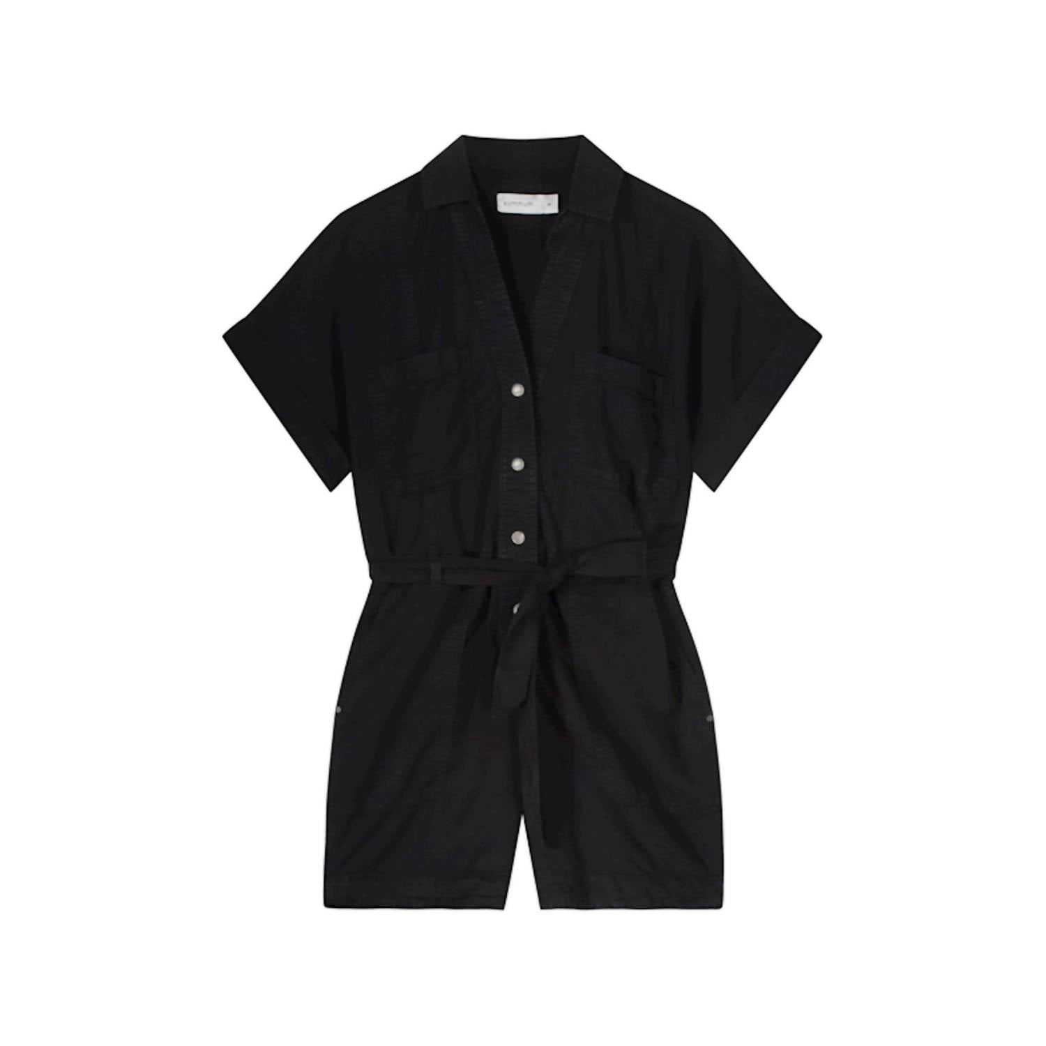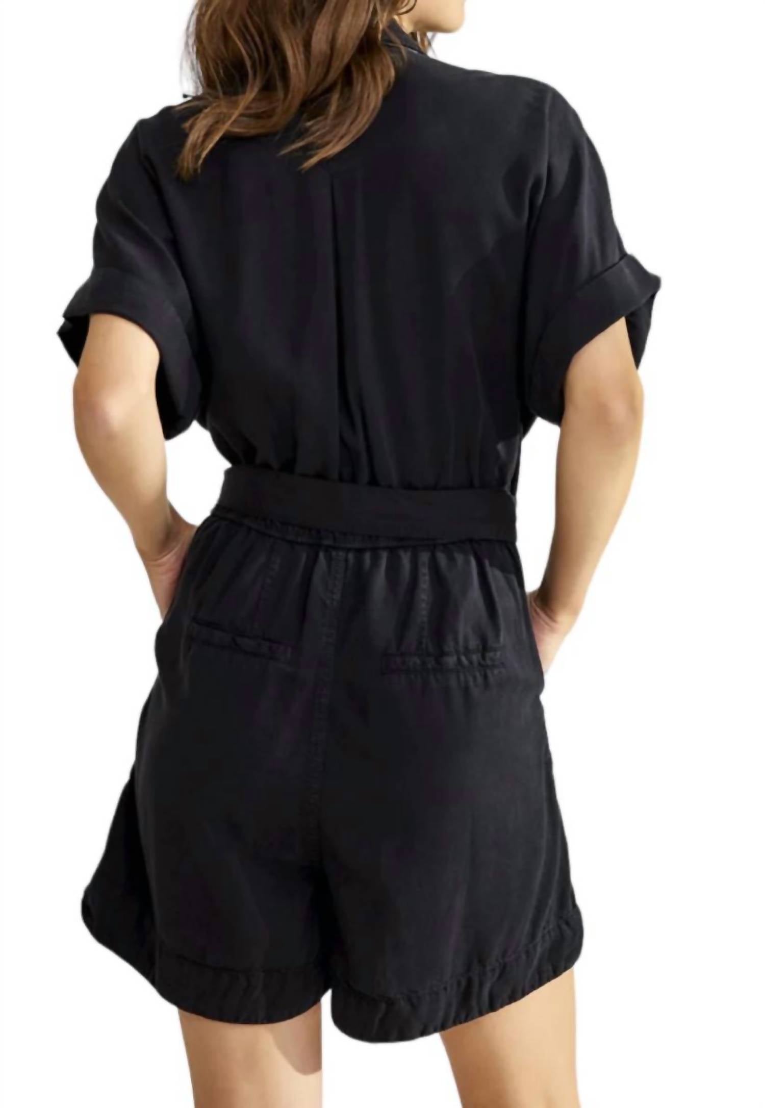 The perfect outfit choice when you you need something quick to throw on and still want to look efforlessly cool. Introducing the Breezy Tencel Playsuit by Summum, an elegant yet sturdy addition to any wardrobe. Crafted from 100% Tencel, this black playsuit features practical patched pockets and piped back pockets for a chic, utilitarian style. Its design is elevated with a v-neck, a matching fabric belt at the waist, and wide legs that offer a sophisticated silhouette. Closure is ensured with handy snap closure, completing this versatile piece ideal for effortless dressing.