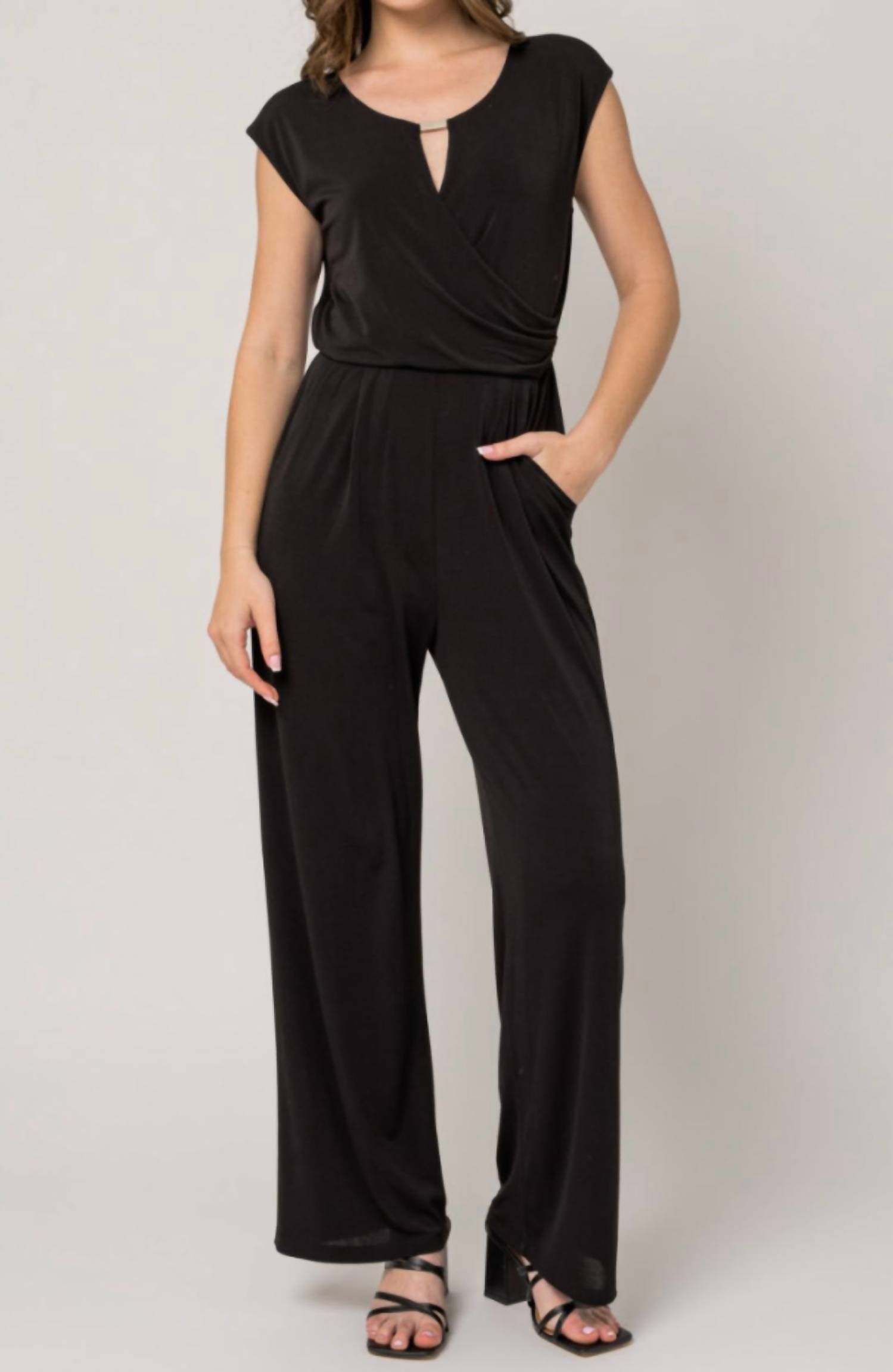 The perfect outfit choice when you you need something quick to throw on and still want to look efforlessly cool. Elevate your wardrobe with the GILLI Cap Sleeve Jumpsuit, a perfect blend of style and comfort in sleek black. This jumpsuit features flattering cap sleeves, a keyhole detail, and side pockets for added functionality. Crafted from 95% polyester and 5% spandex with a relaxed fit and wide-leg style, it conveniently closes with a button. Ideal for monochrome trend enthusiasts, this versatile piece is perfect for spring dinner parties, and special occasions.