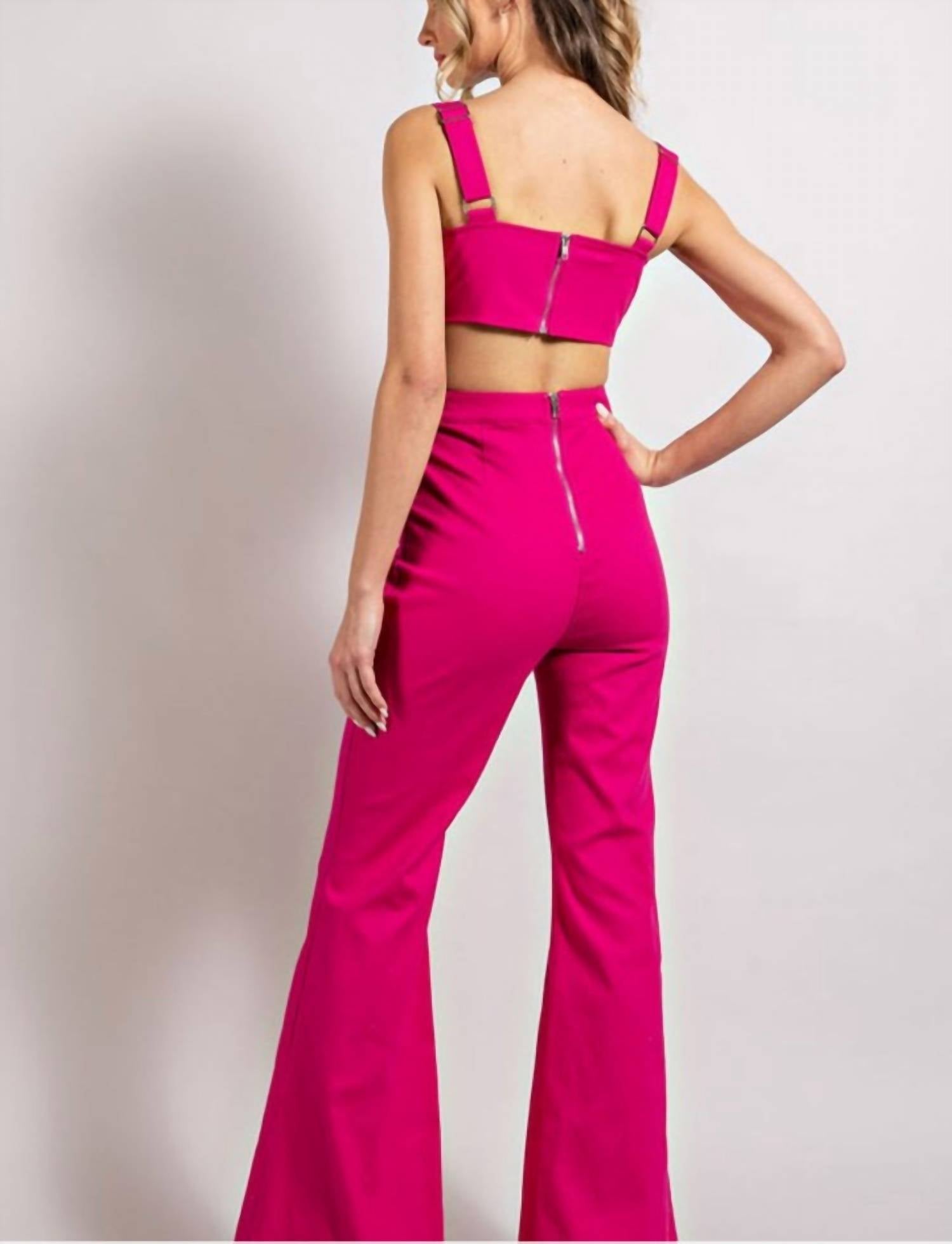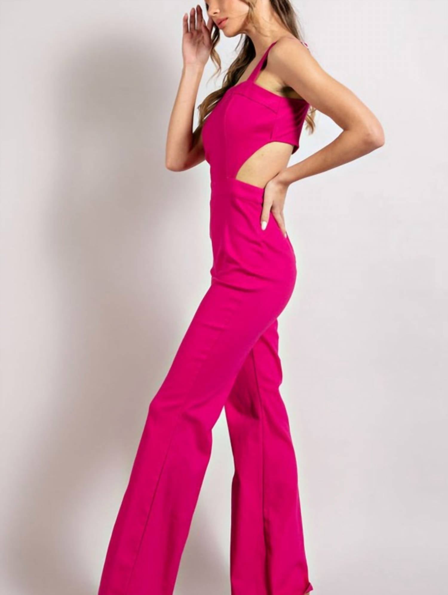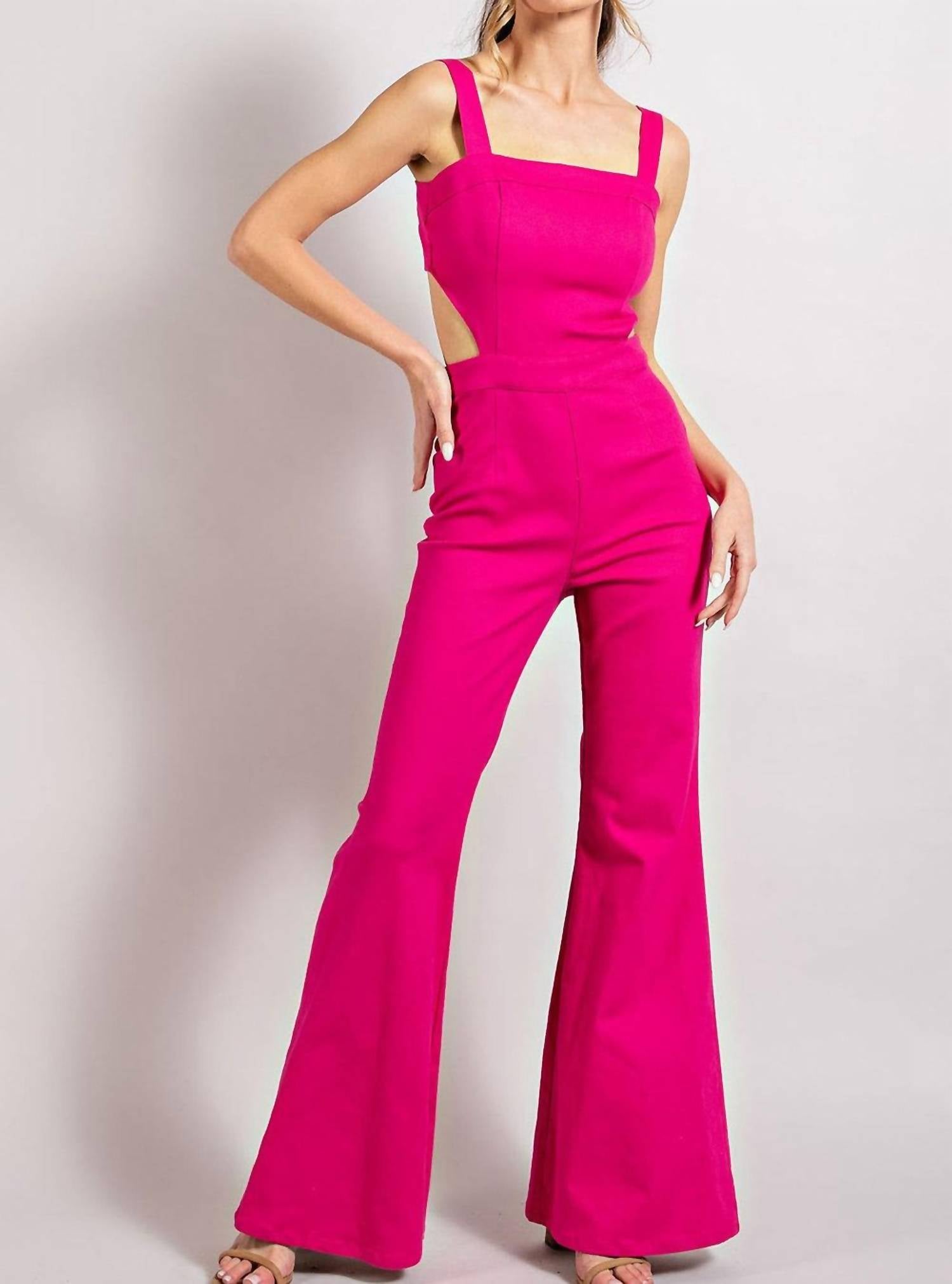 It doesn't take much for this one piece to look effortlessly cool. Add some statement jewelry to dress it up, or throw on some sneakers for a more casual vibe. This sleeveless jumpsuit features an open back design and a flared leg style, providing a perfect blend of style and comfort. Back zipper closure.