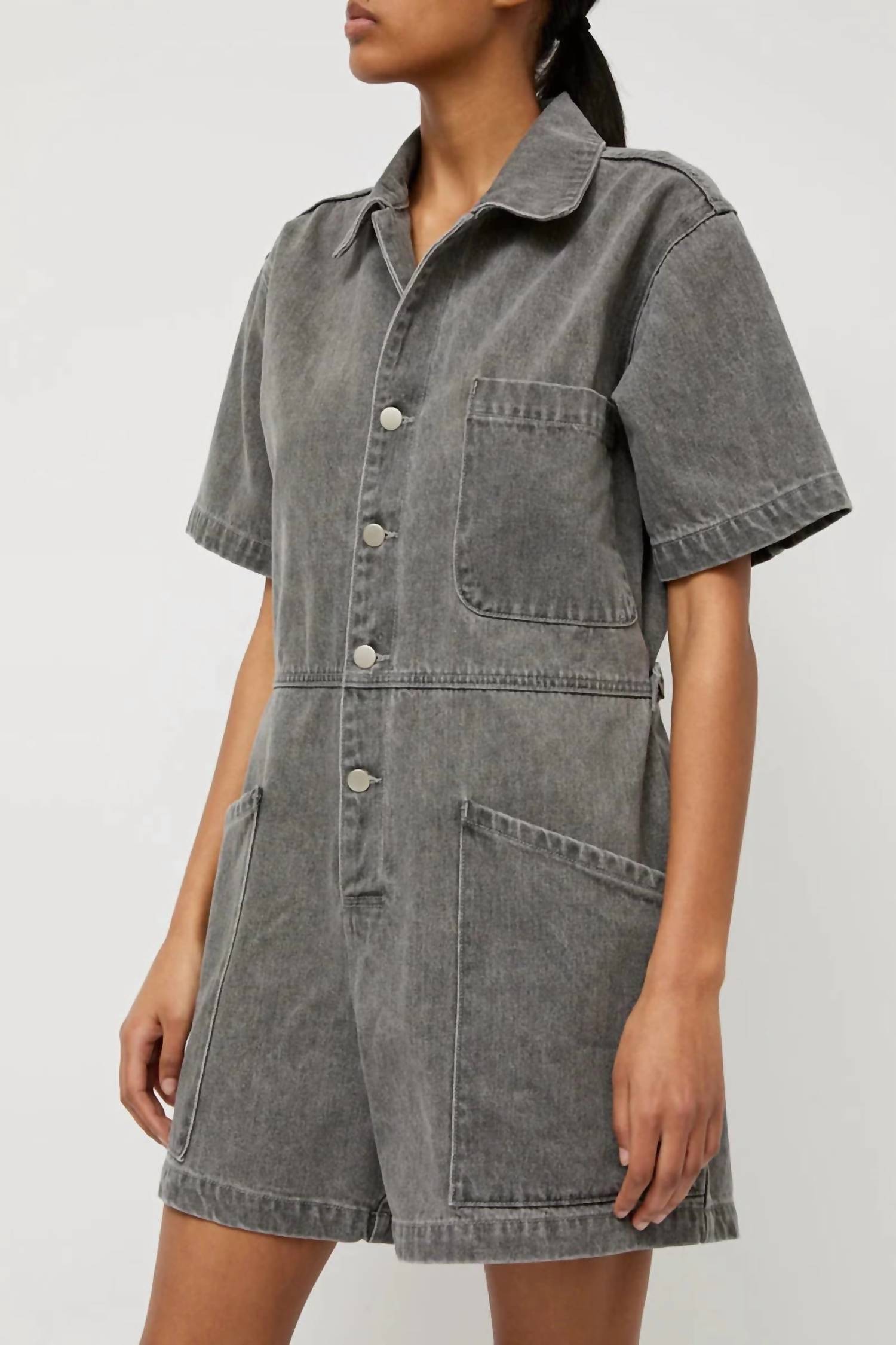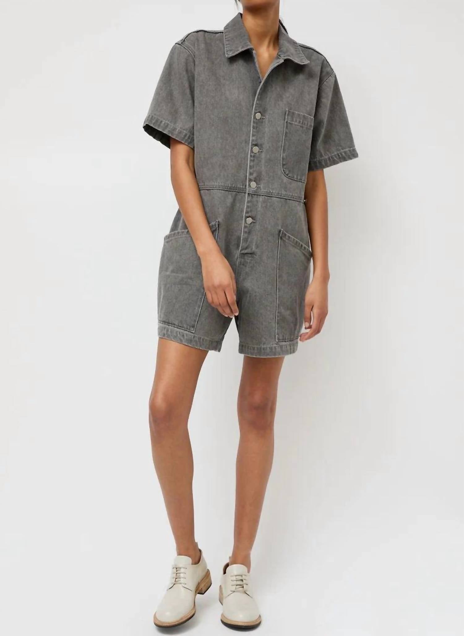 It doesn't take much for this one piece to look effortlessly cool. Add some statement jewelry to dress it up, or throw on some sneakers for a more casual vibe. Elevate your spring wardrobe with the Bree Jumpsuit by No. 6, a minimalist piece perfect for a relaxed vacation style. This solid grey jumpsuit features a high-rise waist and a relaxed fit, designed to offer both comfort and chic simplicity. Closure: Button closure. Ideal for Thanksgiving getaways and beyond, this piece combines practicality with its pocketed design and effortless style.