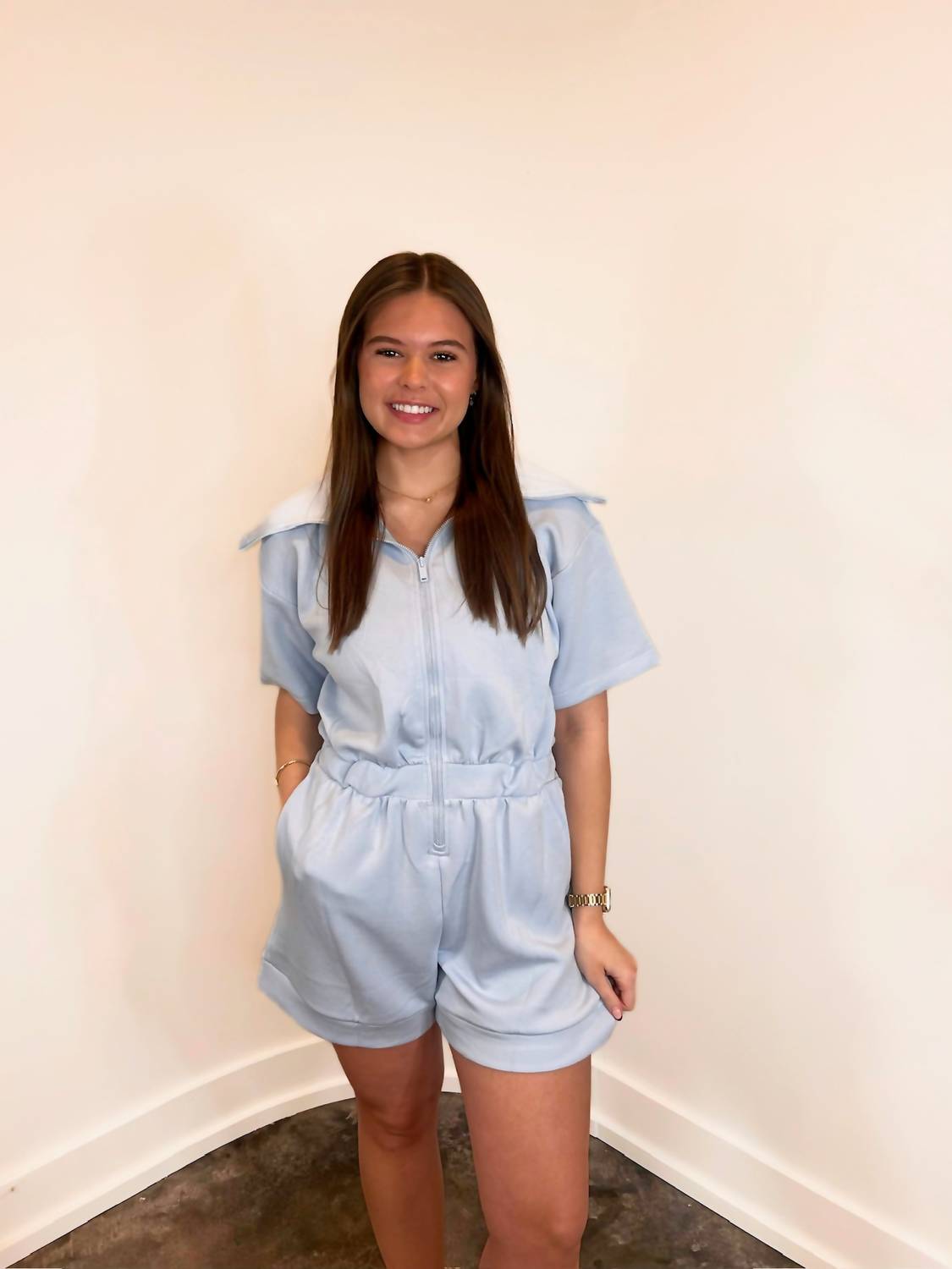 Throw it on and go! Experience the perfect blend of casual and active style with the Women's Zandra Full Zip Romper by RAE MODE in solid blue. This short sleeve romper, crafted from 48% Modal, 45% Polyester, and 7% Spandex, offers both comfort and flexibility. Featuring a zip closure and a collar neckline, this minimalist piece is ideal for the spring vacation season. Perfect for those seeking an effortlessly stylish look.