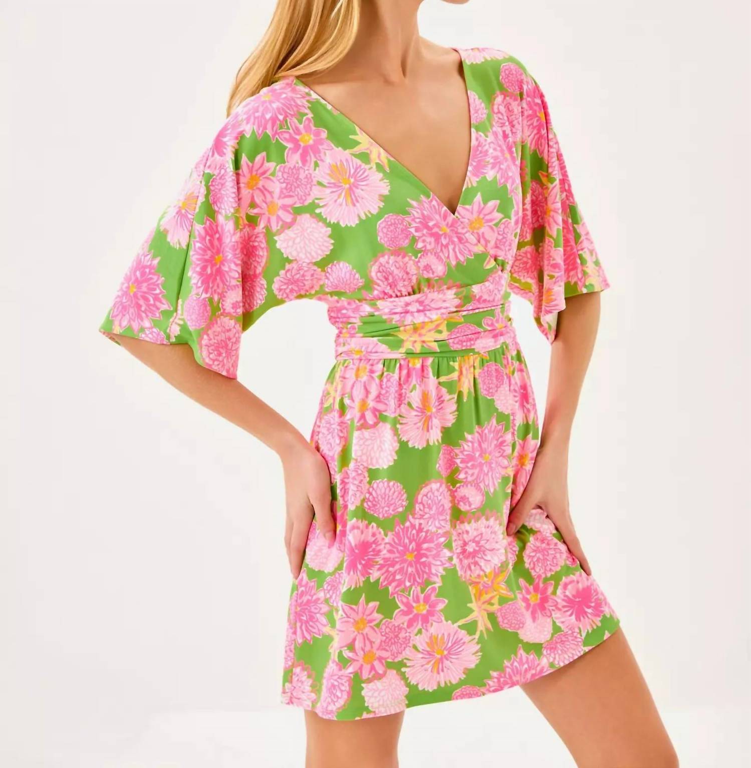 It doesn't take much for this one piece to look effortlessly cool. Add some statement jewelry to dress it up, or throw on some sneakers for a more casual vibe. Meet the Parigi Knit Skort Romper by Lilly Pulitzer, a vibrant Multi Seaside Garden print choice for those sunlit days. Featuring elbow-length kimono sleeves and a practical surplice neckline, this romper offers a bra-friendly design with a flattering ruched waistband. Material: 94% Rayon, 6% Spandex. Inseam: 3 inches. Care Instructions: Machine wash. Perfect for a vacation-ready, boho chic look.