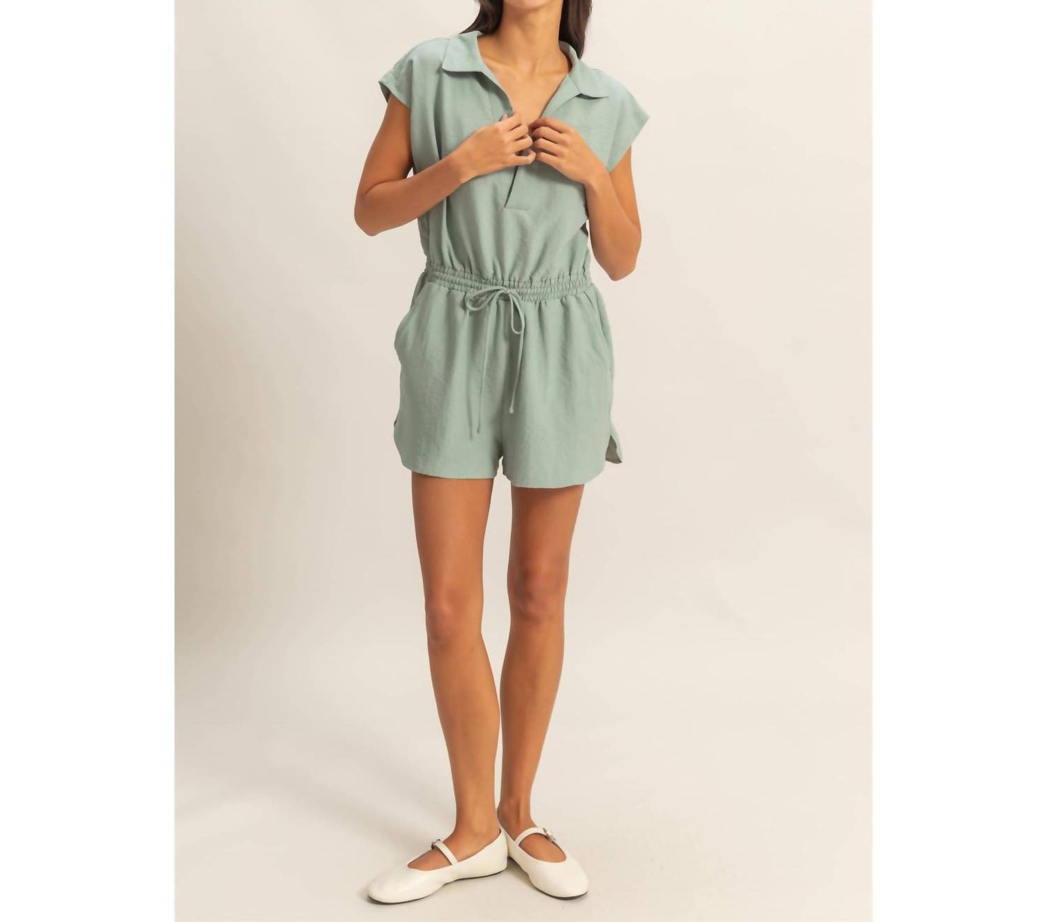 It doesn't take much for this one piece to look effortlessly cool. Add some statement jewelry to dress it up, or throw on some sneakers for a more casual vibe. Introducing the HYFVE Collared Romper, designed for sunny days and music festivals with a trendy Y2K vibe. This romper in a solid hue boasts a relaxed fit crafted from 100% Polyester, making it perfect for summer occasions. Showcasing a collar with a chic buttonless placket, it features a high-rise, tie-front elasticated waist that adjusts to your preference. A pull-on style with convenient side pockets, this piece offers ease and style for the modern woman. Model is 5'7", with measurements 32" chest, 23" waist, and 34" hips, wearing a size small.