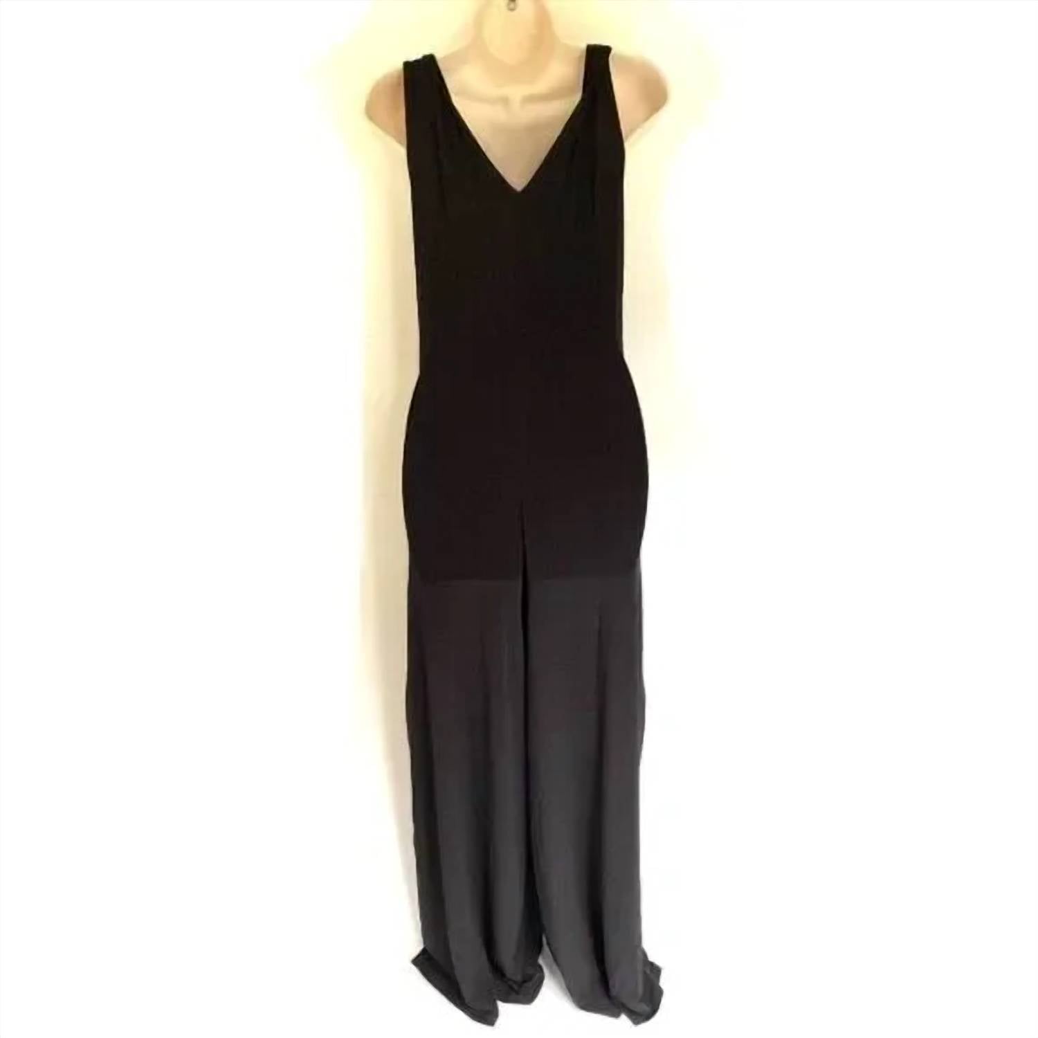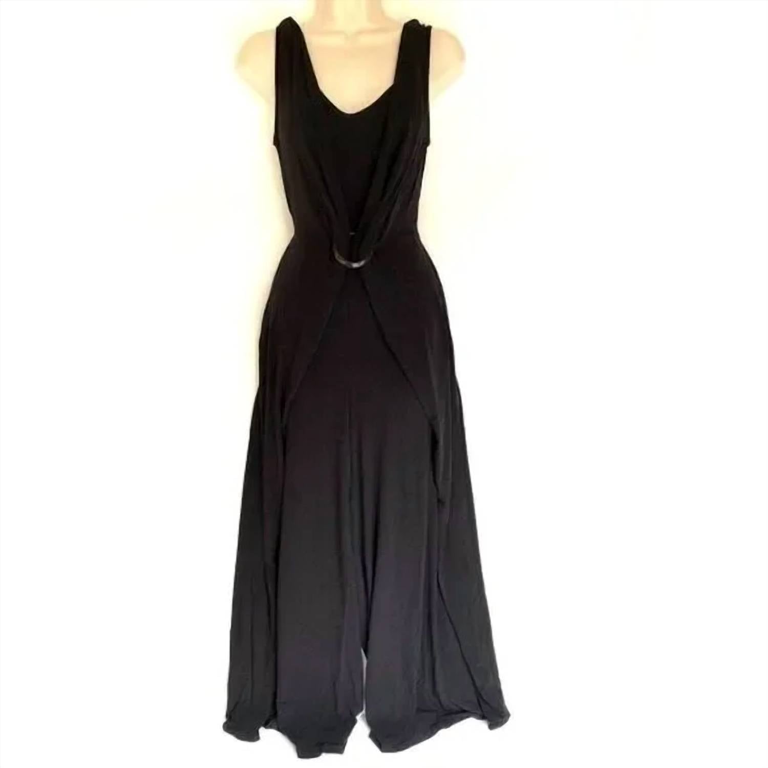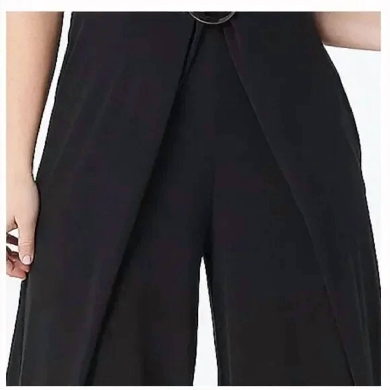 Throw it on and go! The G.I.L.I. Tank Top Jumpsuit in black is a sleeveless jumpsuit with an elastic waist and slits on the legs. It has a double V-neck neckline. When laid flat, it measures 16.5 inches from armpit to armpit, 14 inches at the waist, and has a 29-inch inseam. It is made of 94% polyester and 6% spandex.
