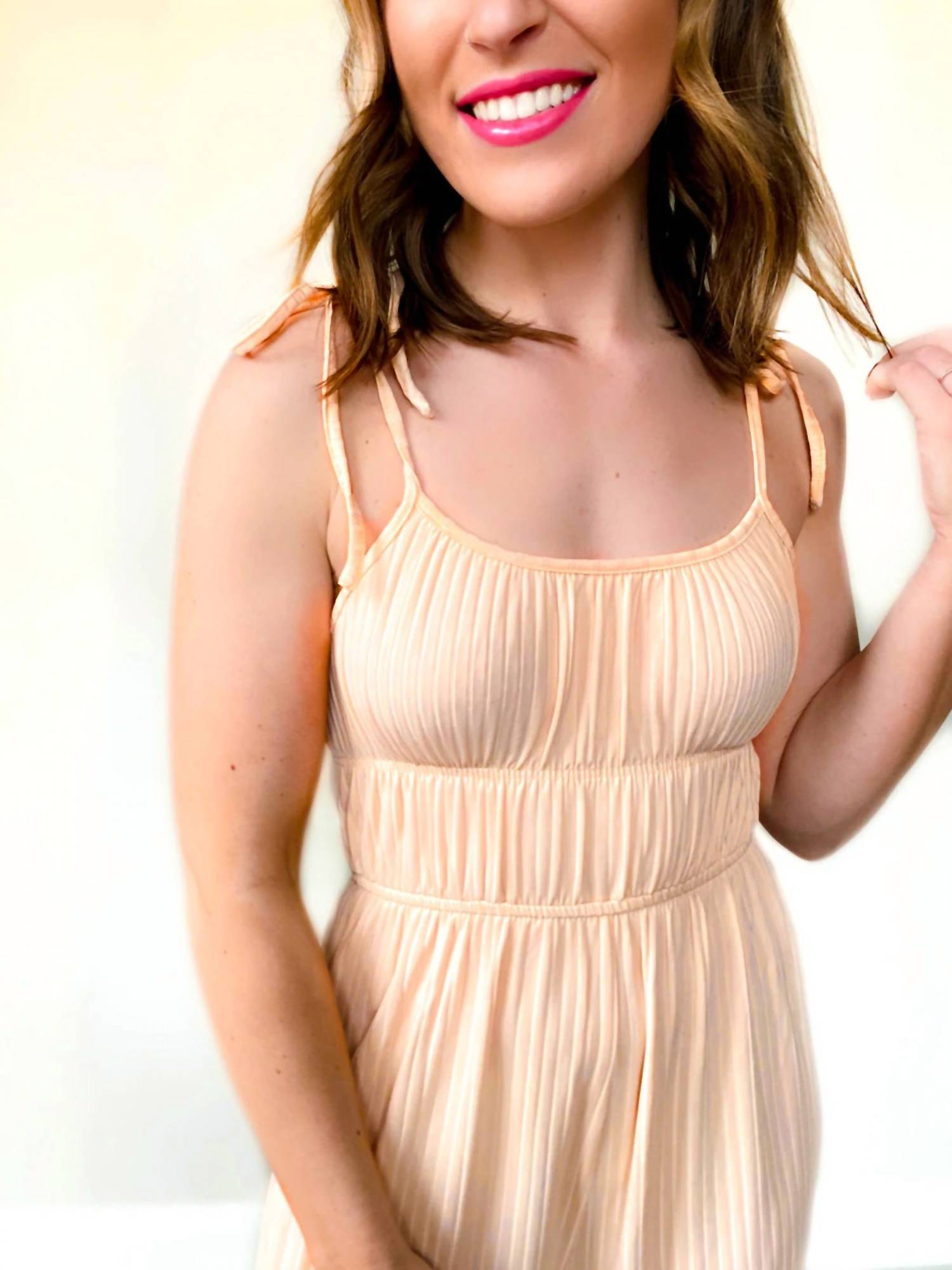 Throw it on and go! The Effortless Ribbed Jumpsuit by with love, Molly in a charming apricot shade offers both style and comfort. This women's jumpsuit features adjustable tie straps and a double empire waist for a flattering fit, while the lightweight and stretchy ribbed polyester fabric ensures ease of movement. Designed with a high-rise waist and wide-leg style, it boasts a relaxed fit that's true to size, though sizing down is suggested if you're between sizes. Closure: Tie closure.
