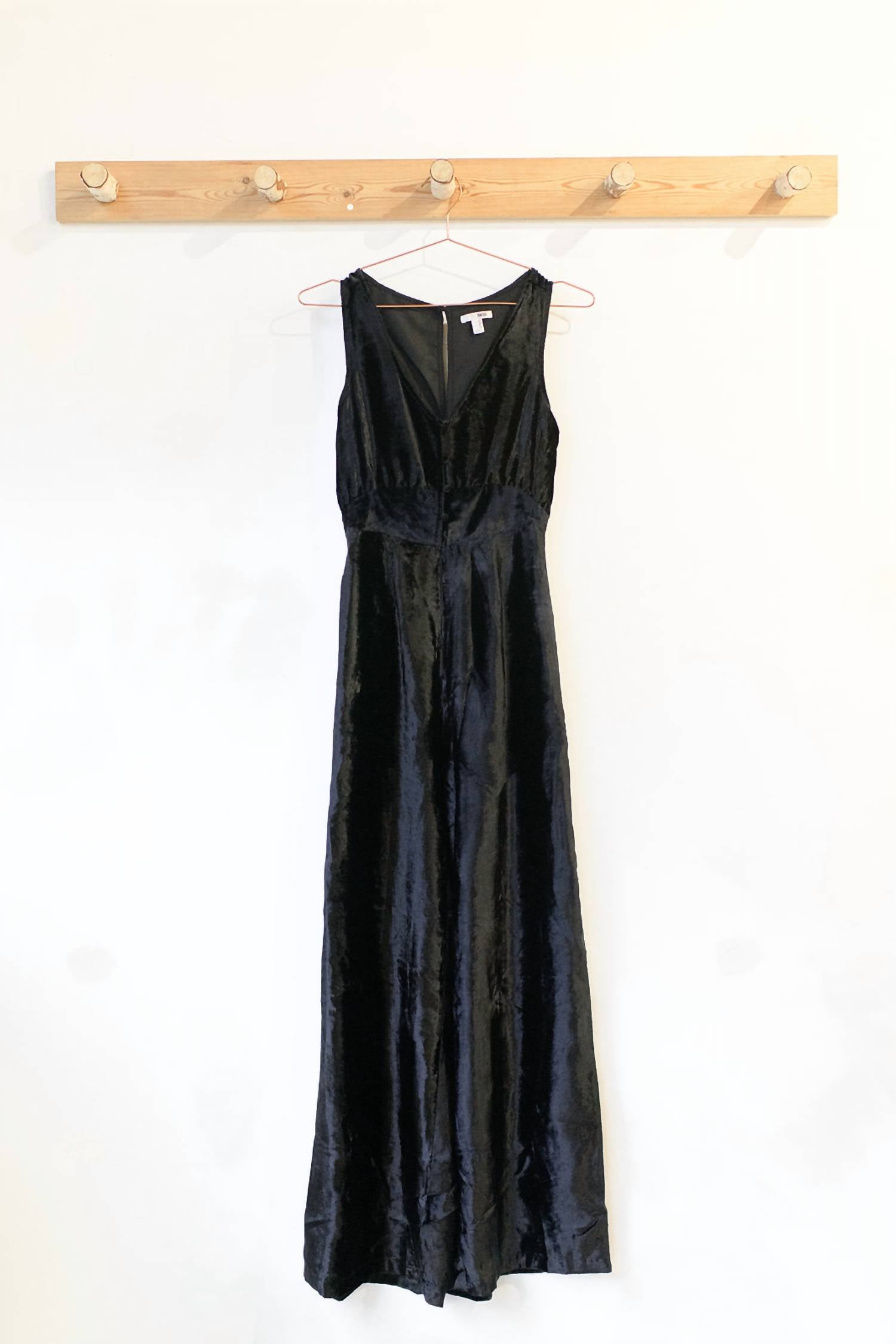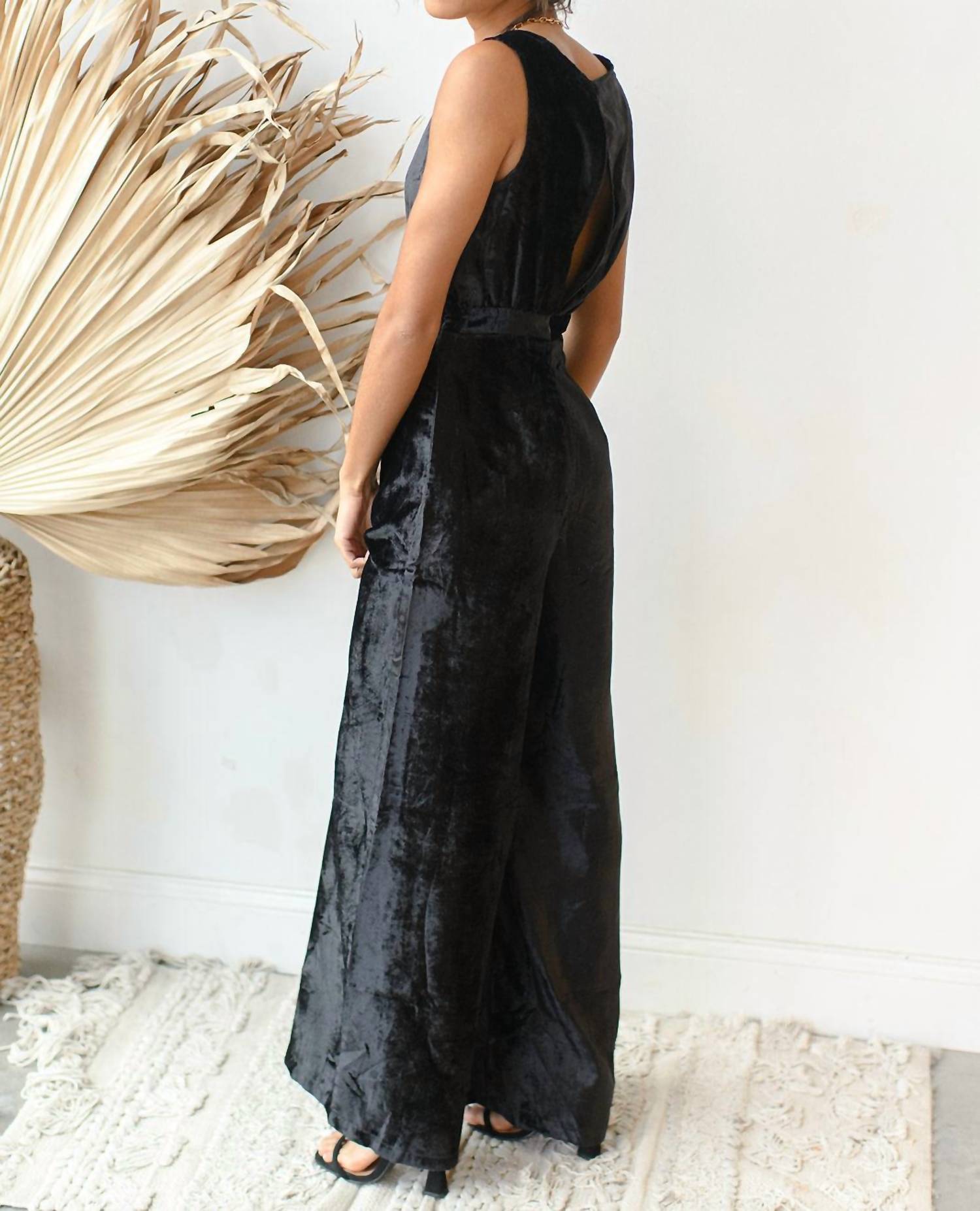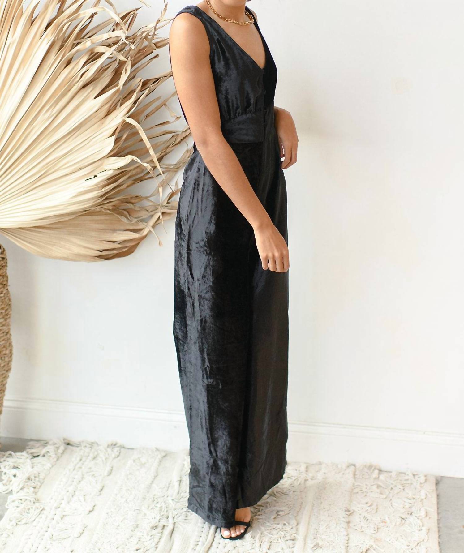 It doesn't take much for this one piece to look effortlessly cool. Add some statement jewelry to dress it up, or throw on some sneakers for a more casual vibe. Elevate your wardrobe with the Night and Daze Jumper by AMUSE SOCIETY, a stunning piece for any occasion. This sleeveless jumper features a luxurious velvet fabric and a flattering wide leg style. Designed in a solid black color, it includes button details and a back button closure for added charm. Care instructions recommend dry cleaning to maintain its exquisite look.