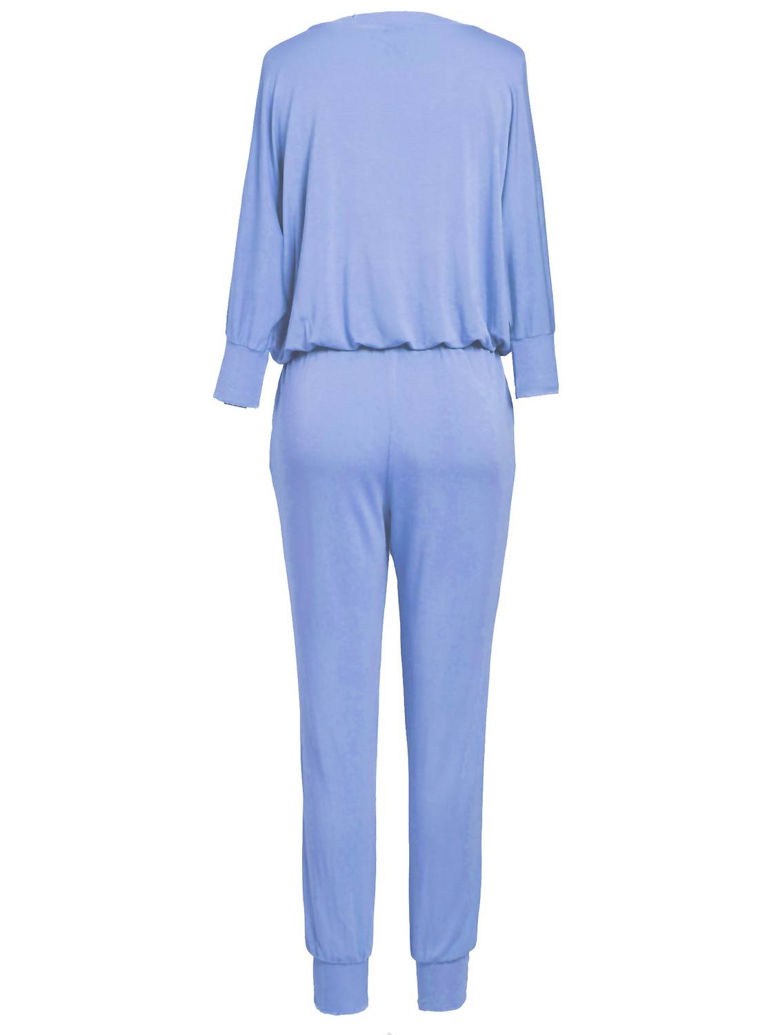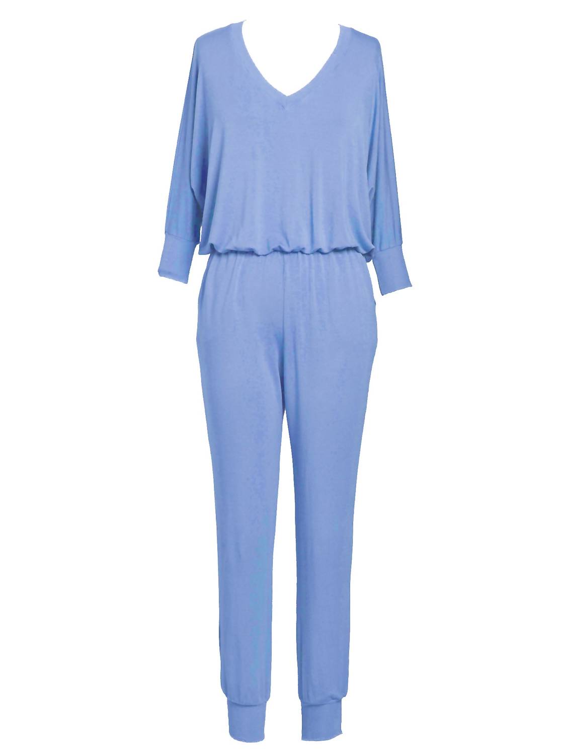 The perfect outfit choice when you you need something quick to throw on and still want to look efforlessly cool. Embrace effortless style with the Sabina Jumpsuit by LVHR, showcasing chic indigo color and a flattering design. With three-quarter sleeves and sustainable 95% micro modal, 5% spandex fabric, this jumpsuit offers comfort and stretch for every body type. The pull-on style features an elastic waist with slightly distressed ankle cuffs, made in LA. Care: Machine wash. Model is wearing a size small. Shoulder to waist length: 20", waistband: 14", inseam: 28.5".