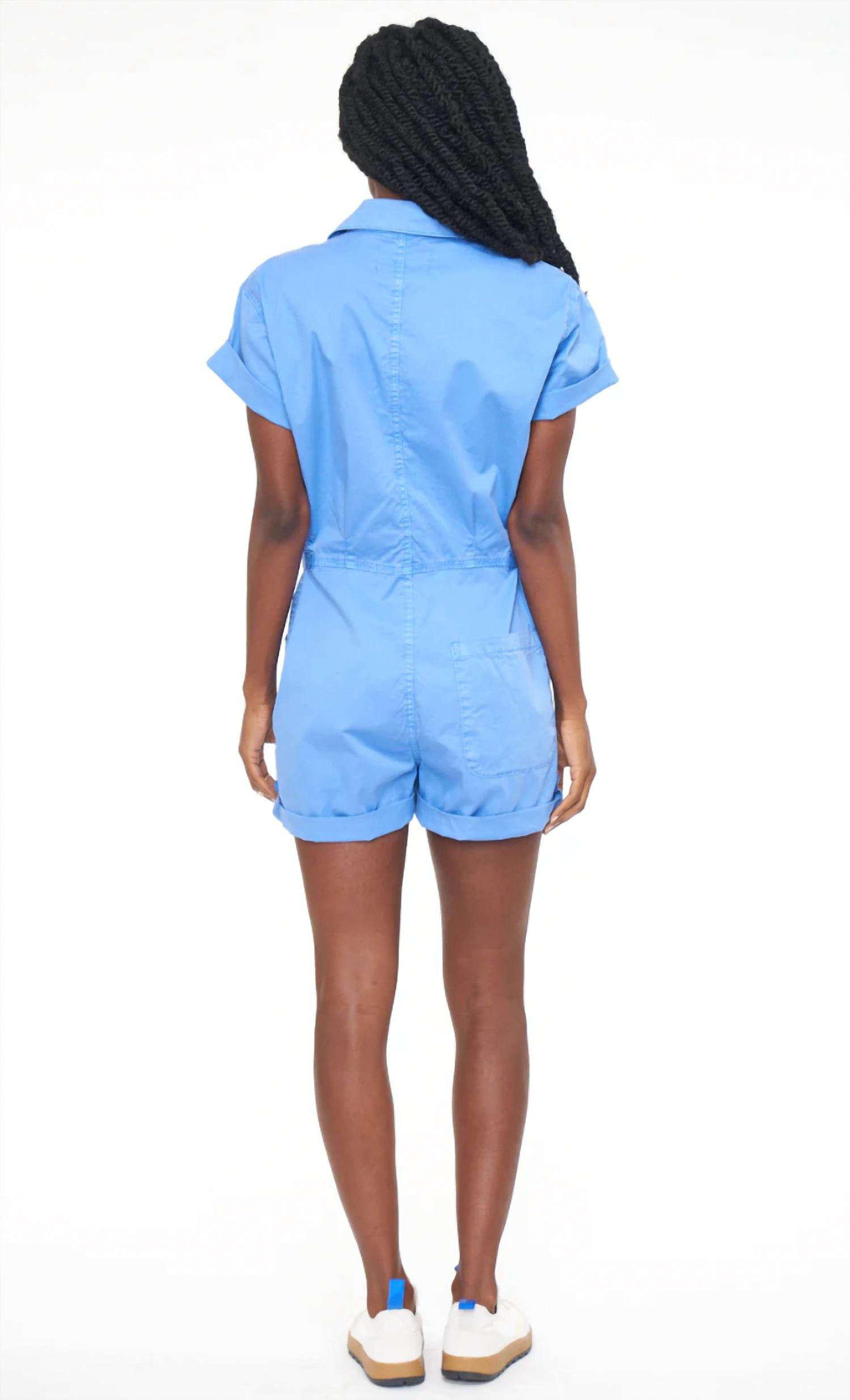 The perfect outfit choice when you you need something quick to throw on and still want to look efforlessly cool. Introducing the PISTOLA Parker Romper in captivating Azure Blue, a must-have for your summer wardrobe. This short romper is crafted from a cotton blend composed of 98% Cotton and 2% Spandex, ensuring comfort and a flattering fit. It features a button front closure, chest pockets, and waist straps for a defined silhouette, with a 2.5" inseam when cuffed. Perfect for any holiday party or 4th of July celebration, this minimalist piece is machine washable for easy care.
