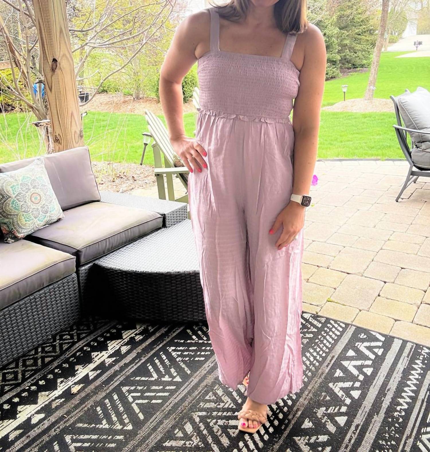 Throw it on and go! Elevate your summer style with the Smocked Wide Leg Flowy Jumpsuit by Hem & Thread, a perfect blend of comfort and elegance in a striking purple hue. Featuring adjustable straps for a customizable fit, this jumpsuit is composed of 80% rayon and 20% polyester, offering a breathable and stylish option for any holiday party. This women's jumpsuit showcases a high-rise waist and wide leg design, providing a minimalist and patterned aesthetic that suits any Thanksgiving occasion. Closure: Pull-on.