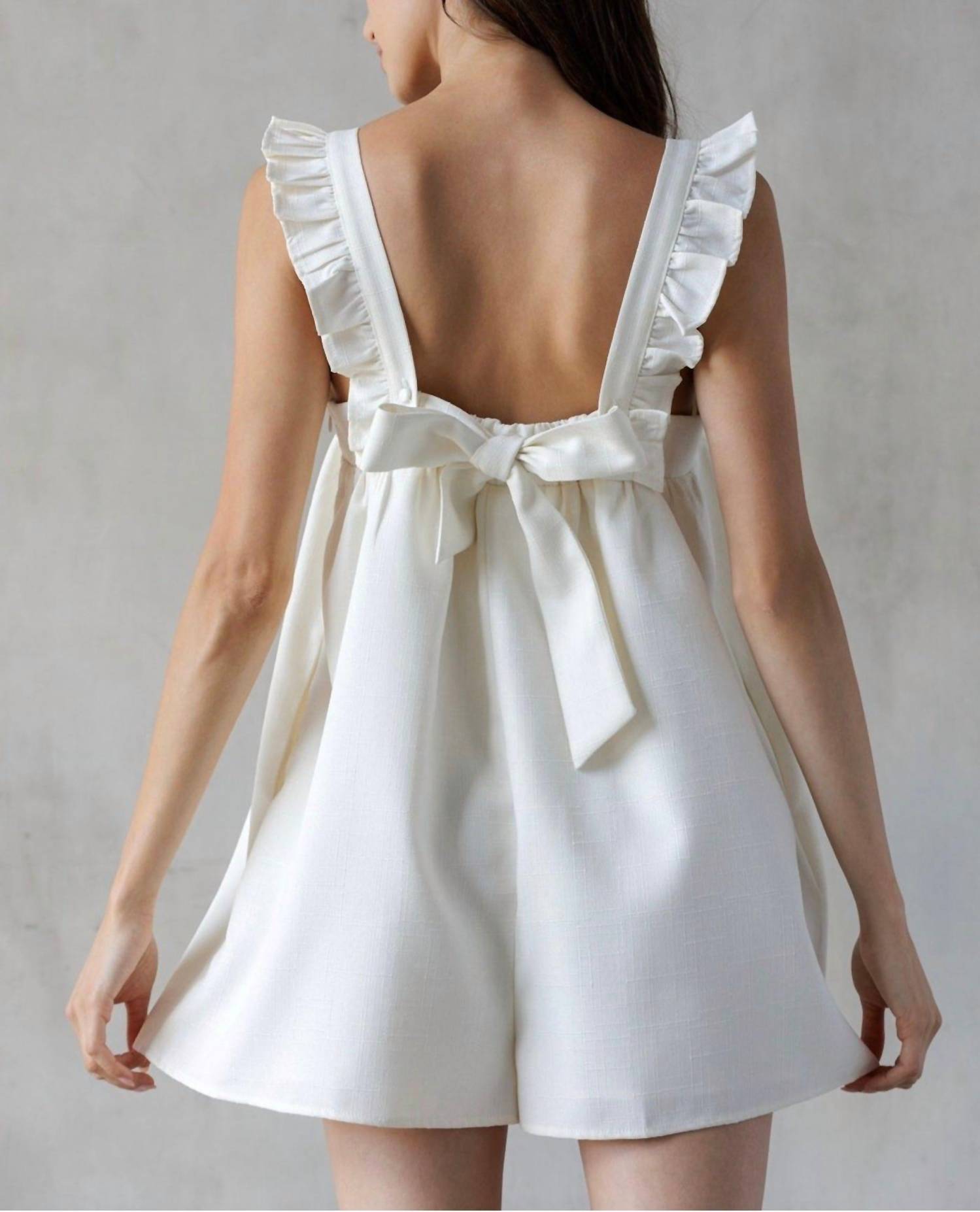 Throw it on and go! Meet the Celia Ruffled Strap Romper by STORIA, a chic summer essential in elegant ivory. Made from breathable cotton, it features flared legs and a relaxed fit, perfect for any casual occasion. The romper includes ruffled straps with a convenient tie closure at the back and side pockets for added practicality. Care instructions recommend hand washing and laying flat to dry.