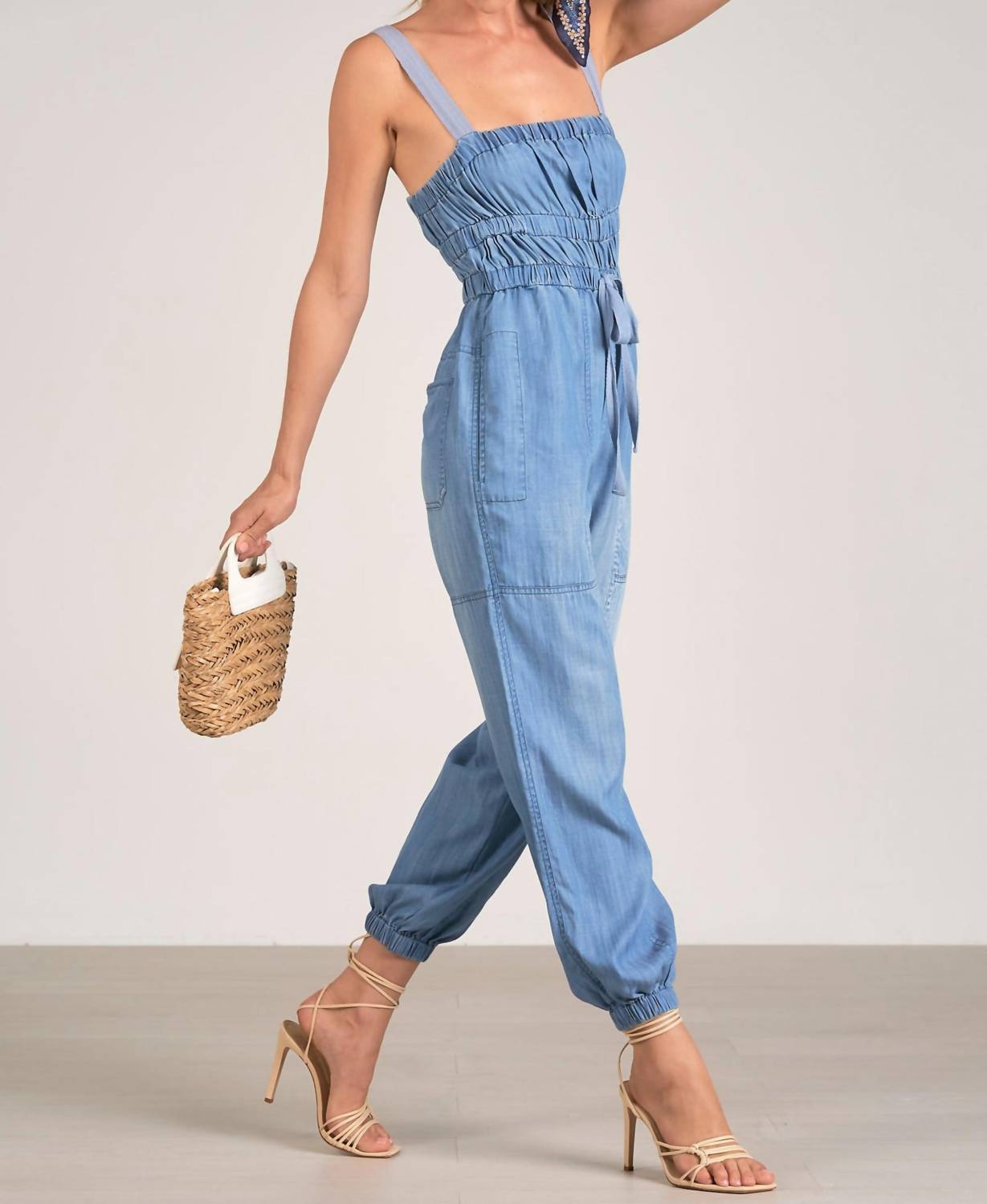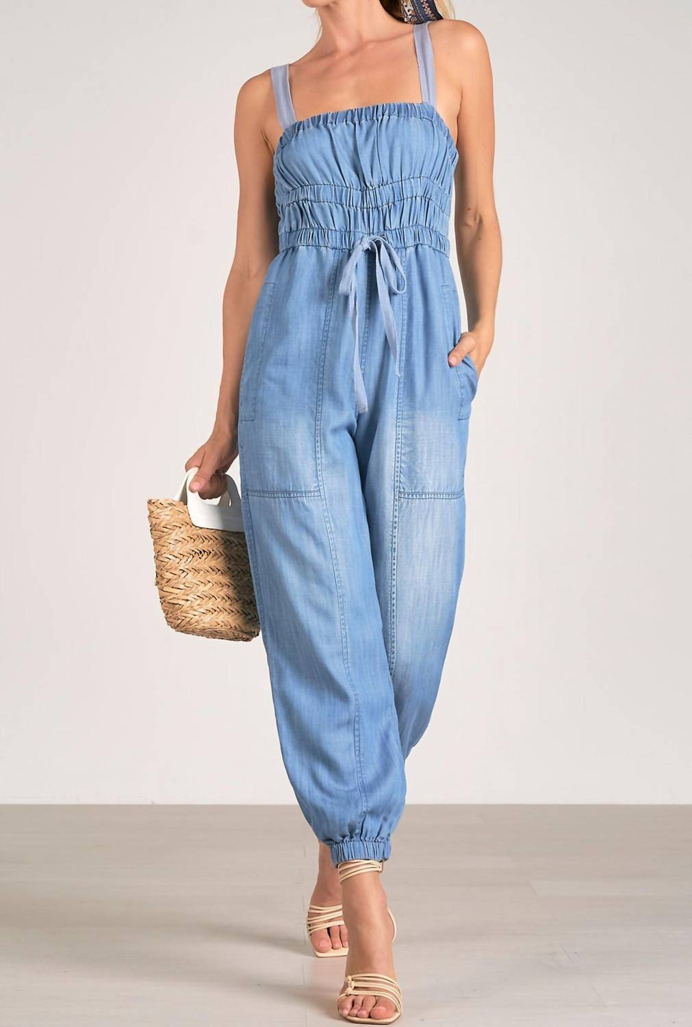 The perfect outfit choice when you you need something quick to throw on and still want to look efforlessly cool. Denim Tank Jumpsuit – Light Blue WashStep into summer with effortless confidence in our Denim Tank Jumpsuit. Crafted from luxuriously soft Tencel fabric, it delivers the perfect mix of comfort, style, and versatility. Designed with a jogger-style bottom and a flattering ruched waist with a tie, this piece effortlessly enhances your shape while keeping you cool and relaxed. Functional front and back pockets add a casual, laid-back touch, while adjustable, removable straps let you customize your look. Pair it with strappy sandals or wedge sneakers for a chic, easygoing outfit you’ll love all season long.Details:Soft, breathable Tencel fabricJogger bottom and tank-style topRuched waist with tie detailFront side and patch back pocketsAdjustable, removable strapsTapered ankle for a flattering fitLight blue washRuns small — size up for a relaxed fit