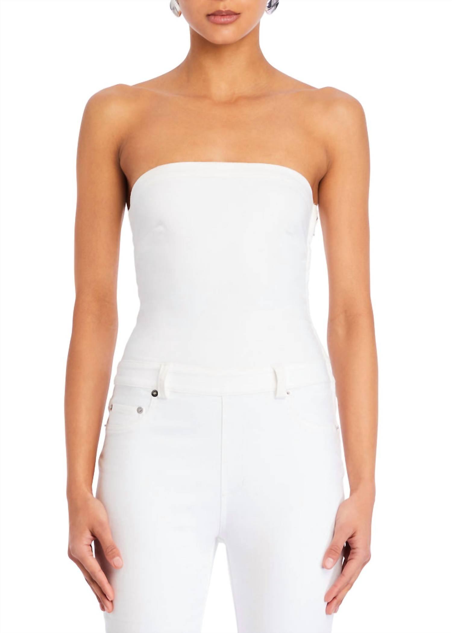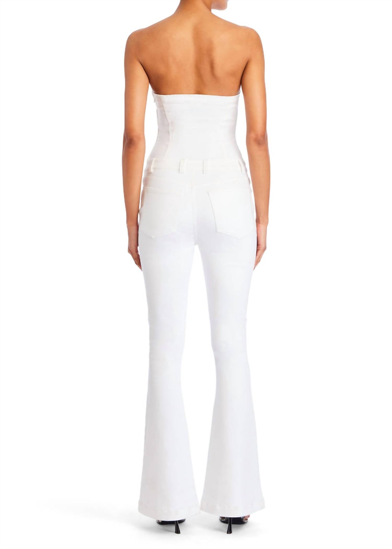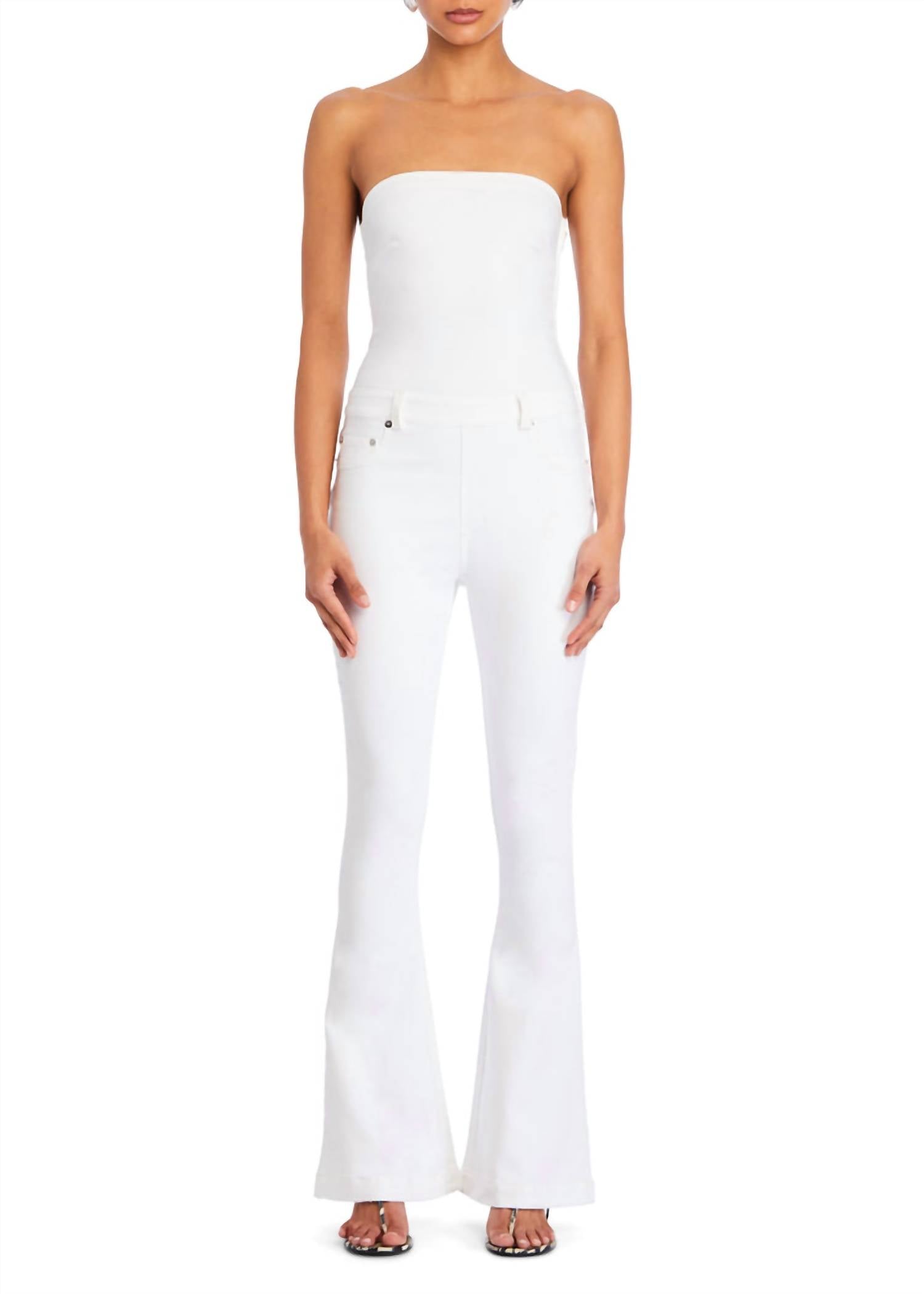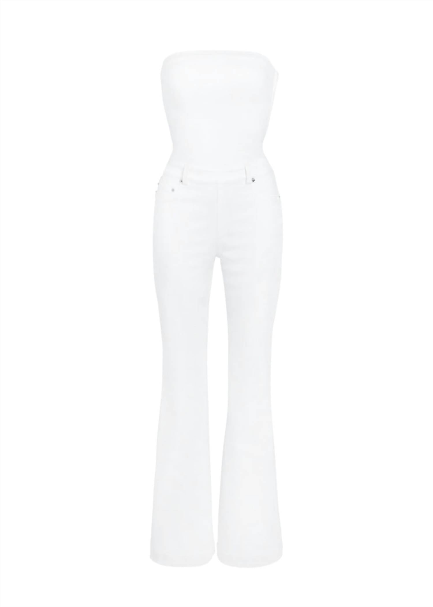 It doesn't take much for this one piece to look effortlessly cool. Add some statement jewelry to dress it up, or throw on some sneakers for a more casual vibe. Elevate your style with the Jeanette Stretch Denim Flare Jumpsuit by SER.O.YA, a chic addition to your spring wardrobe. This strapless jumpsuit, crafted from an 80% Cotton, 8% Polyester, and 2% Elastane blend, features a relaxed fit with flared legs in a high-rise silhouette, perfect for embracing the 90s fashion trend. Made in China, this solid white piece boasts a side zipper closure for a sleek finish and functional pockets for added practicality. Ideal for a holiday party or New Year's Eve celebration, this jumpsuit is worn by a model standing 5'10" in size S.