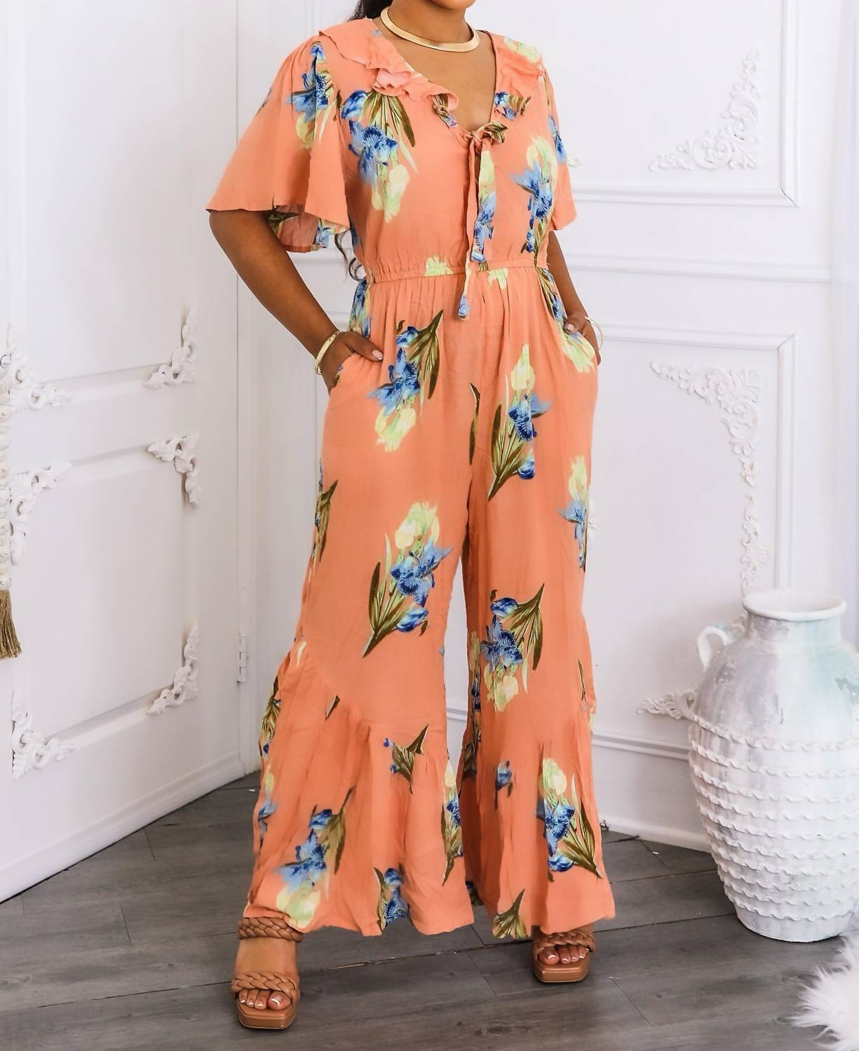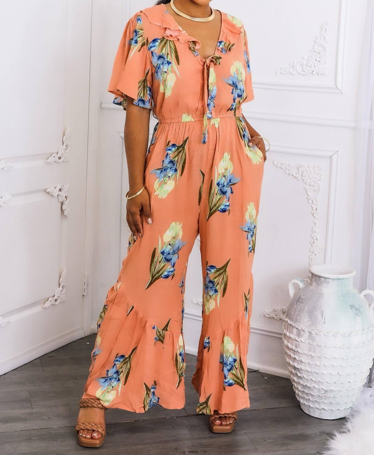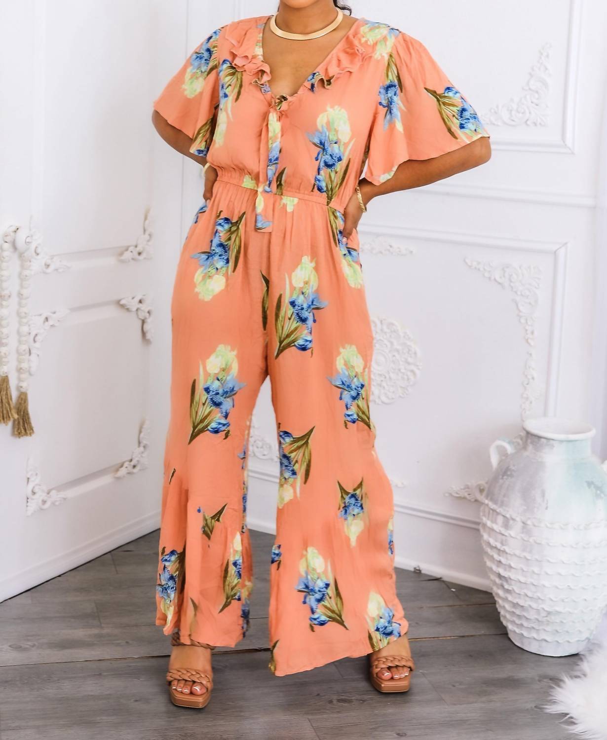 Throw it on and go! Embrace standout style with the SurelyMine Peach Floral Ruffle Jumpsuit, an ideal pick for sunny outings and vacation escapes. This women's jumpsuit features flutter sleeves and a soft ruffled neckline with a tie-front detail, making it both fresh and flattering. Crafted with a lightweight and breathable fabric, it boasts a relaxed flowy wide-leg silhouette complemented by tiered hem accents and a stretchy elastic mid-rise waist for ultimate comfort. Closure: Back keyhole button. Model wears a size small (5'4" height, 3 1/2 inch heels).