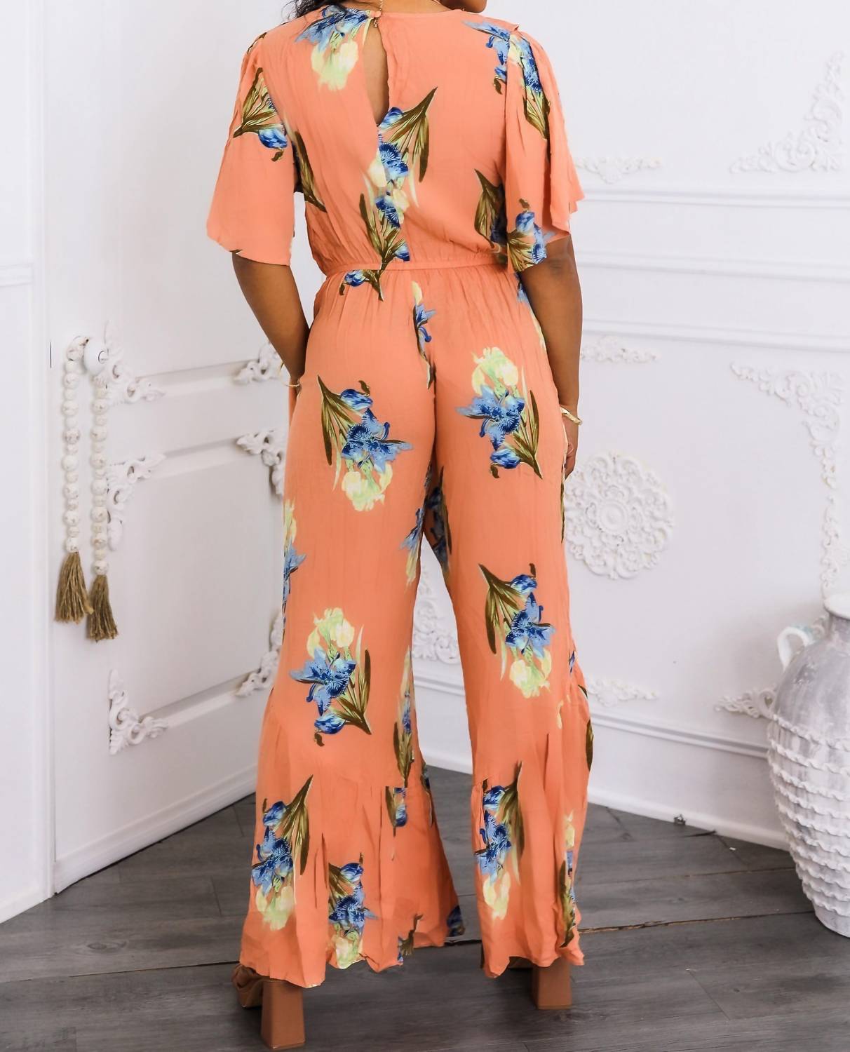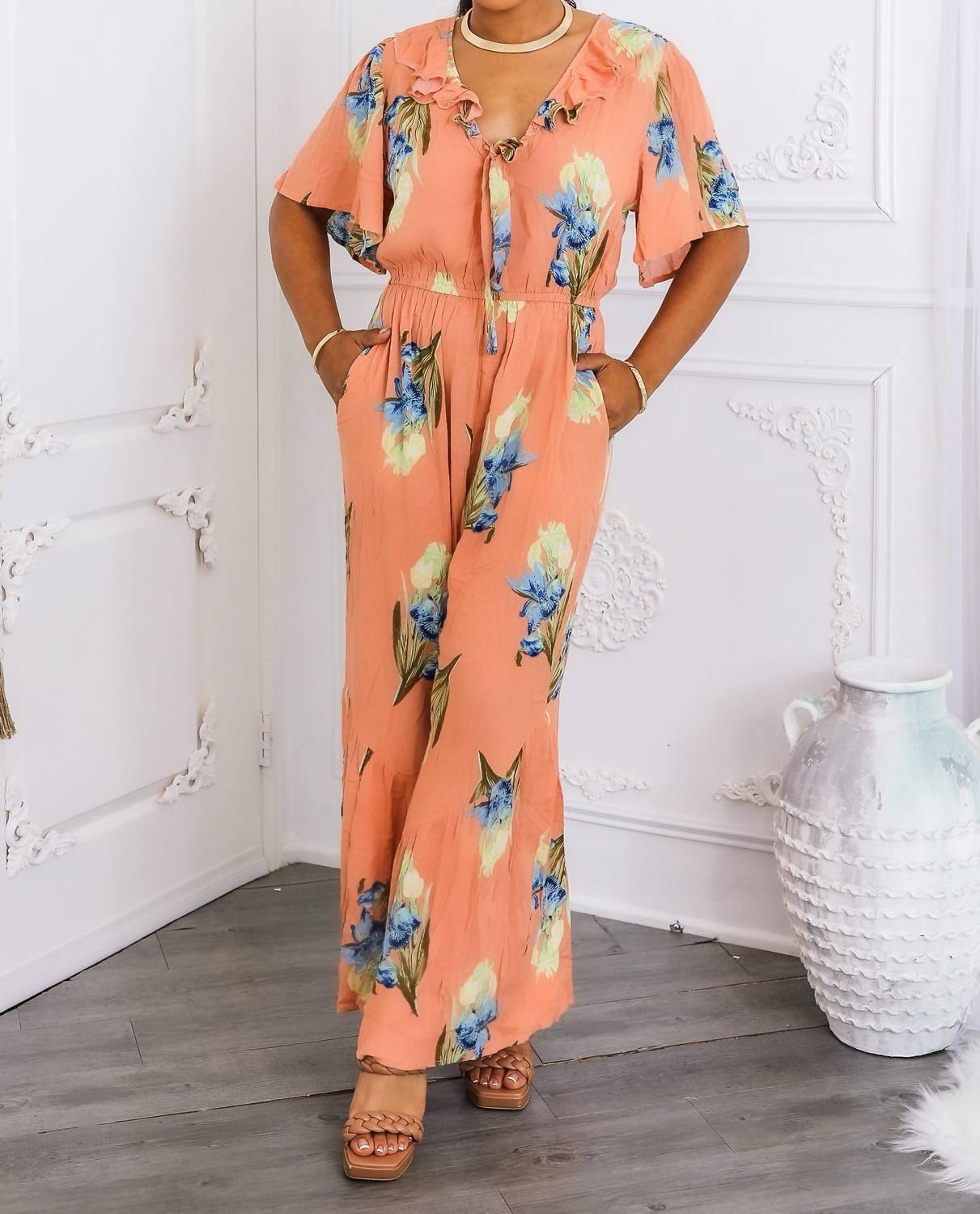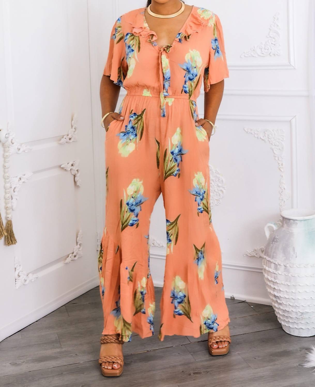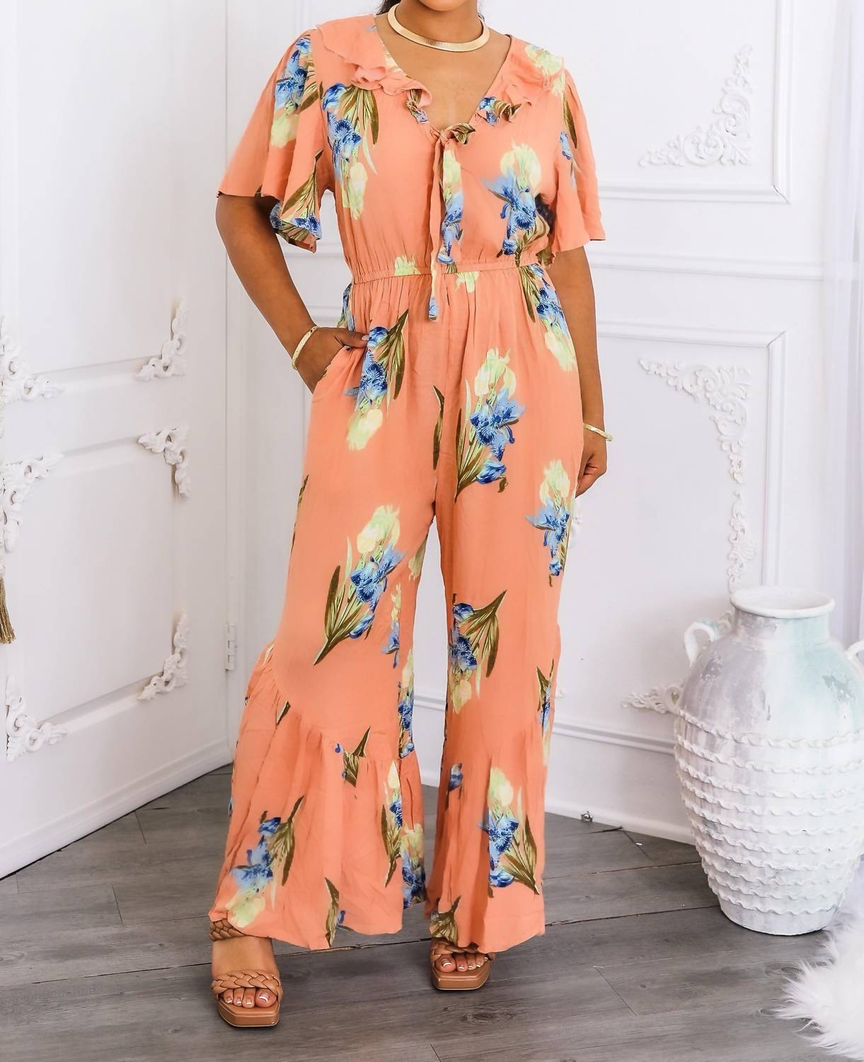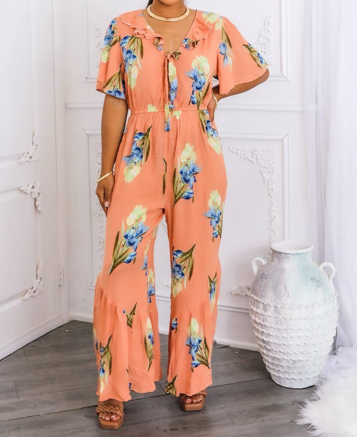 Surelymine - Peach Floral Ruffle Jumpsuit Wide-leg Summer One-piece