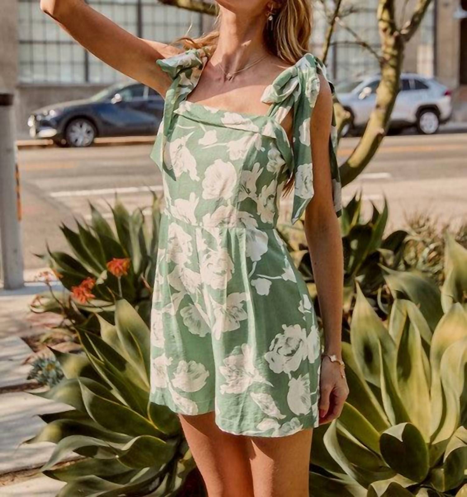 It doesn't take much for this one piece to look effortlessly cool. Add some statement jewelry to dress it up, or throw on some sneakers for a more casual vibe. Elevate your summer wardrobe with the Selina Floral Tie Strap Romper by So Me, a boho-chic staple perfect for any vacation. This charming romper showcases adjustable bow tie straps and a relaxed high-rise fit, featuring a green and white floral pattern. Made from a soft nylon blend, it is fully lined for added comfort and includes convenient side pockets. Its back zipper closure ensures easy wear, while hand washing maintains its vibrant look.