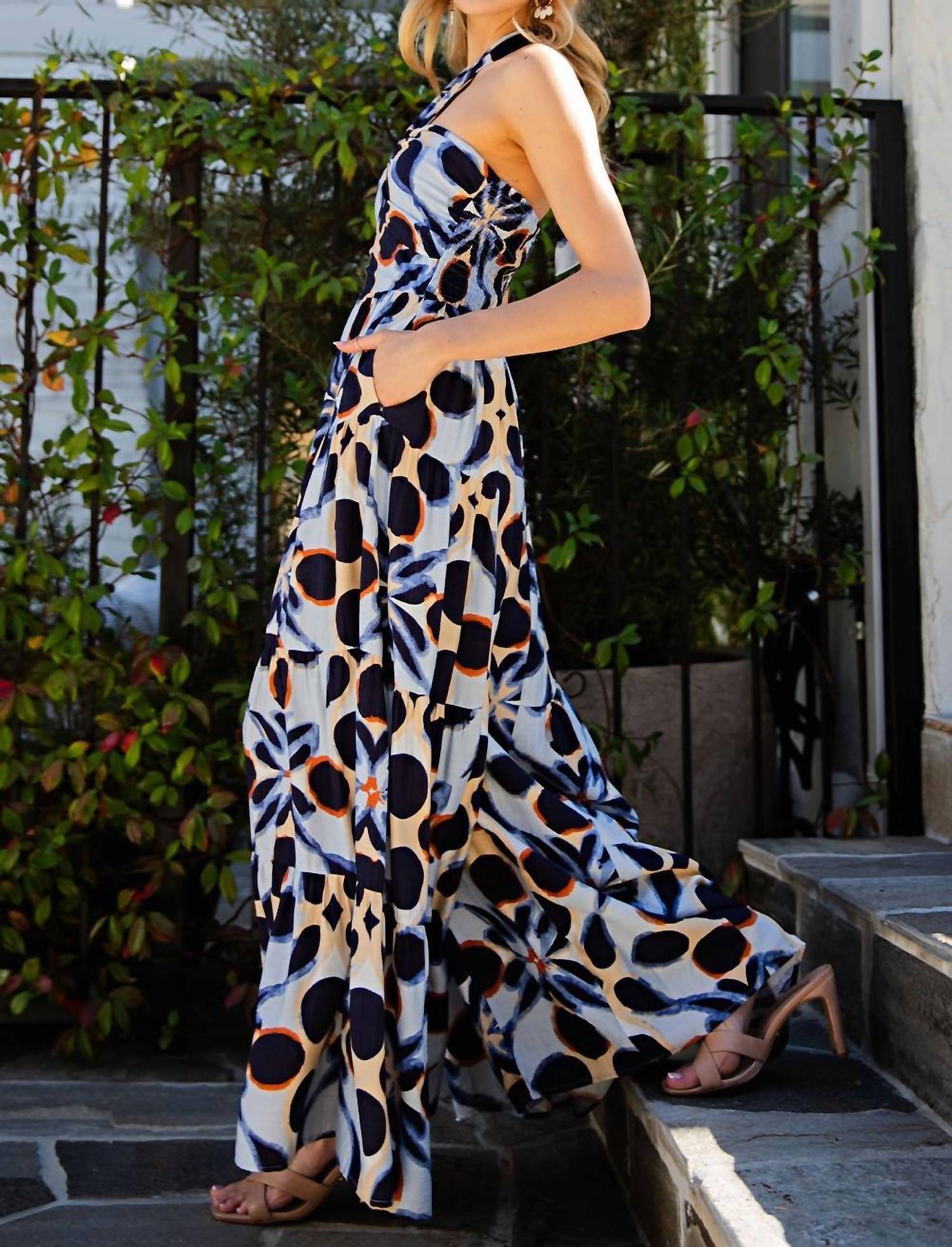 Throw it on and go! Elevate your summer wardrobe with the Bohemian Kaleidoscope Halter Jumpsuit by ee:some in a White Multi color. Featuring a tie closure and a captivating, symmetrical pattern of deep blues and burnt orange, this piece boasts a relaxed fit with a chic, halter neckline. Made from an 89% Viscose and 11% Nylon blend, the jumpsuit offers a comfortable wide-leg silhouette and convenient pockets. Embrace its high-rise waist for a bohemian flair, perfect for vacations or casual Y2K-inspired outings.