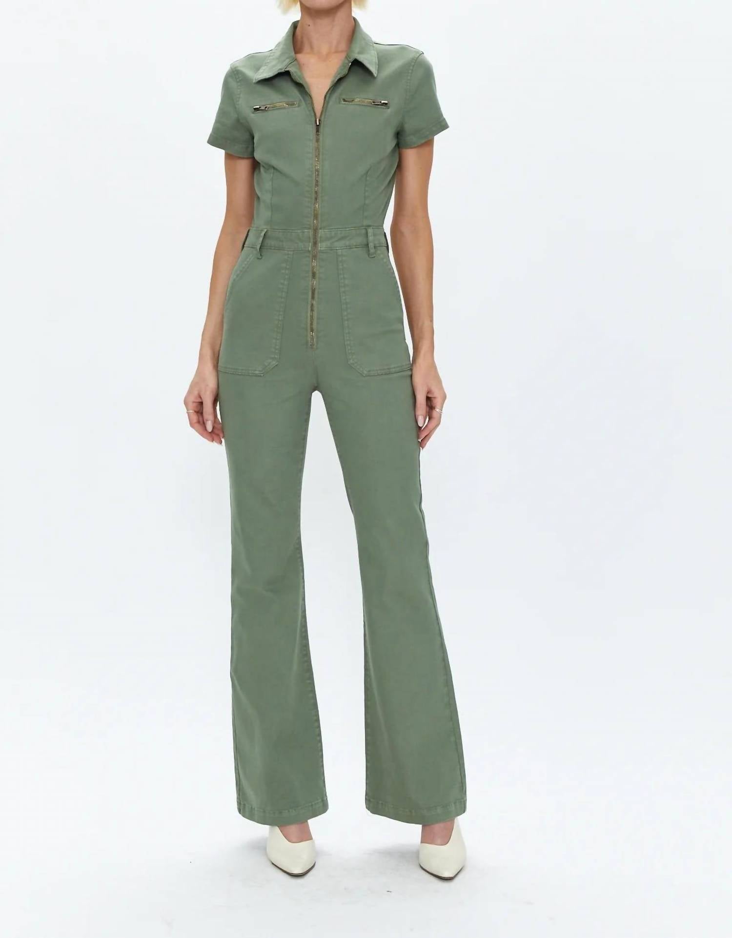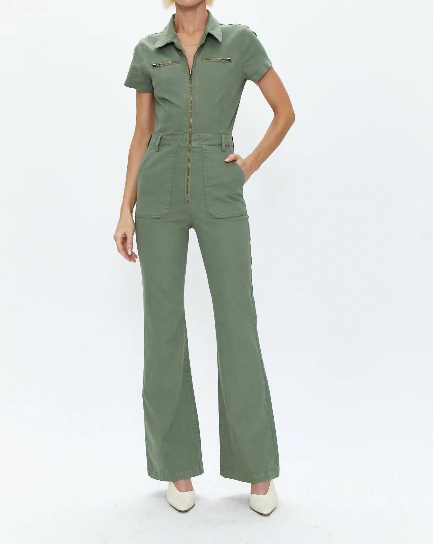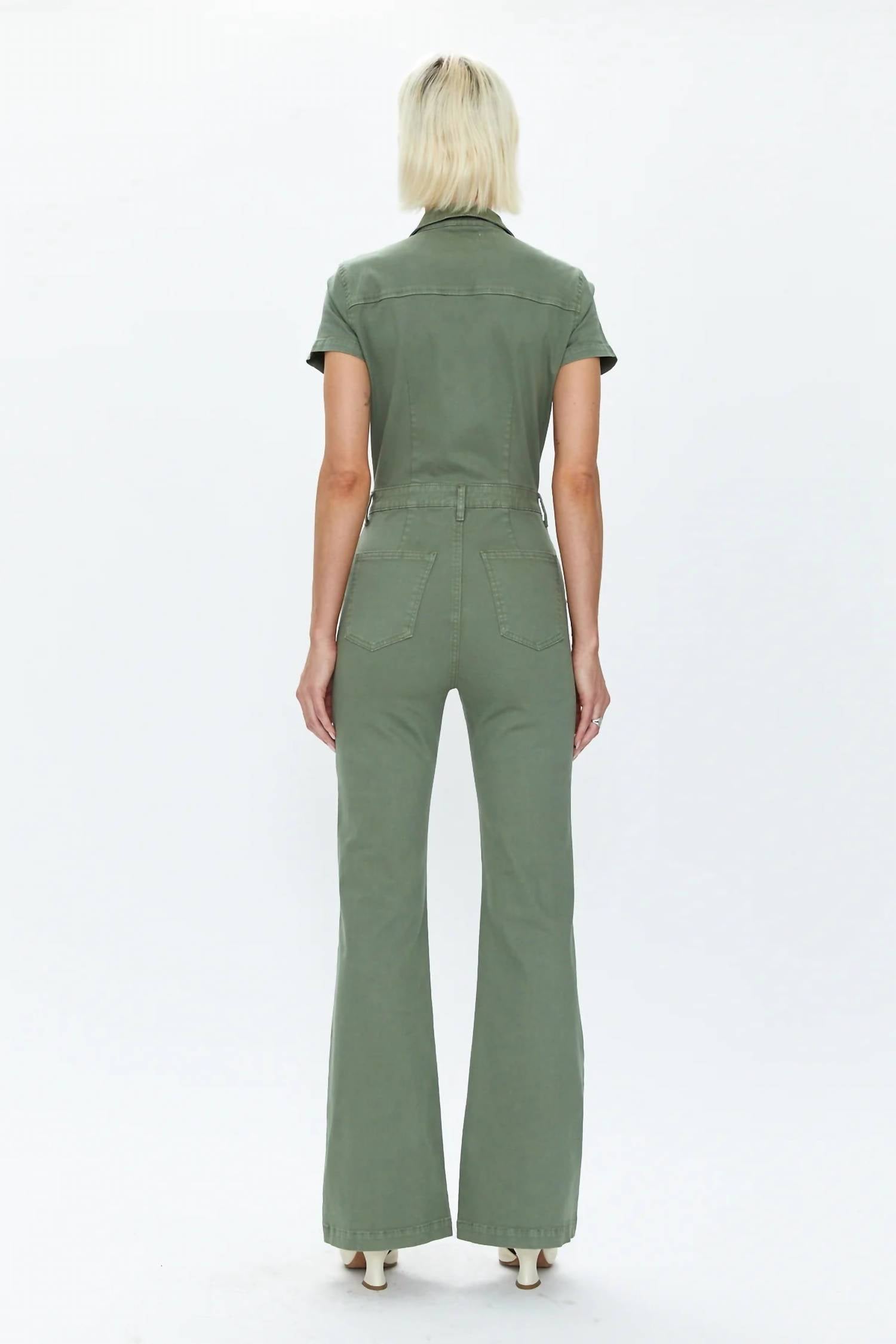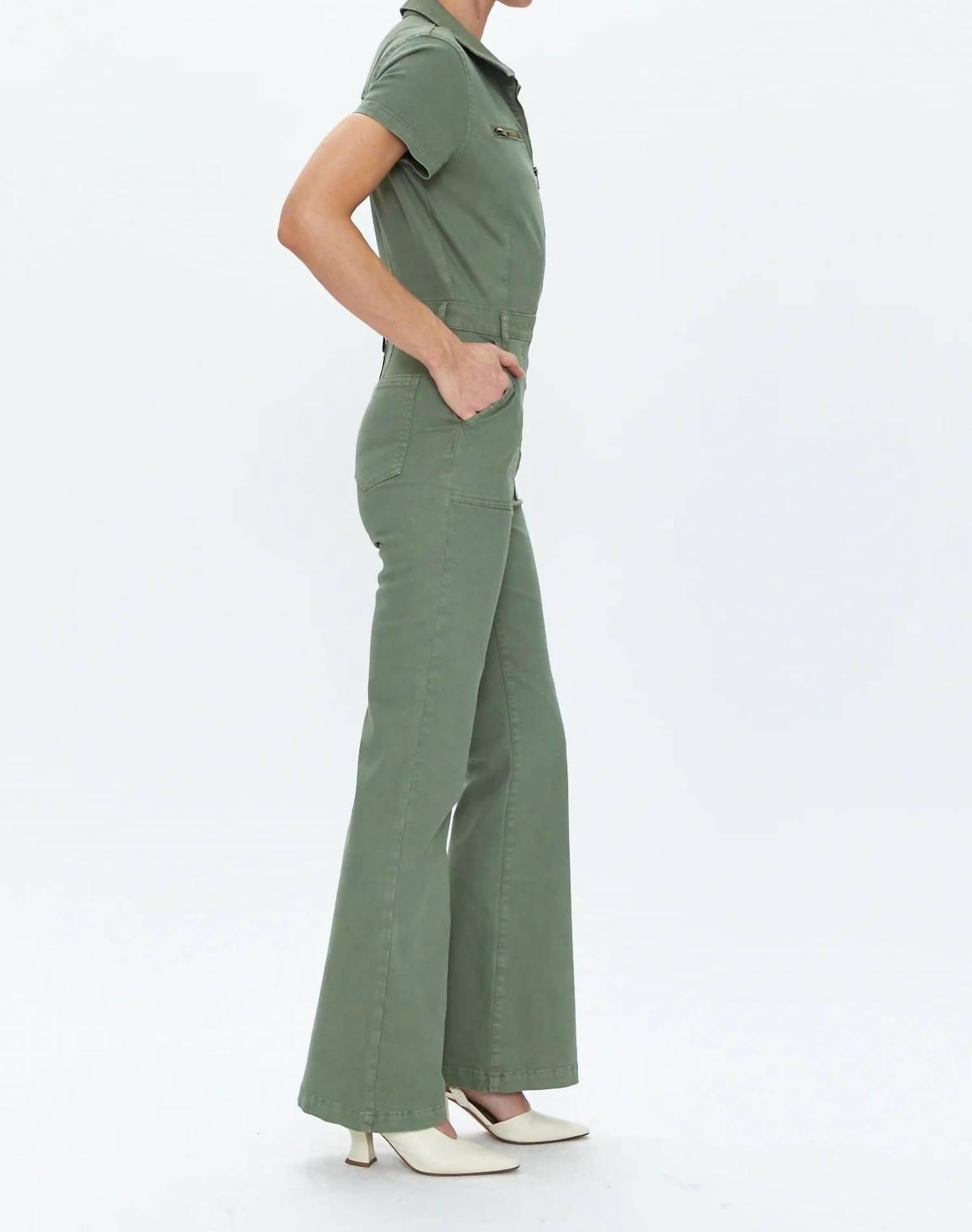 The perfect outfit choice when you you need something quick to throw on and still want to look efforlessly cool. The Martina Short Sleeve Flare Jumpsuit in Colonel by PISTOLA is an elegant piece perfect for your wardrobe. It features a waist-defining silhouette with a comfortable stretch fabric made of 98% Cotton and 2% Spandex, offering just a touch of give. This solid, imported jumpsuit with a zip closure and convenient side pockets is designed with a wide-leg bootcut that enhances your proportions. Ideal for a holiday party, it runs slightly small, so consider sizing up for a roomier fit.